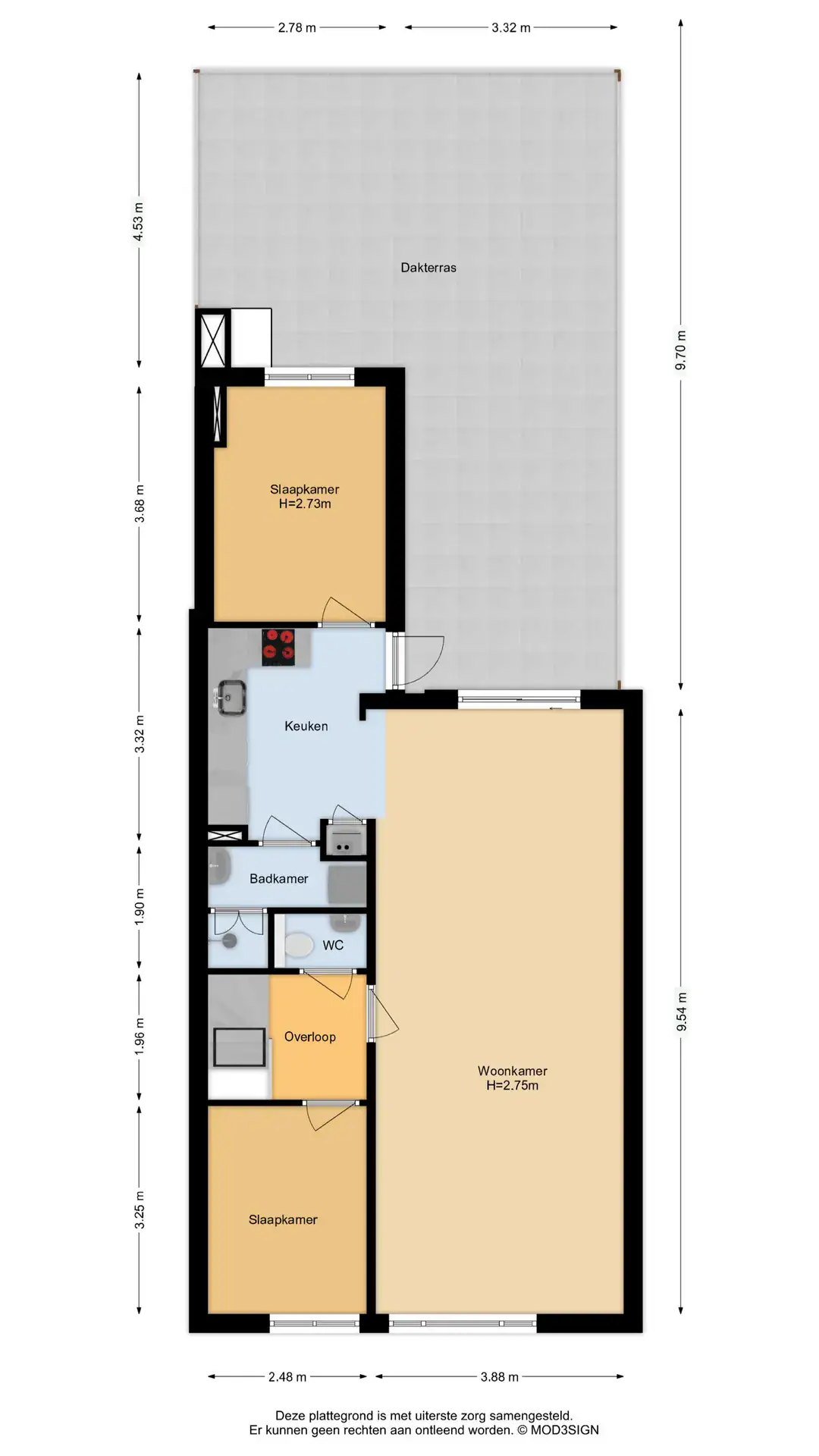 Landing with intercom and separate toilet with small sink. Bedroom at the front. Spacious, bright living room with sliding doors to the sunny rooftop terrace. Open kitchen with built-in appliances, including a dishwasher, gas stove, combination oven, refrigerator, and freezer. Bathroom with shower, sink, and washer/dryer setup. Second bedroom at the rear. The large rooftop terrace is accessible from both the living room and the kitchen.