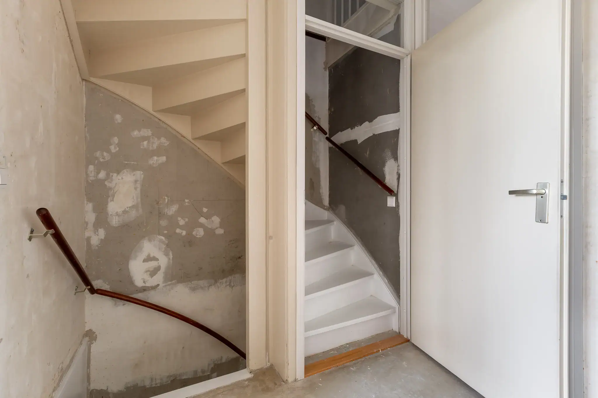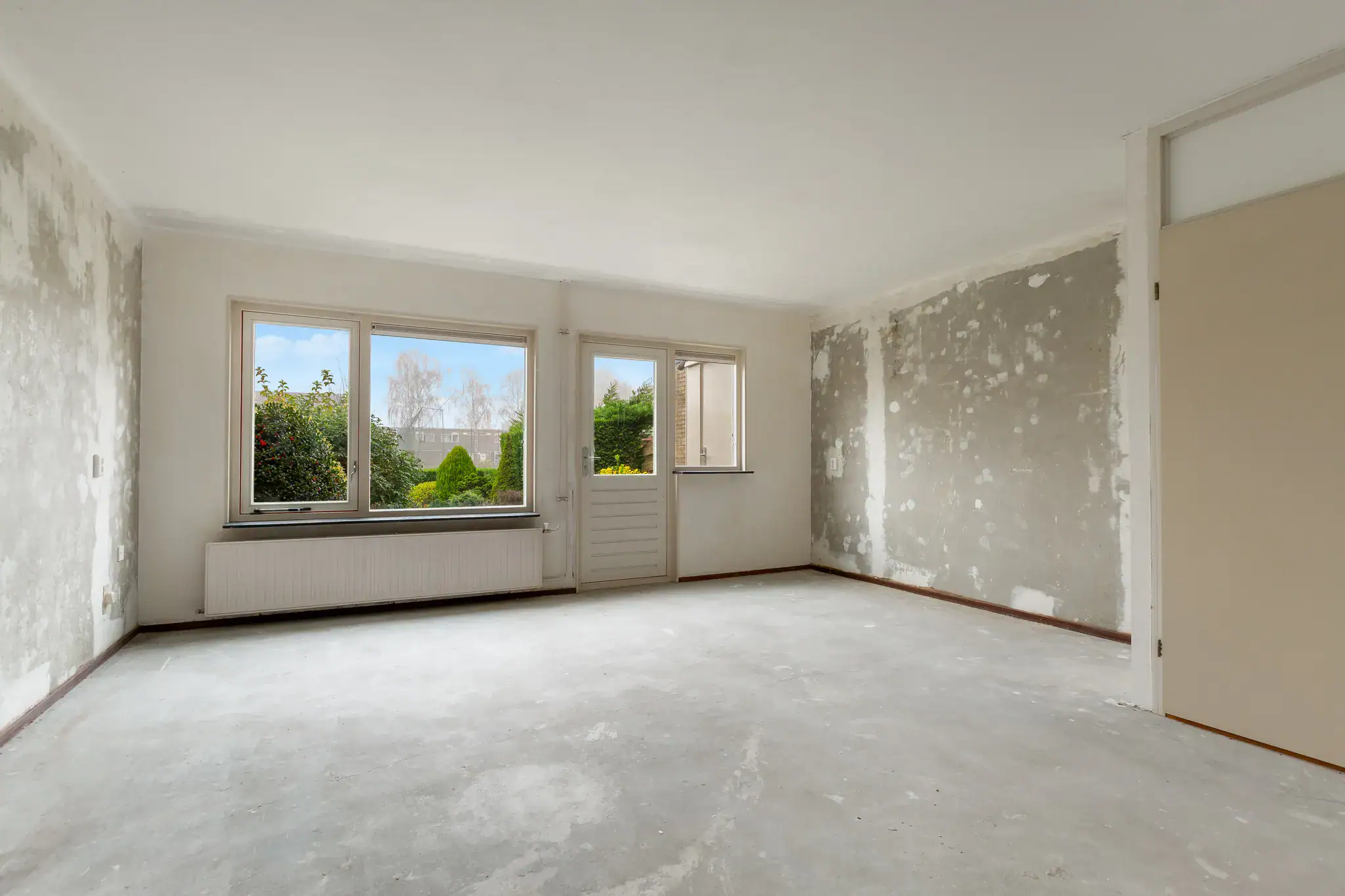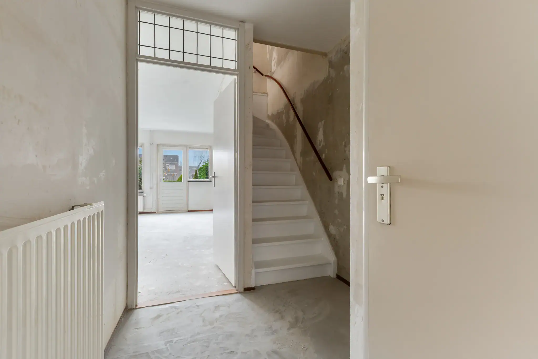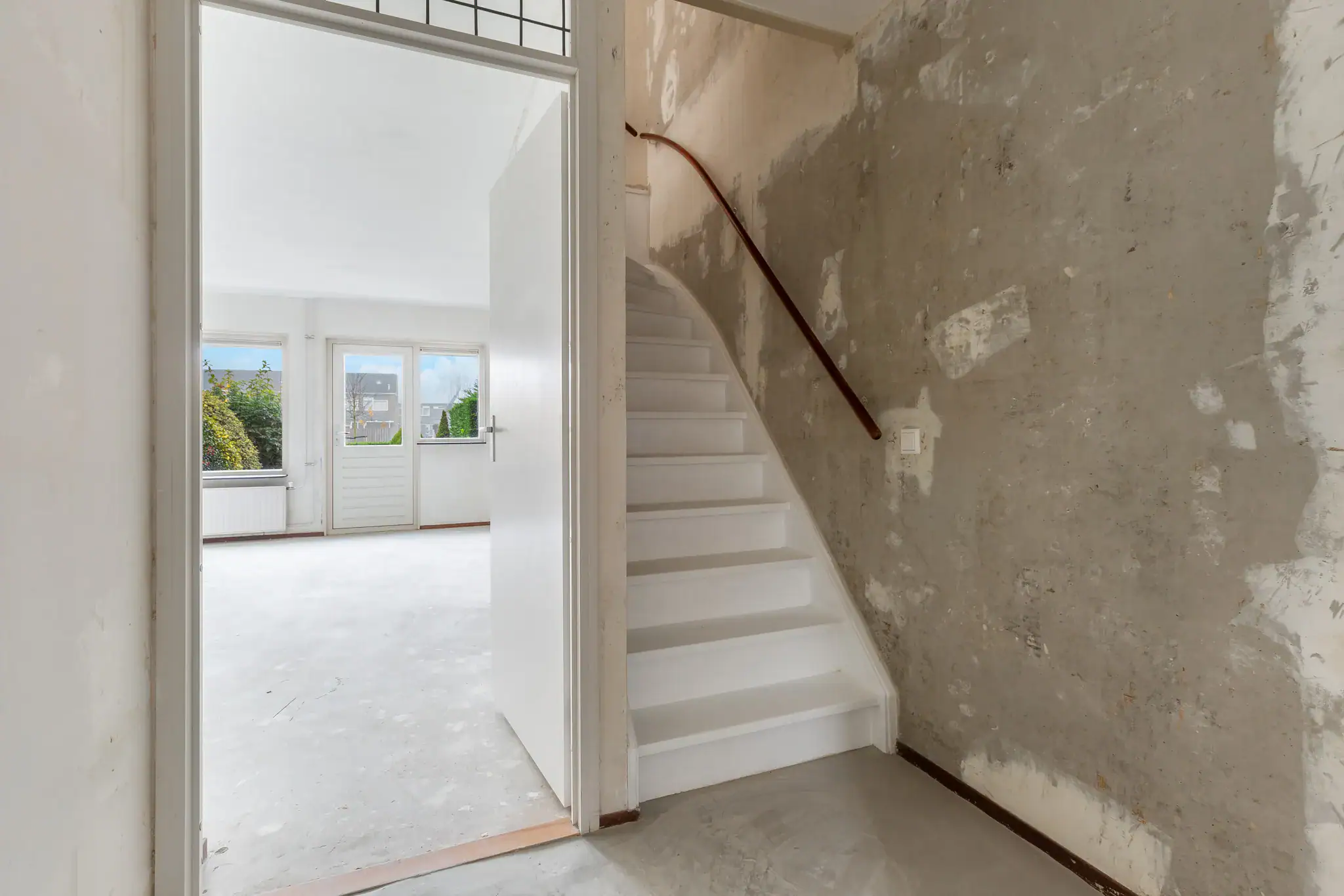 De woonkamer is een praktische en goed ingedeelde ruimte waar veel licht binnenvalt dankzij de grote raampartijen. Onder de trap bevindt zich een interne bergruimte, ideaal voor het opbergen van schoonmaakspullen of andere benodigdheden. De halfopen keuken dient nog geplaatst te worden.