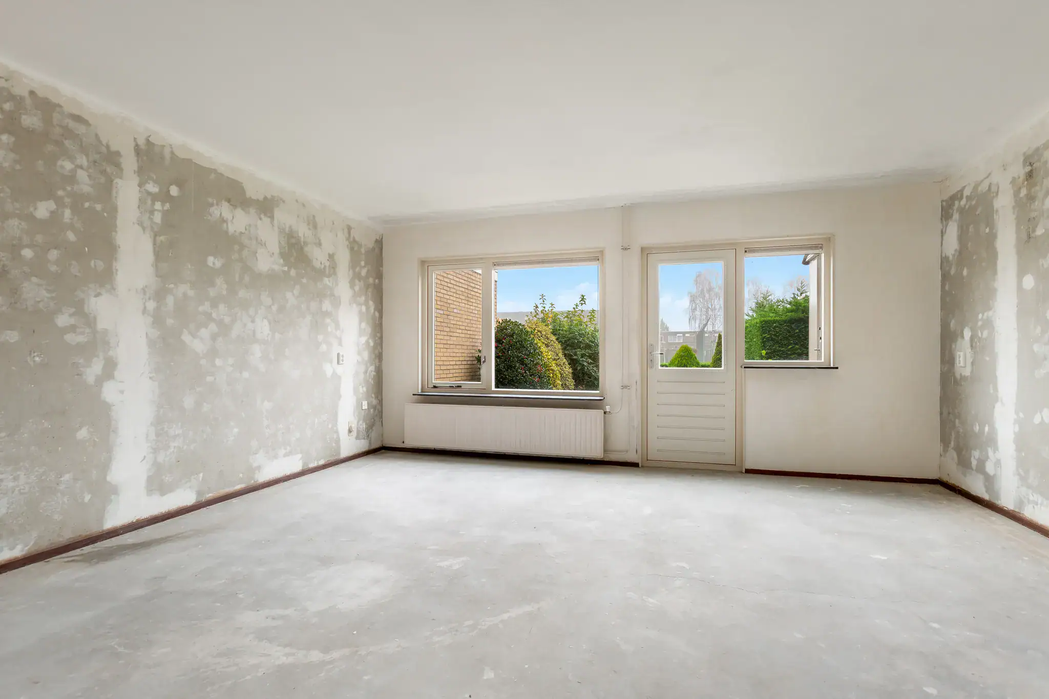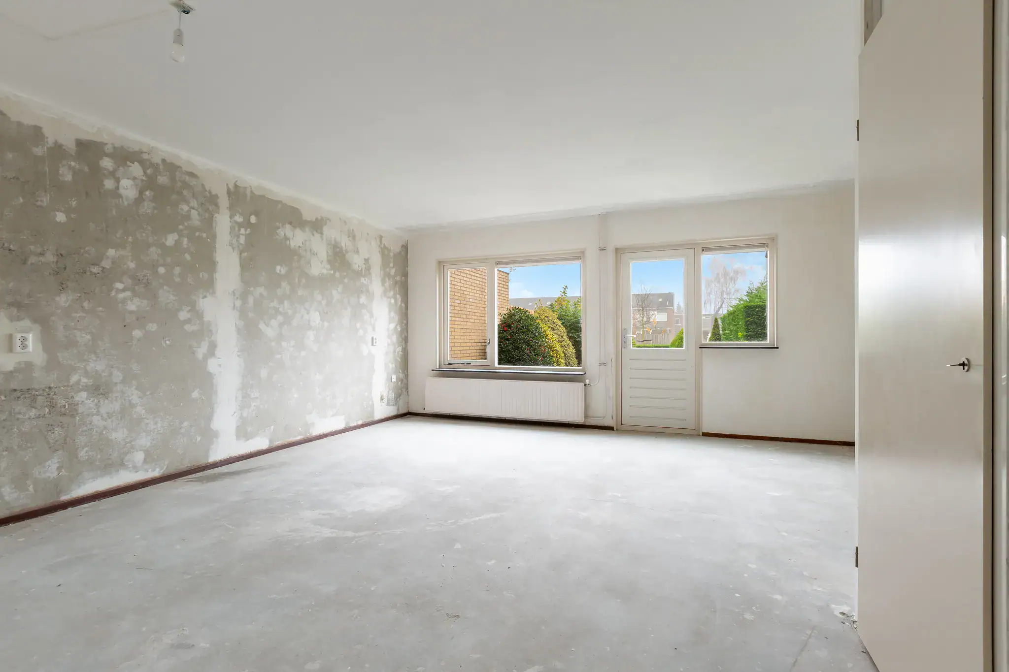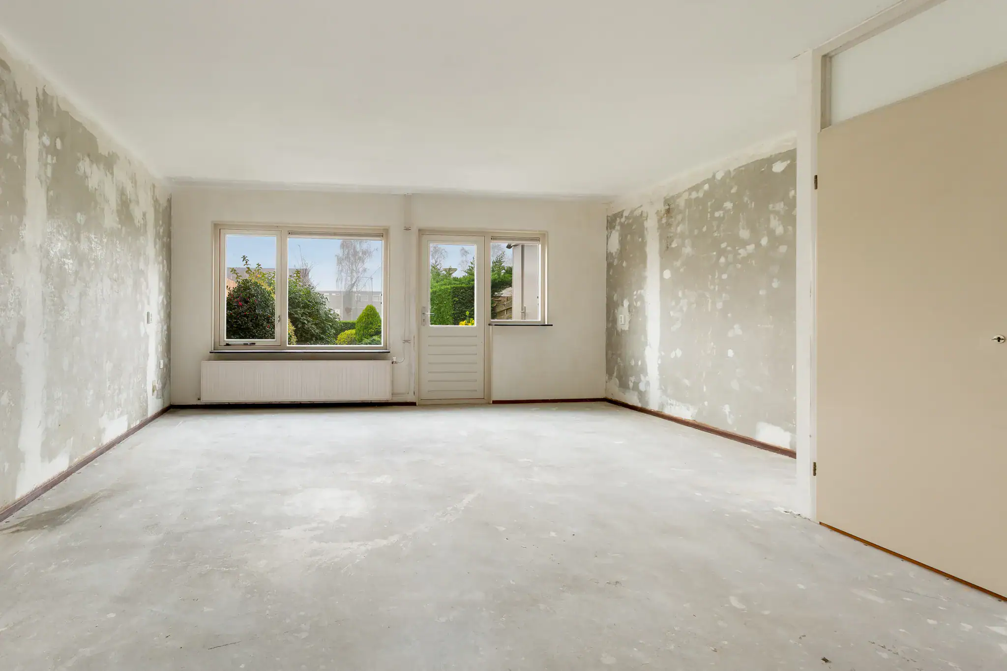 De woonkamer is een praktische en goed ingedeelde ruimte waar veel licht binnenvalt dankzij de grote raampartijen. Onder de trap bevindt zich een interne bergruimte, ideaal voor het opbergen van schoonmaakspullen of andere benodigdheden. De halfopen keuken dient nog geplaatst te worden.