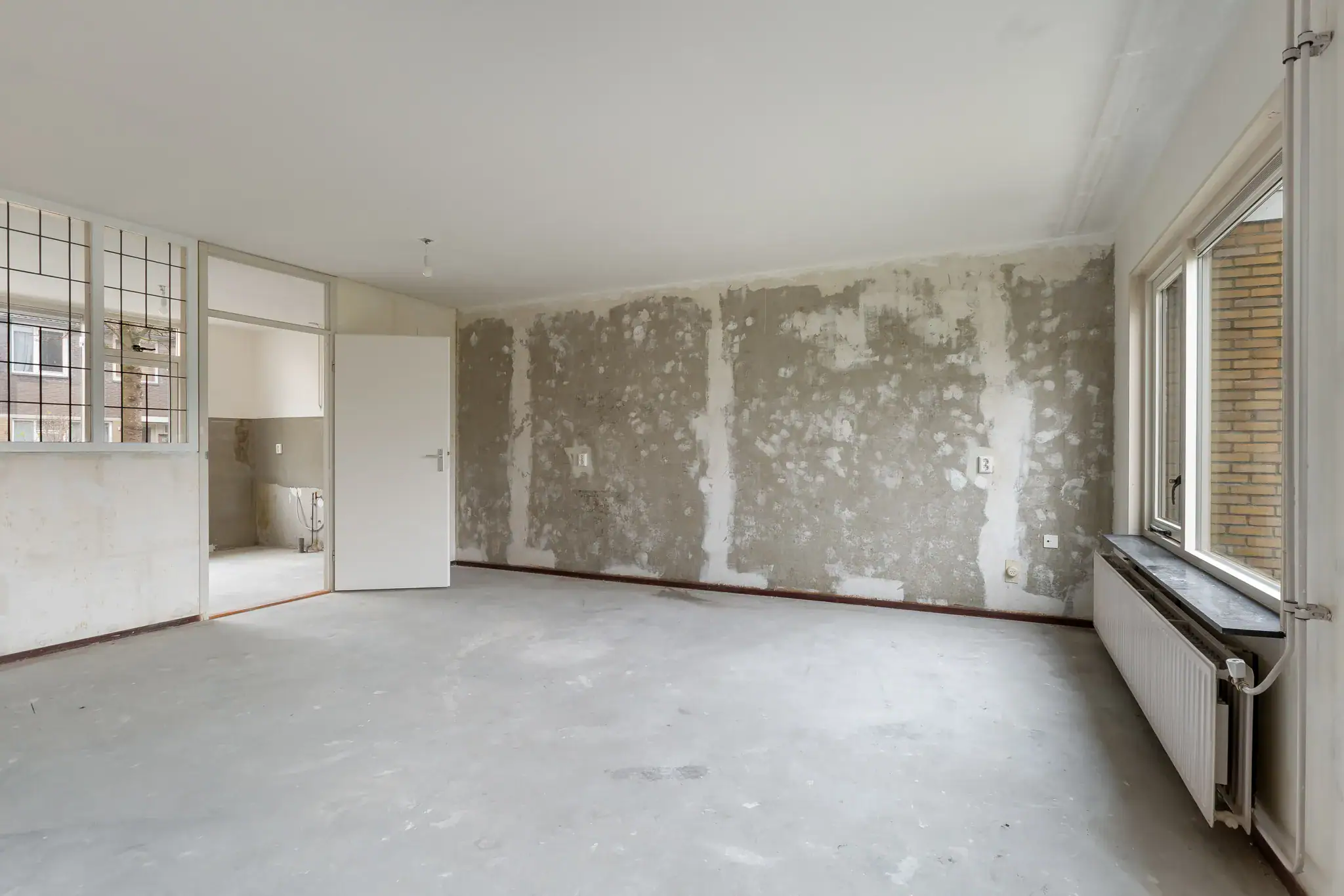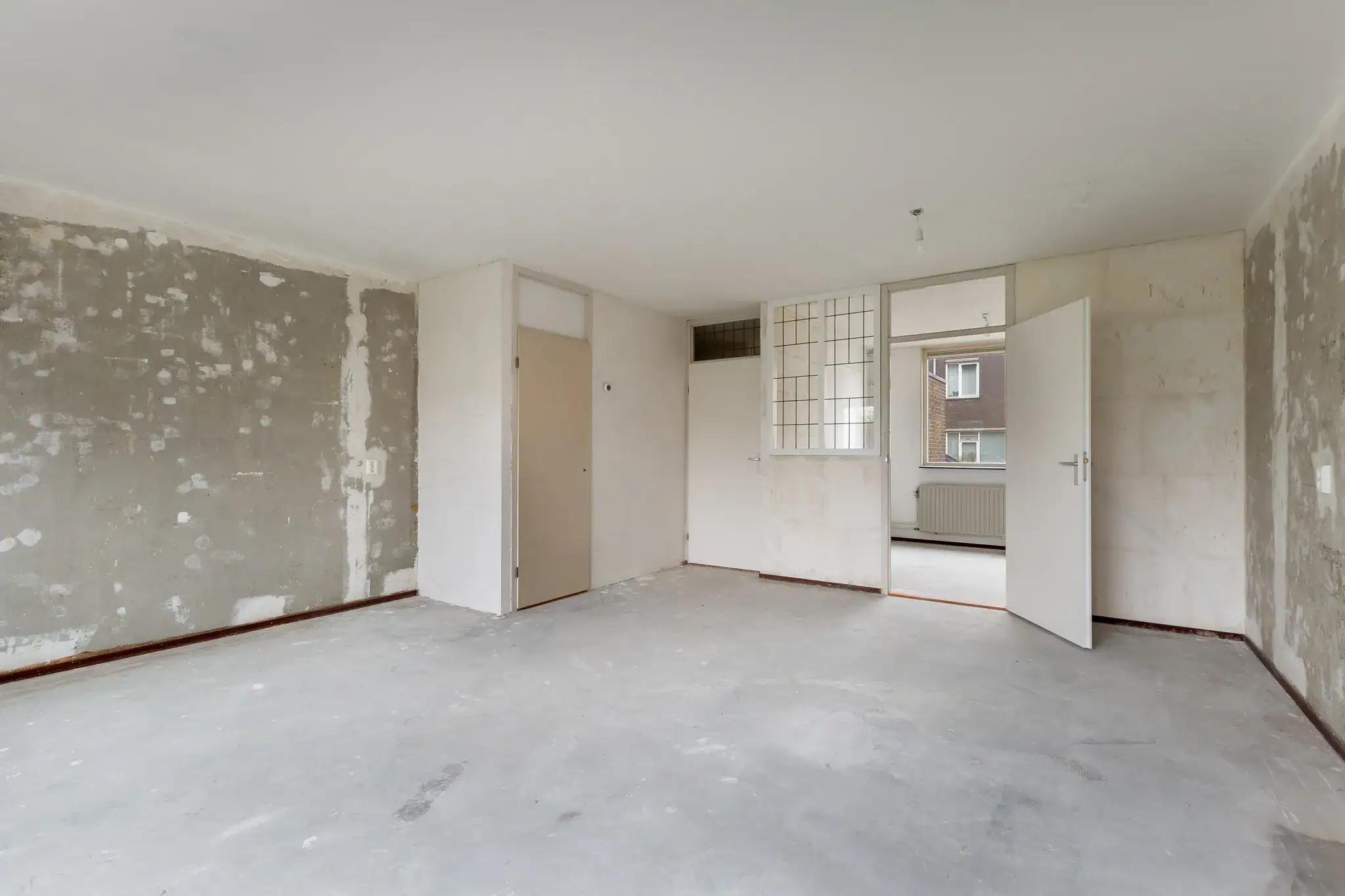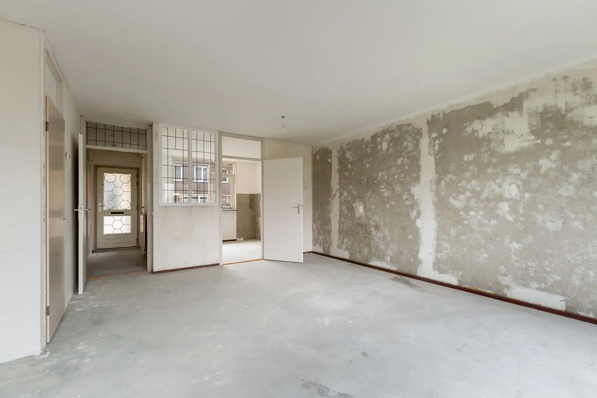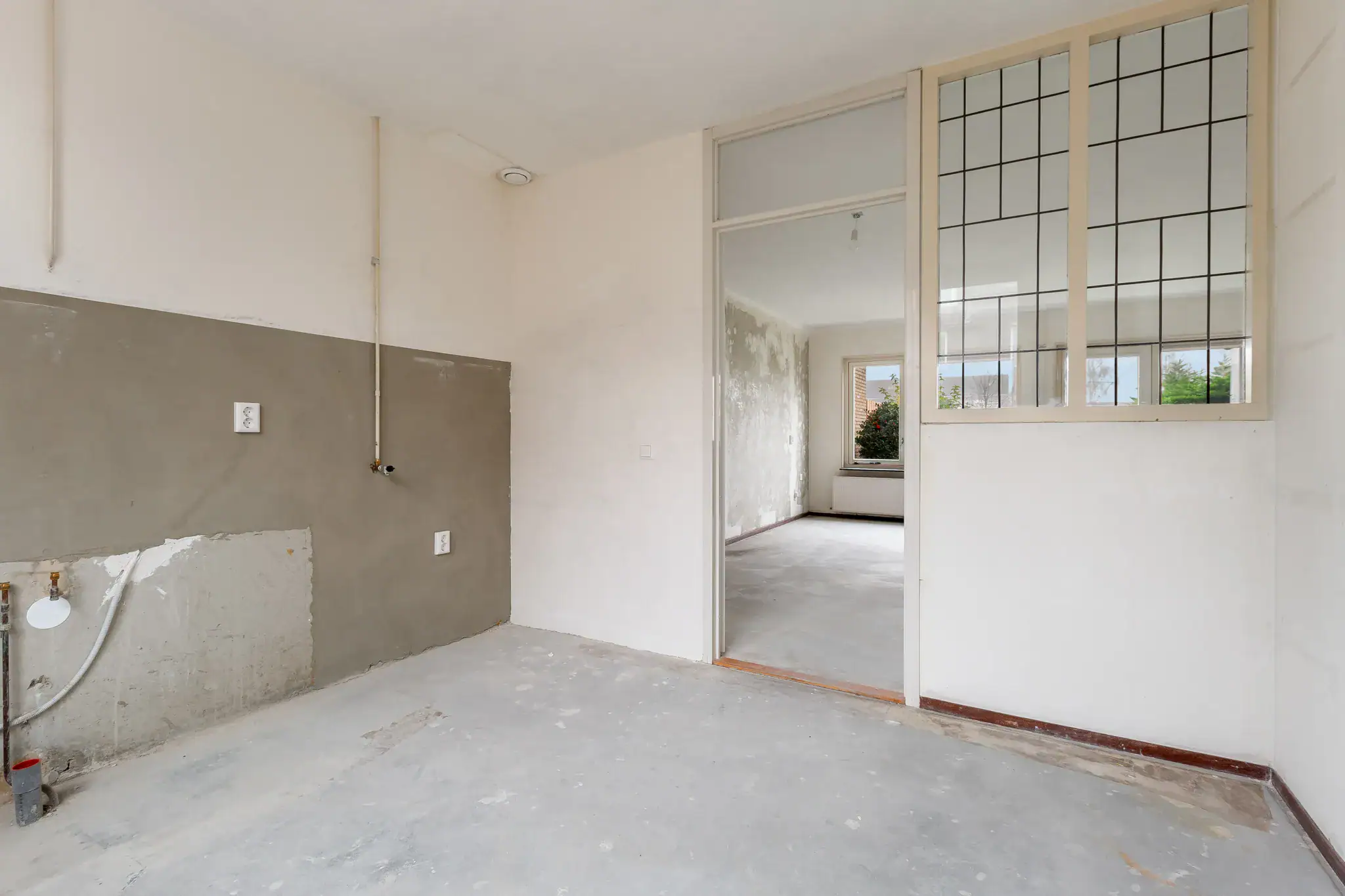 De woonkamer is een praktische en goed ingedeelde ruimte waar veel licht binnenvalt dankzij de grote raampartijen. Onder de trap bevindt zich een interne bergruimte, ideaal voor het opbergen van schoonmaakspullen of andere benodigdheden. De halfopen keuken dient nog geplaatst te worden.