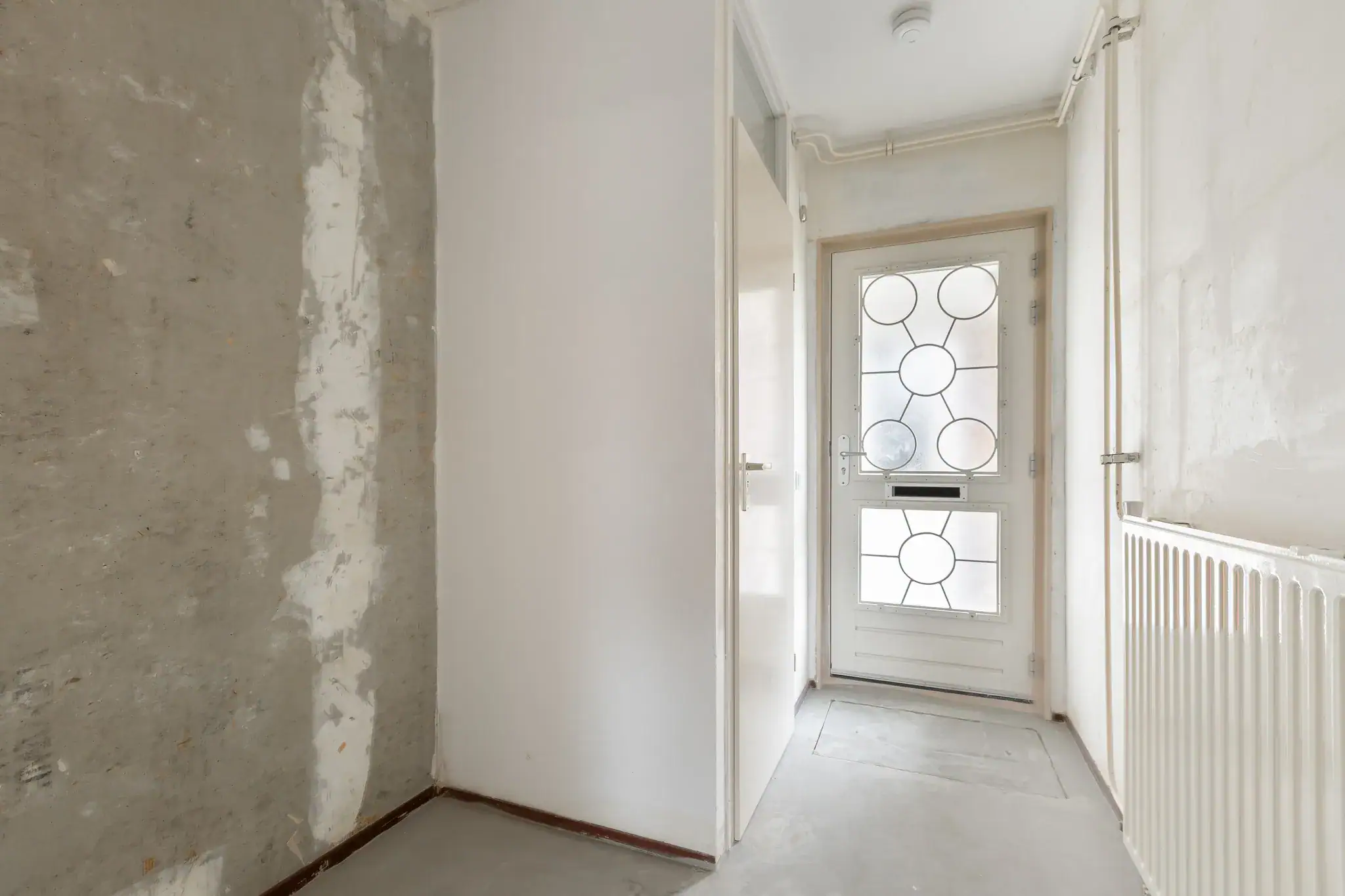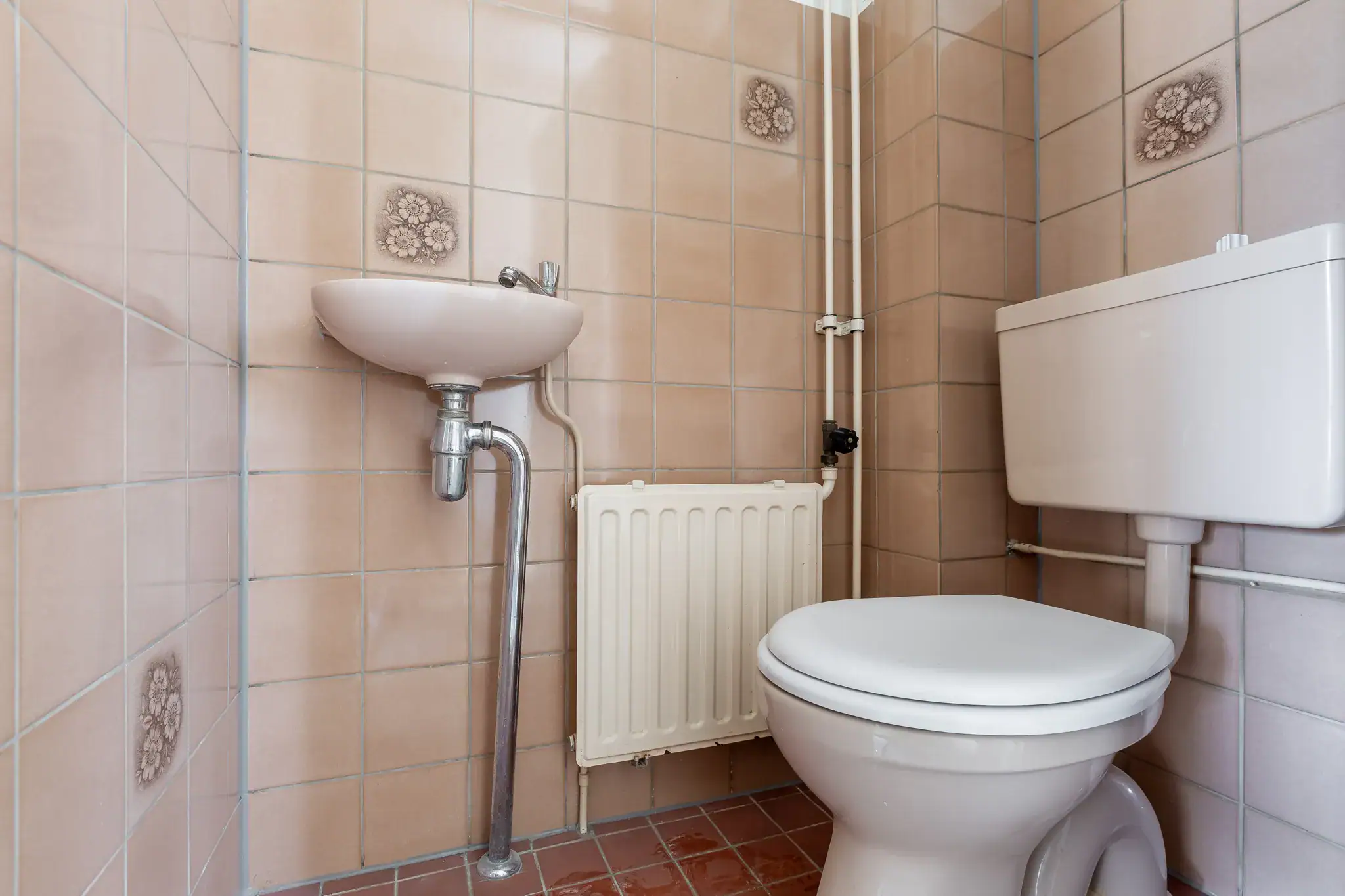 Na binnenkomst kom je in de hal. Direct rechts is een separaat toilet gesitueerd. Vanuit de hal heb je toegang tot de woonkamer met half open keuken en de trap naar de eerste verdieping.