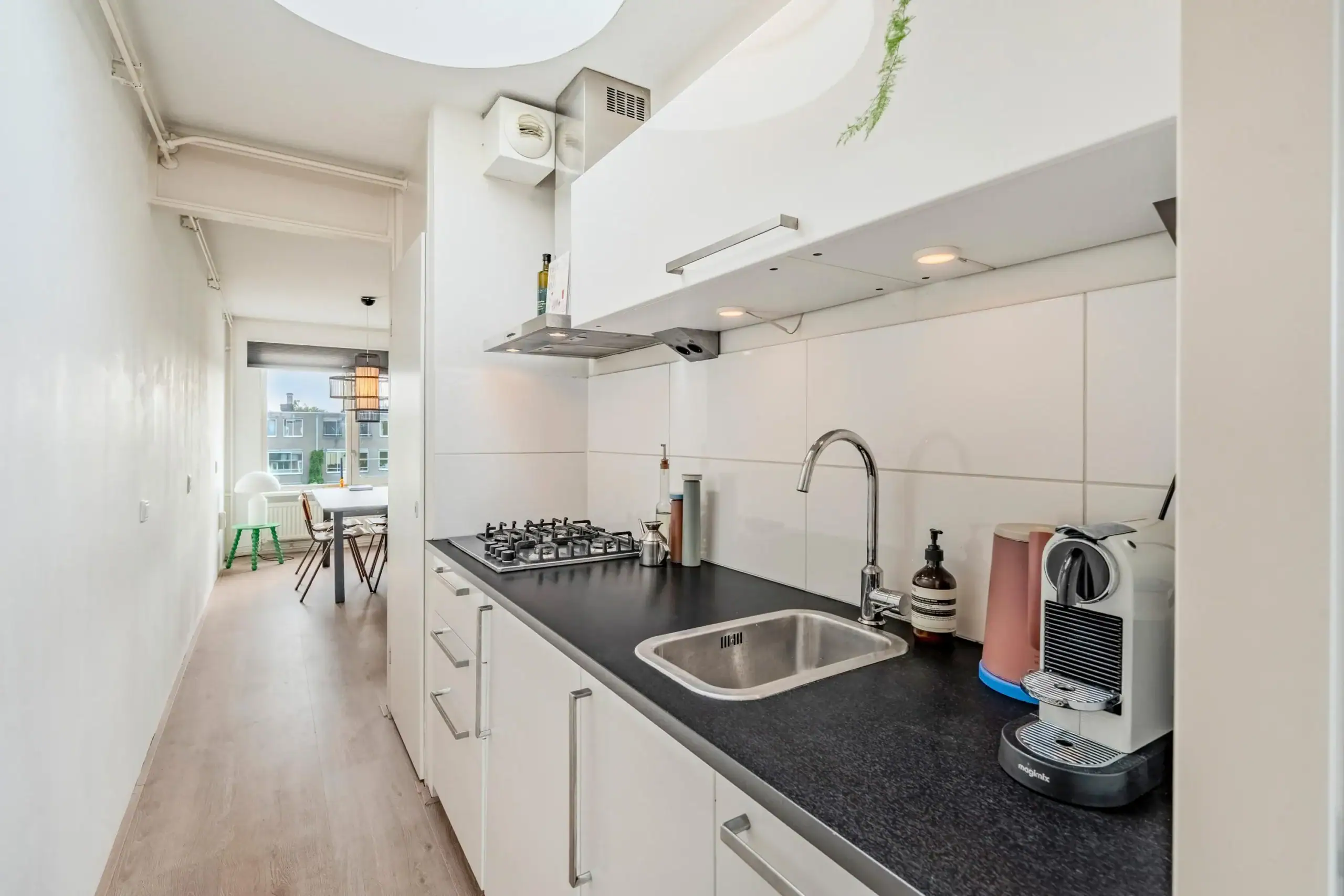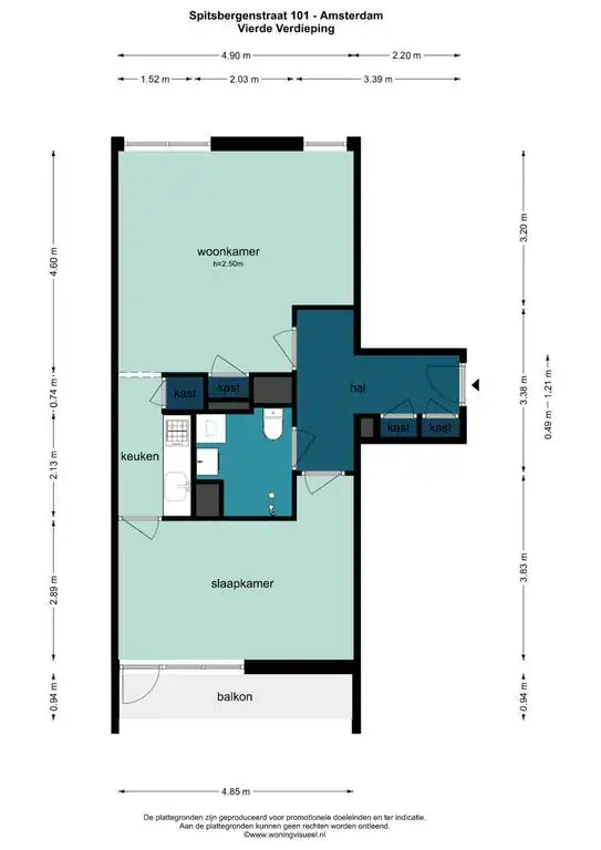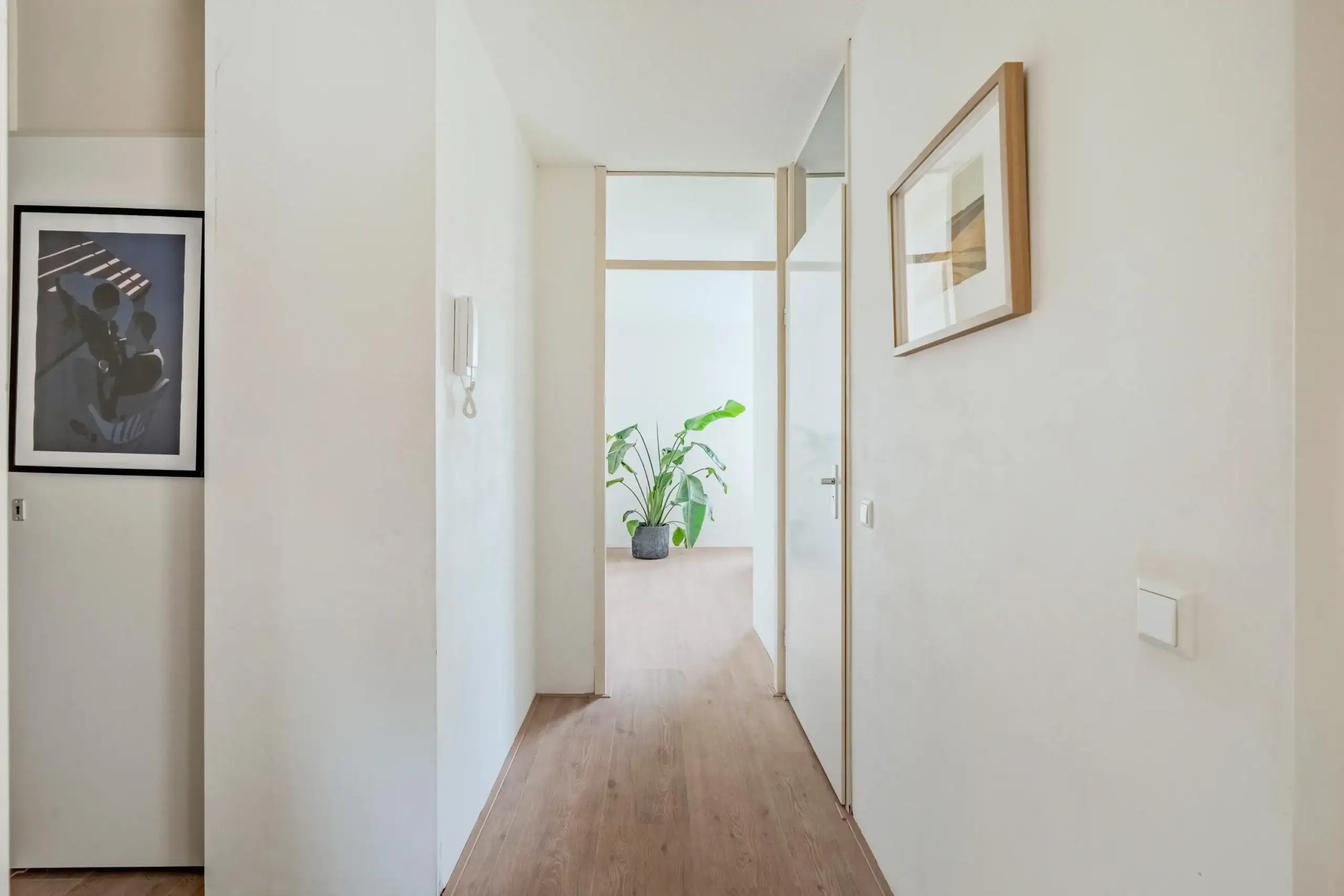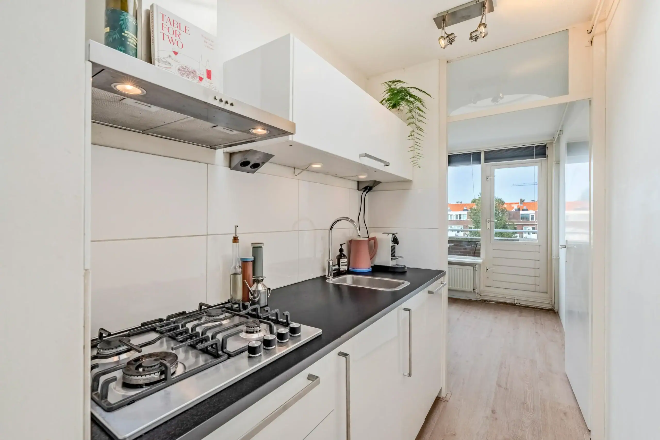 Via het gemeenschappelijk trappenhuis bereikt u de voordeur op de vierde verdieping. Bij binnenkomst treft u twee bergkasten en een hal die toegang biedt tot de diverse vertrekken. De woonkamer is ruim en licht en beschikt over een ruime bergkast. Vanuit de woonkamer bereikt u de halfopen keuken, waar alle benodigde apparatuur aanwezig is. Boven de keuken zorgt een fraai daklicht voor extra lichtinval.