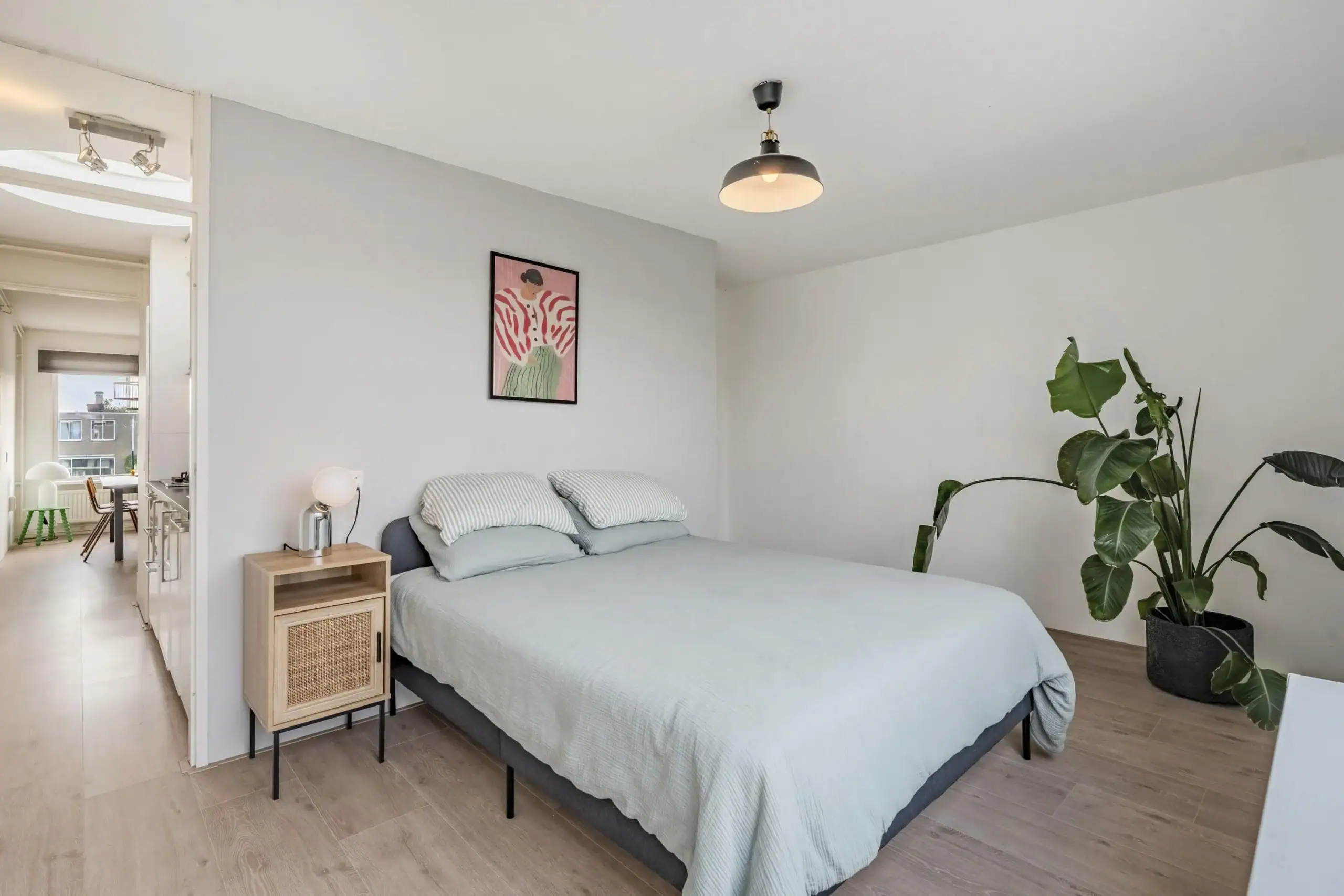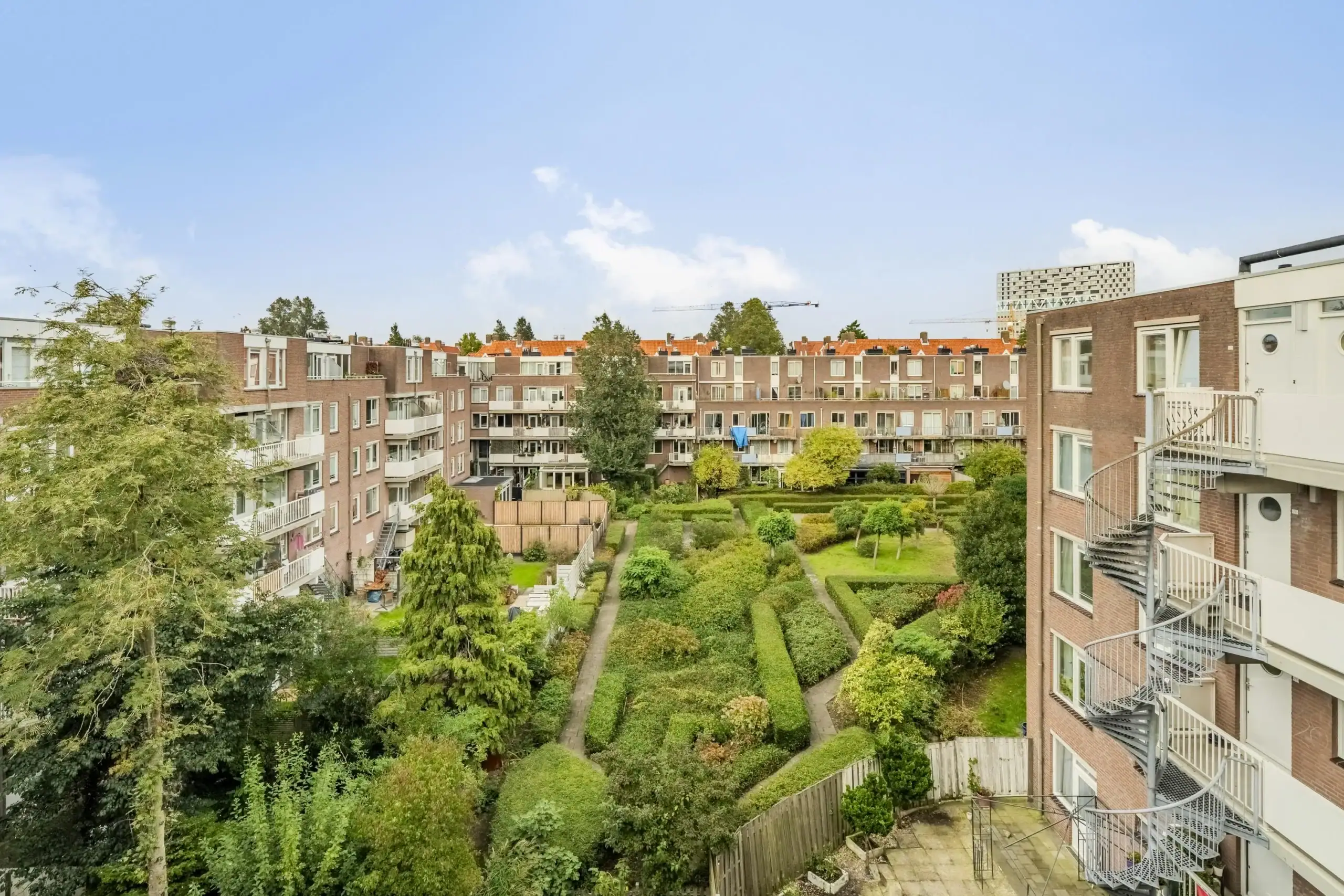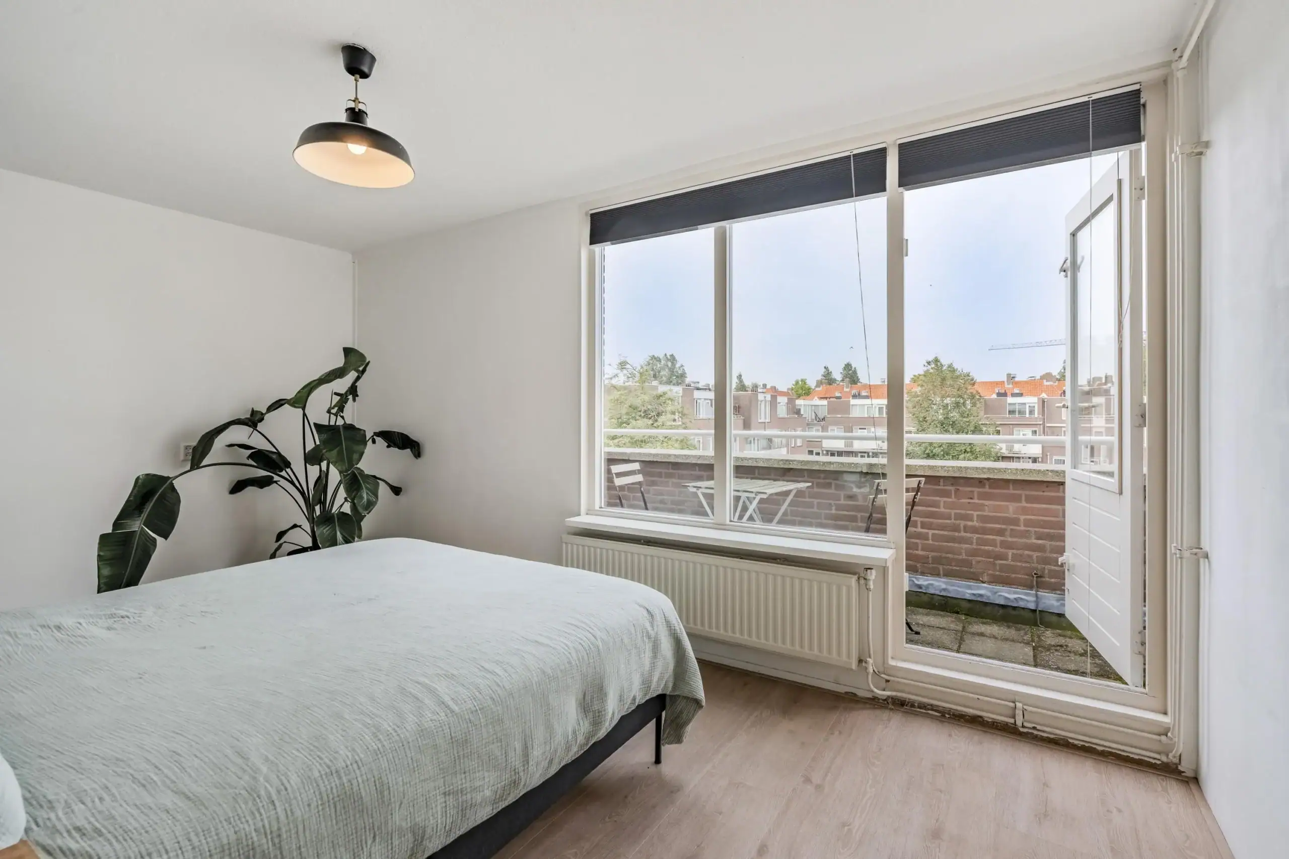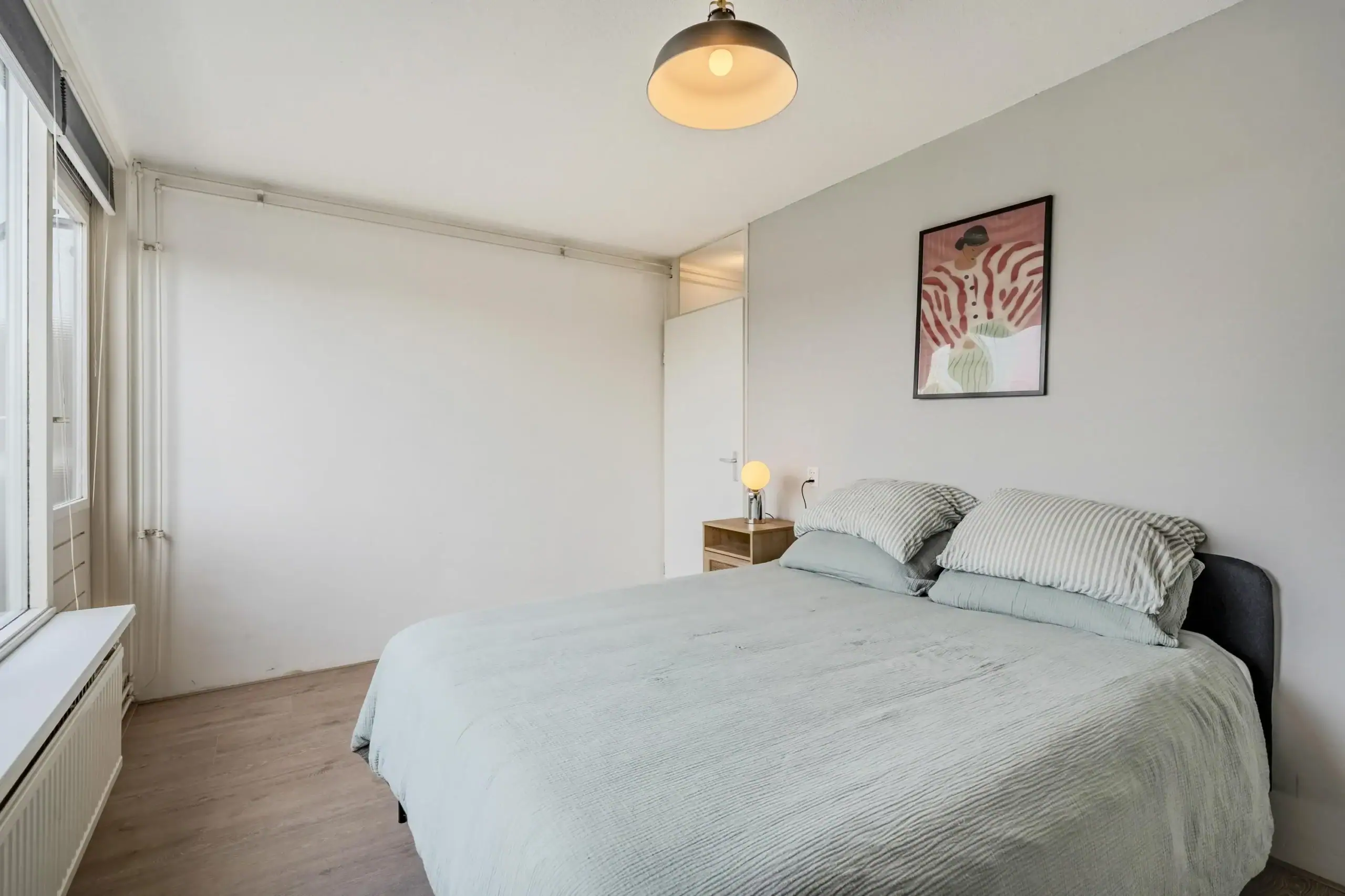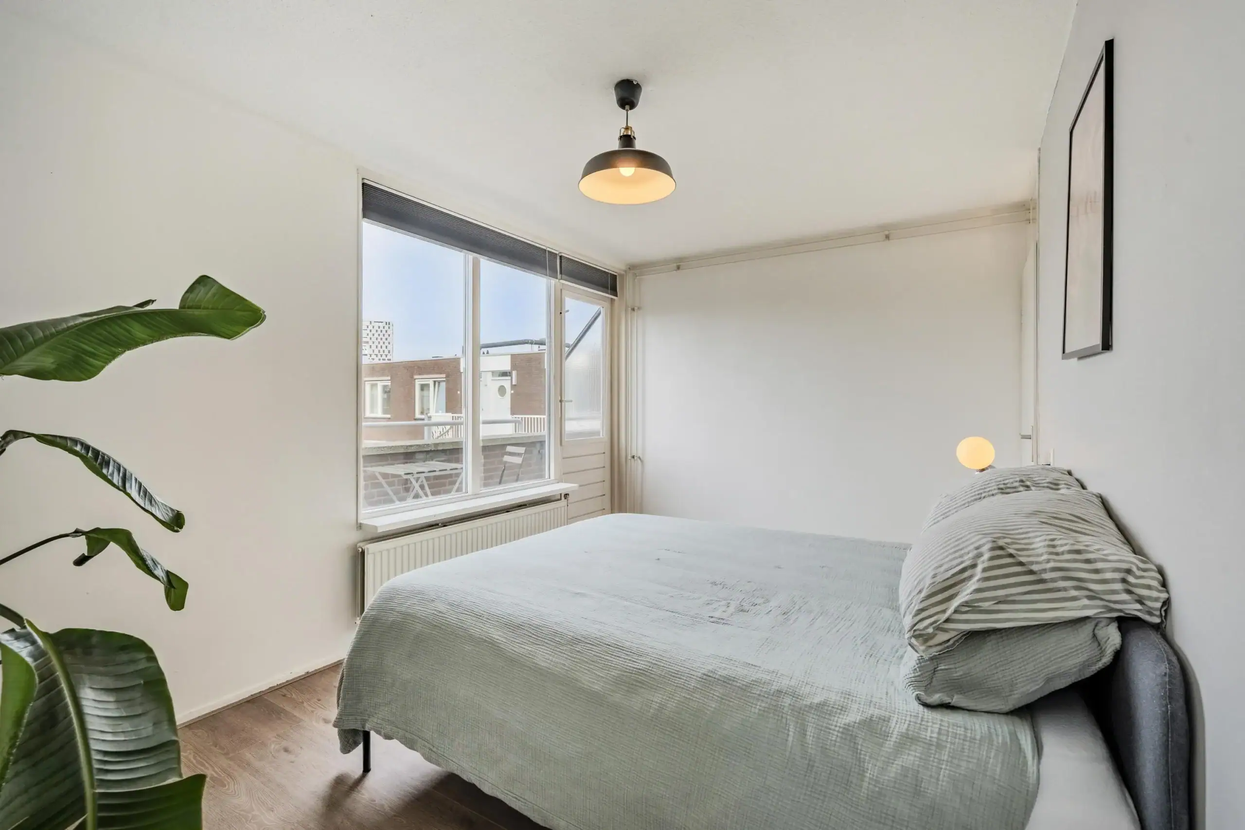 Aan de achterzijde van het appartement bevindt zich de ruime slaapkamer met voldoende ruimte voor een tweepersoonsbed, kledingkasten en eventueel een thuiswerkplek. De slaapkamer geeft toegang tot het balkon, dat een prachtig uitzicht biedt op de groene binnentuin. De badkamer is voorzien van een wastafel, een inloopdouche, een toilet en een aansluiting voor uw wasmachine. De meterkast bevindt zich in het gemeenschappelijk trappenhuis. In de onderbouw is er een gemeenschappelijke (fietsen)berging beschikbaar.