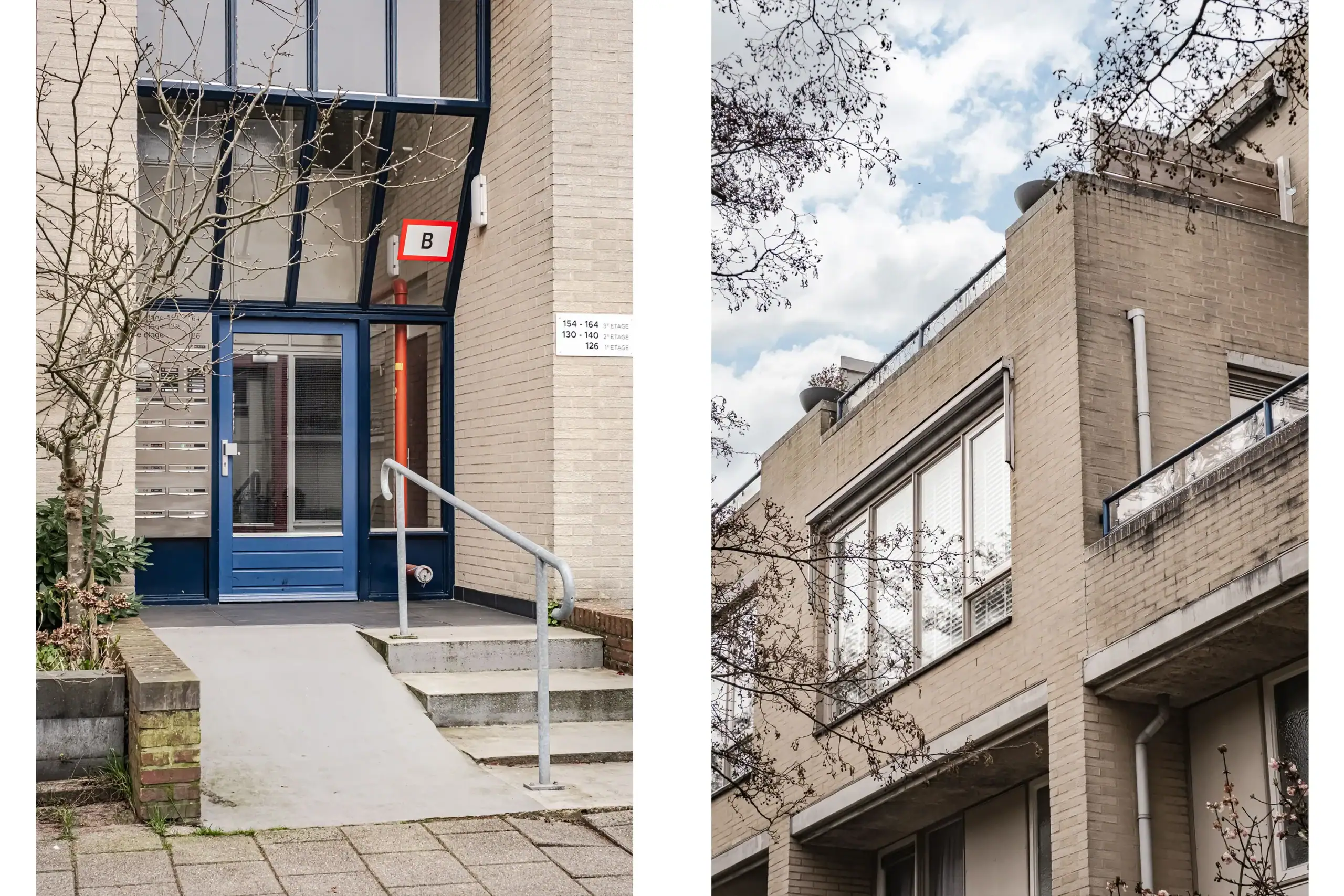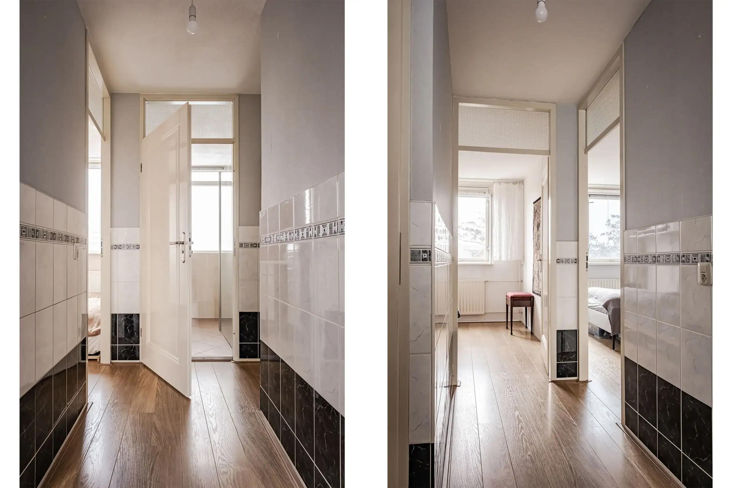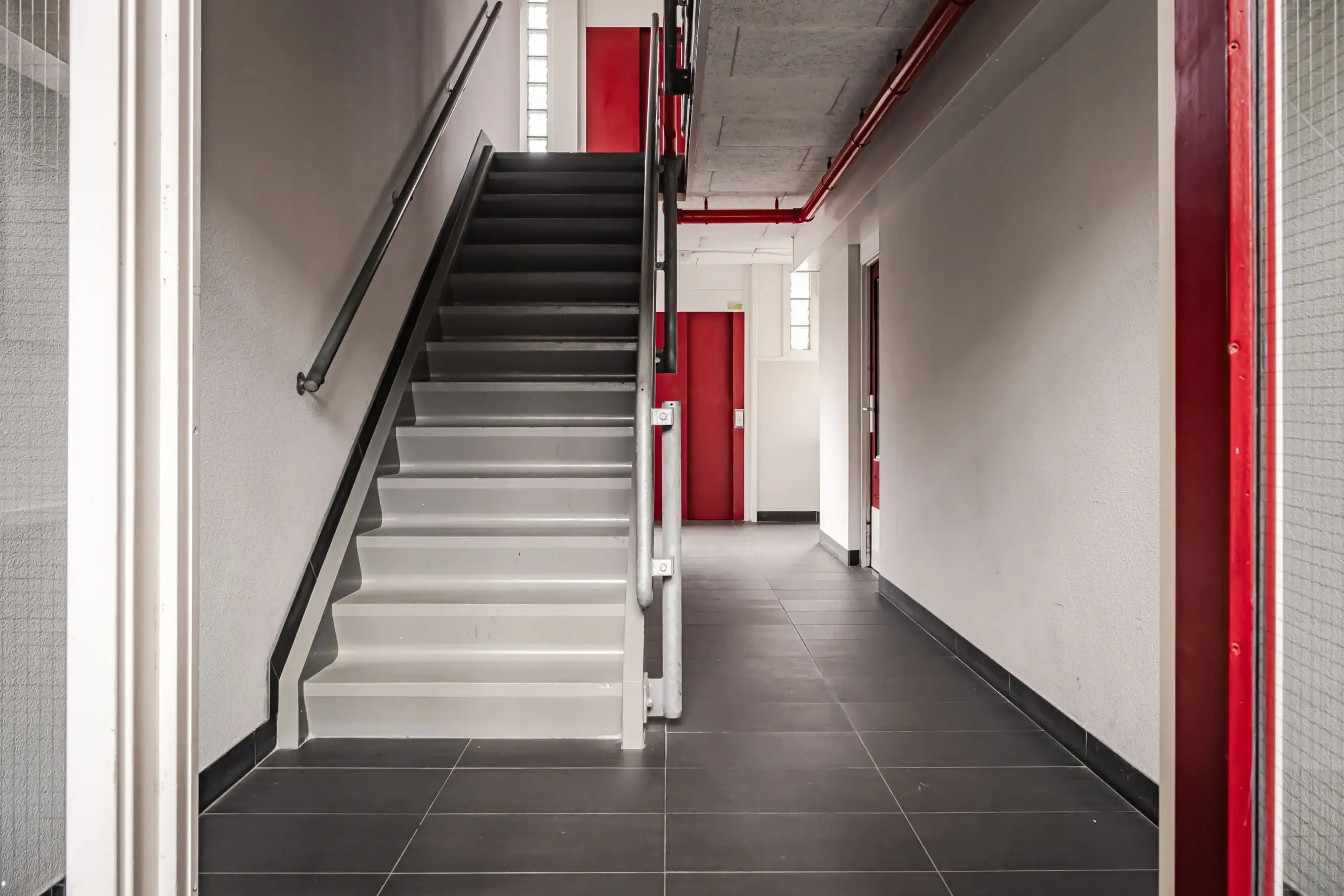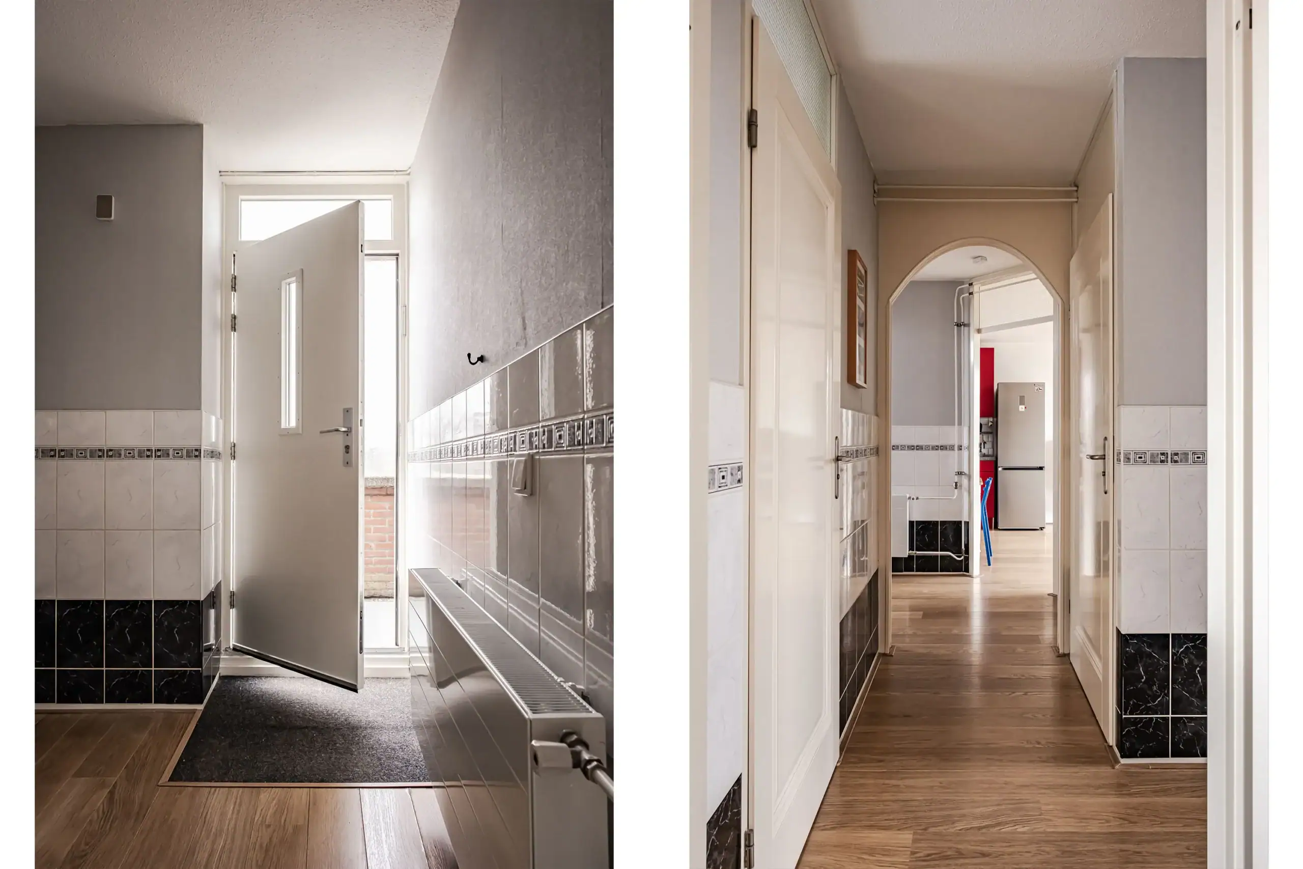 Entree. Hal met bellentableau en brievenbussen. Hal met lift en trappenhuis plus een toegang naar de berging.