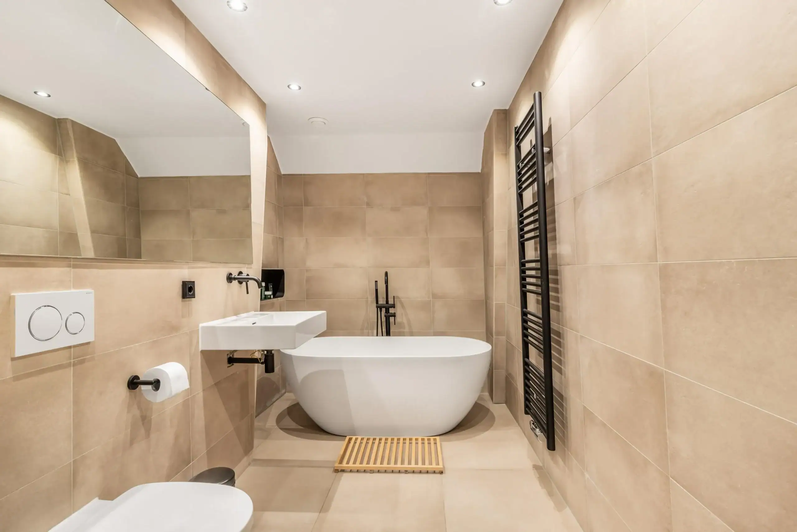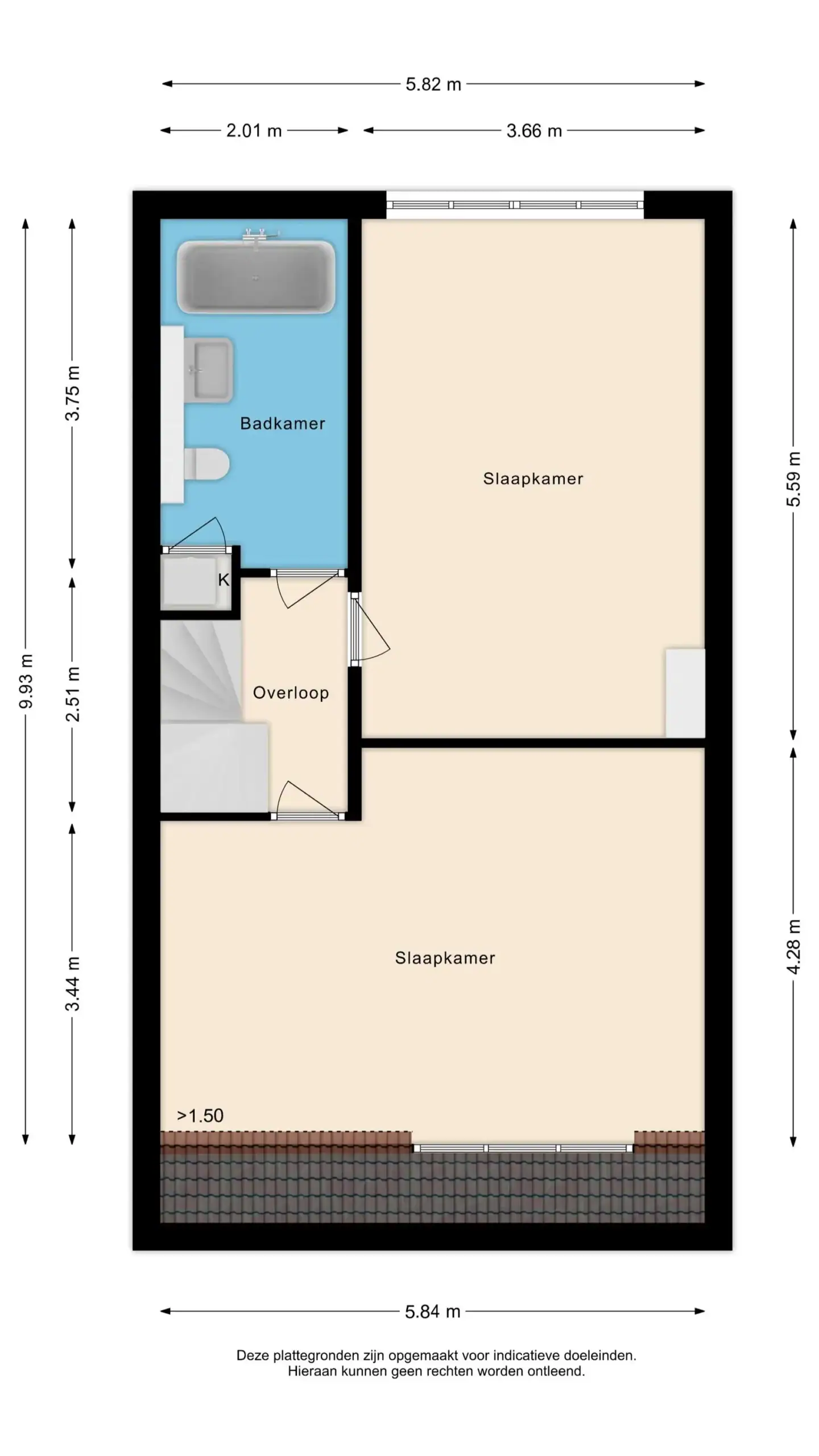 Overloop, tweede badkamer met bad, toilet, radiator en opstelling voor wasmachine en droger. Ruime slaapkamer aan de achterzijde en nog een slaapkamer aan de voorzijde van de woning. Trap omhoog naar…