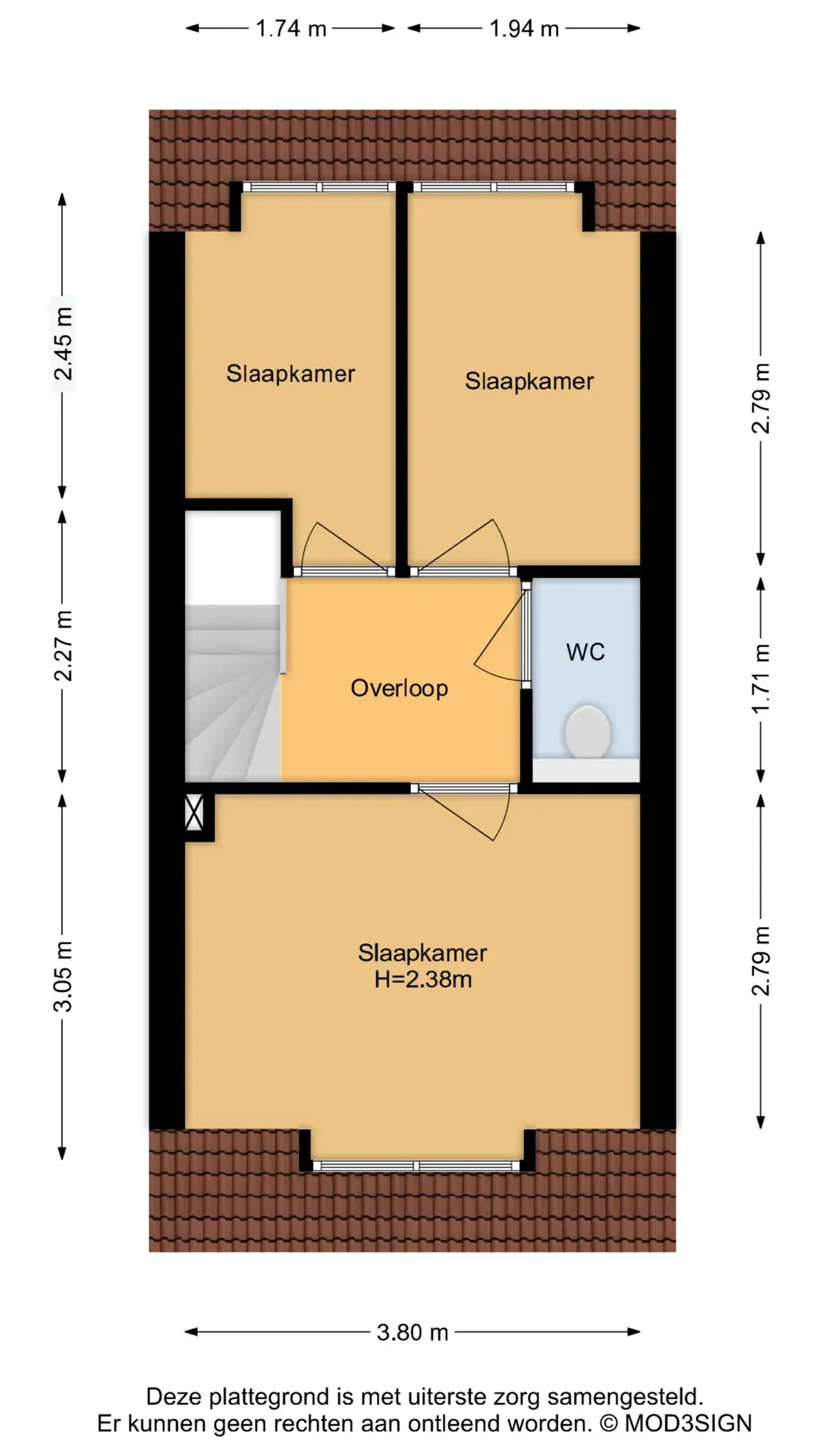 Overloop met airco boven de trap. Toilet. Slaapkamer voorzijde met dakkapel en kastenwand. Kinderkamers aan de achterzijde met dakkapel.