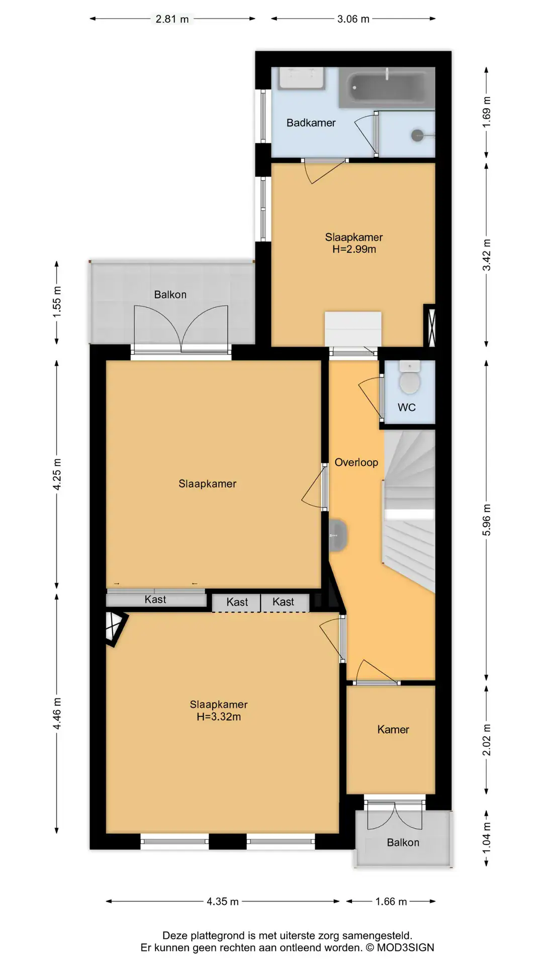 Overloop met separaat toilet. Slaapkamer aan de achterzijde met toegang naar de badkamer met ligbad, douche, wastafelmeubel en handdoekradiator. Slaapkamer aan de achterzijde met vaste kasten en balkon. Slaapkamer aan de voorzijde met vaste kasten en schouw. Werkkamer met inpandig balkon.