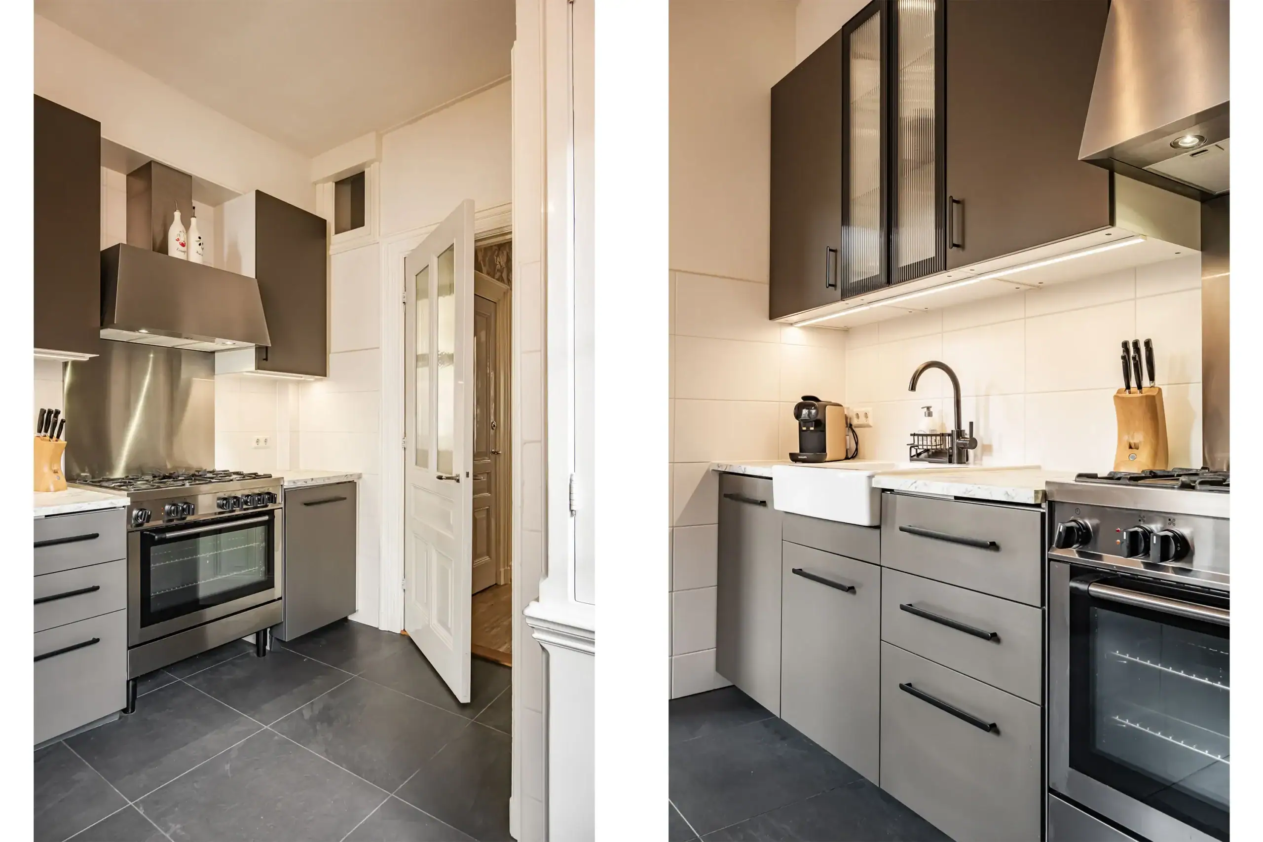 Entree. Vestibule met veel marmer en authentieke deur met sierglas. Gang met trapkast en modern toilet. Royale woonkamer en-suite met hoge ornamenten plafonds, inbouwkasten en mooie stenen schouw. Aan de achterzijde een serre met openslaande deuren naar de tuin met buitenkeuken. Moderne keuken voorzien van extra breed gasfornuis met oven, afzuigkap en vaatwasser. Verder is er nog een authentieke voorraadkast met glazen deuren. Deur met toegang naar ruime kelder. Bijkeuken met gootsteen, aansluiting voor wasmachine en droger en deur naar de tuin. Kast met cv-ketel.