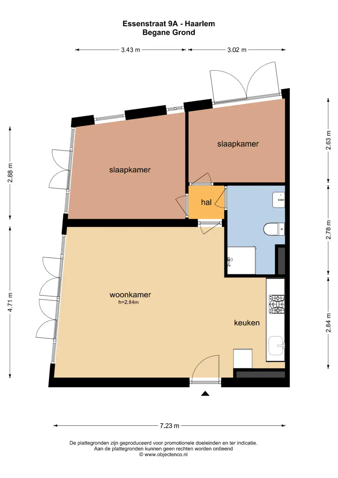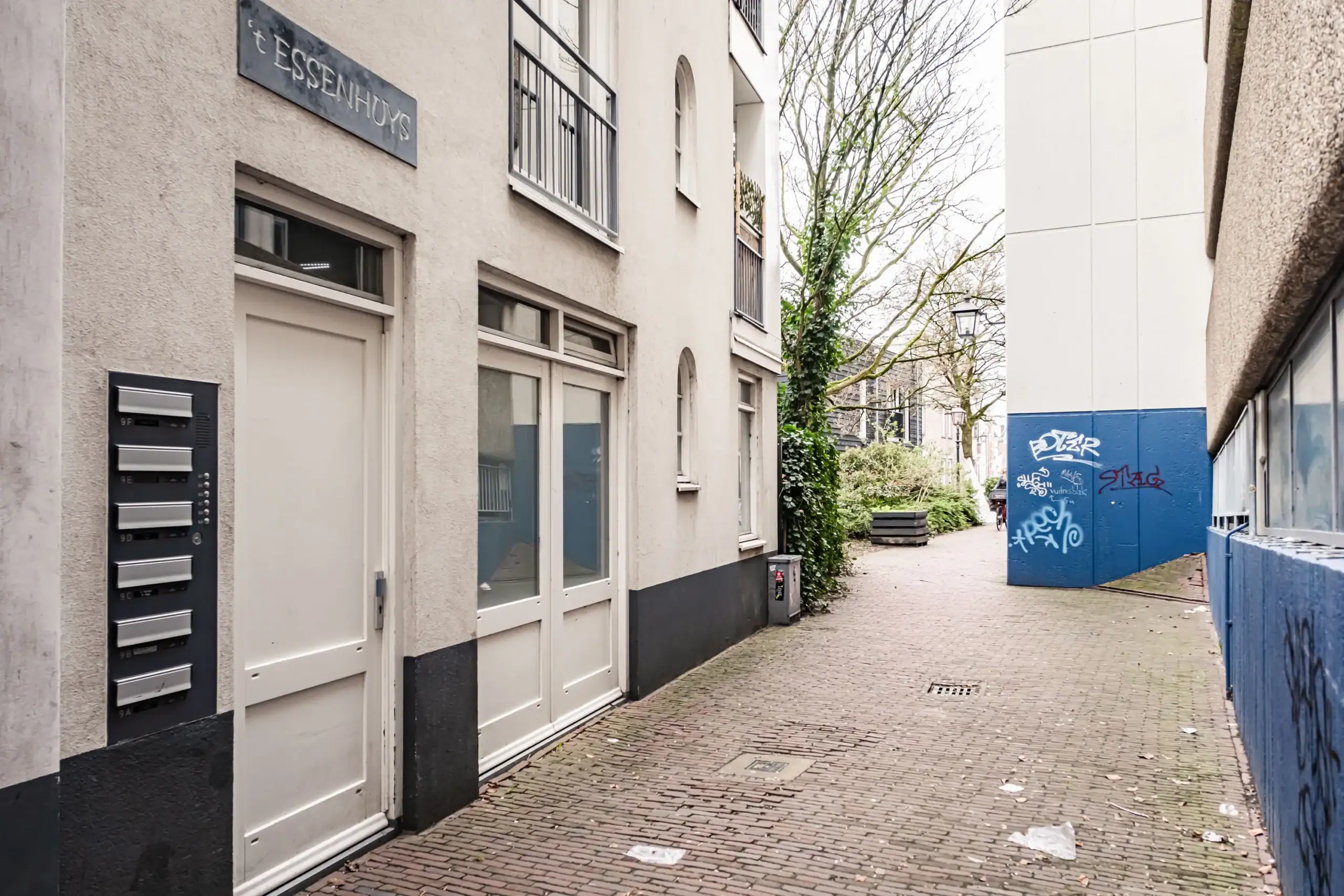 Entree appartementen complex. Centrale hal met brievenbussen en stalling voor de fietsen. Entree appartement. Woonkamer met openslaande deuren naar de gezamenlijke binnentuin. Open keuken voorzien van 4 pits gasstel, afzuigkap, oven en koelkast. Klein halletje met toegang naar alle vertrekken. Slaapkamer met openslaande deuren naar de binnentuin. Slaapkamer twee met openslaande deuren naar de Essenstraat. Badkamer voorzien van een toilet, douche en een wasbak. Naast de voordeur is een eigen berging met opstelling van de C.V.-Ketel.