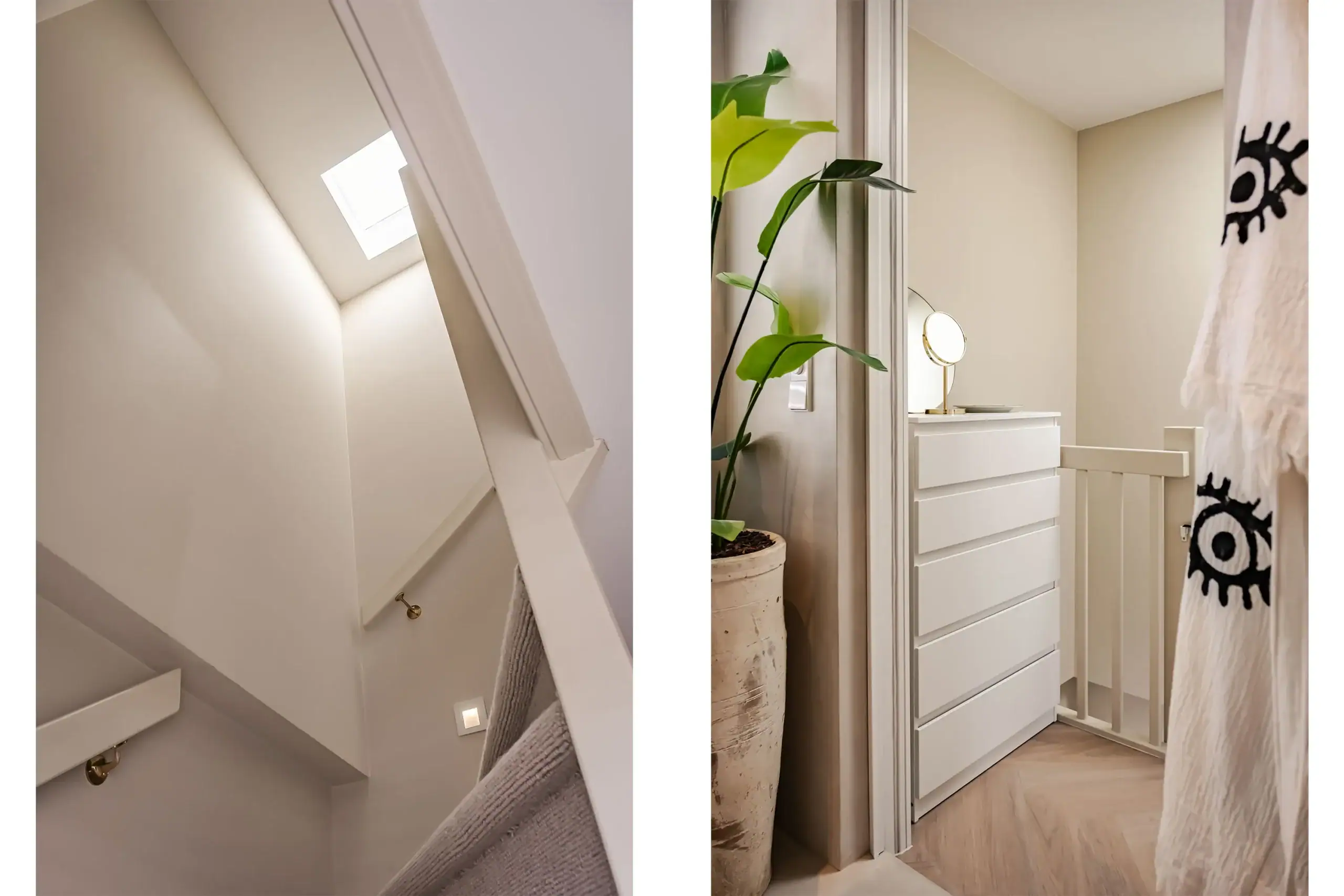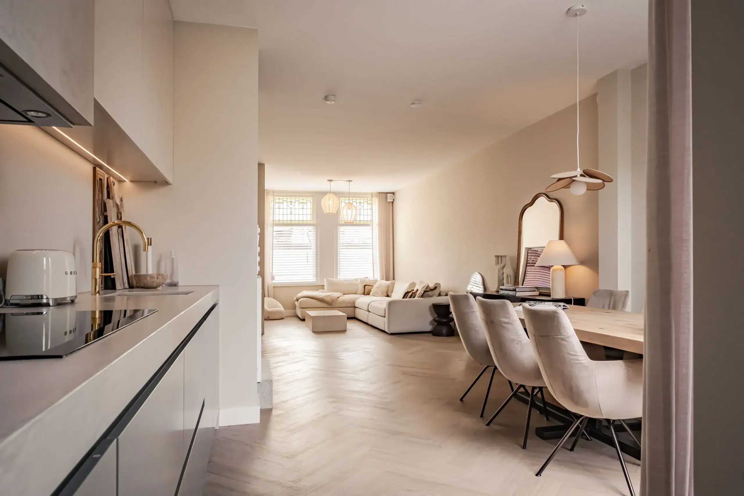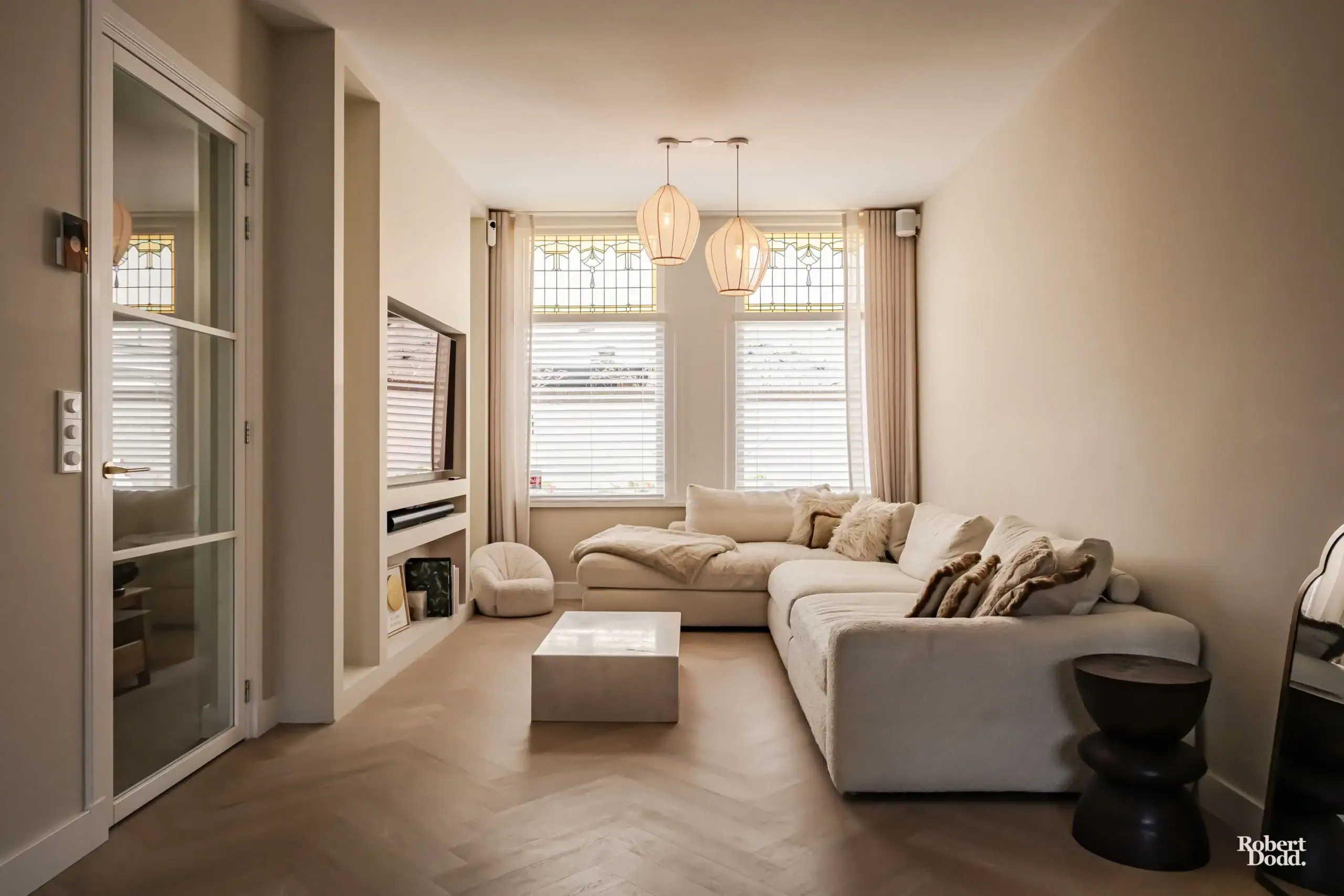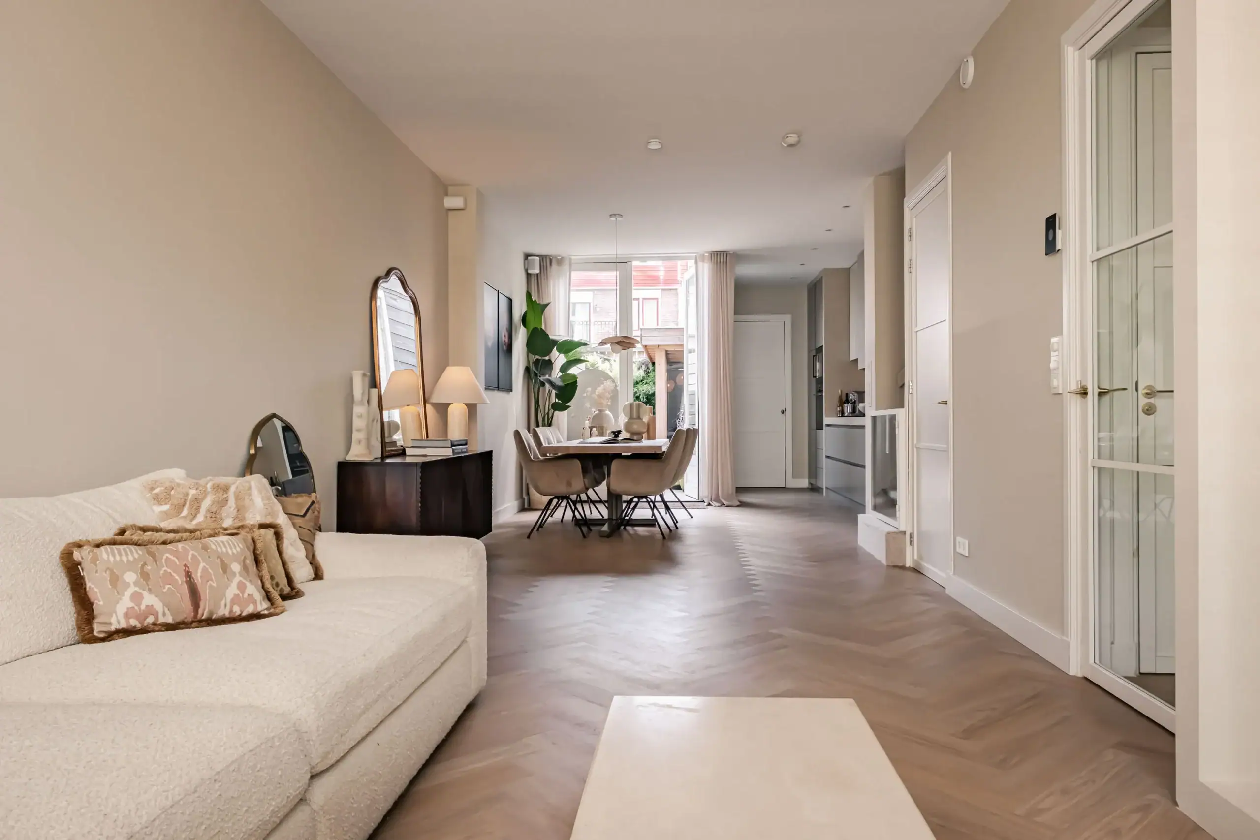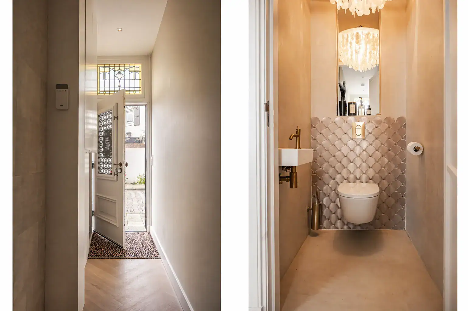 Deze fijne eengezinswoning biedt genoeg ruimte als echt familiehuis, maar de extra kamers zijn natuurlijk ook heerlijk als logeerkamer, sportruimte of werkruimte. Bij de grootschalige verbouwing in 2022 zijn kosten noch moeite gespaard om van deze klassieke woning van voor 1900 en modern thuis te maken. Overal is aan gedacht, in afwerking en stijl maar zeker ook in de indeling. De basisafwerking is strak, met visgraat pvc vloeren op alle verdiepingen, gestucte muren en ingebouwde spots. Dit is aangevuld met prachtige details zoals goudkleurige armaturen en deurbeslag en de luxe afwerking van de keuken en badkamer met minerale microcoating (Mortex). Er is optimaal gebruik gemaakt van de ruimte door onder andere de trap te verplaatsen alsmede het toilet op de begane grond en door het creëren van de handige vaste kast op de overloop met veel bergruimte en de wasmachine- en droger aansluiting. Door de gehele woning is gebruik gemaakt van moderne en stijlvolle beige tinten; een bijzonder fraaie combinatie met de klassieke kenmerken als het glas in lood en de authentieke voordeur met gietijzeren tralierooster.