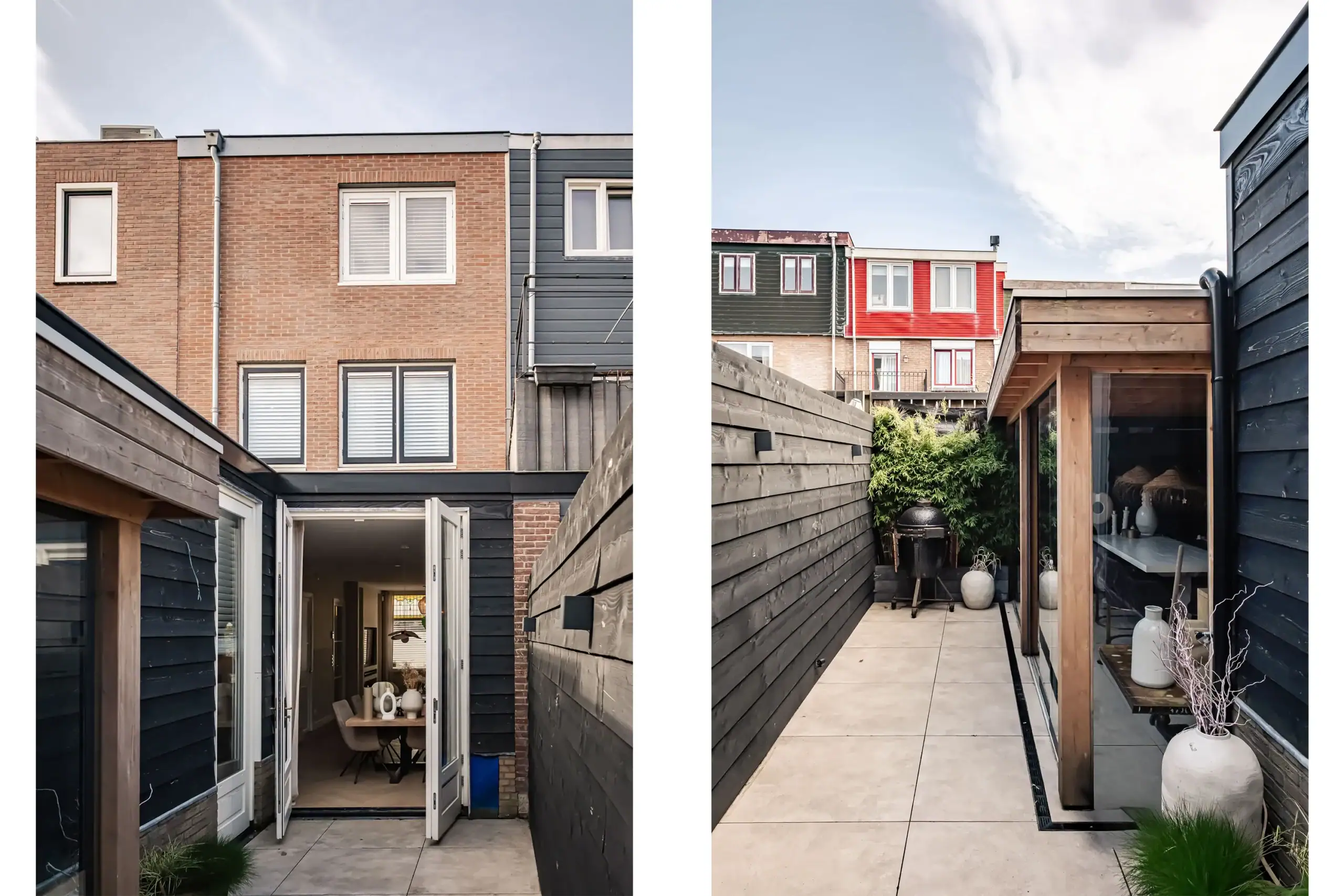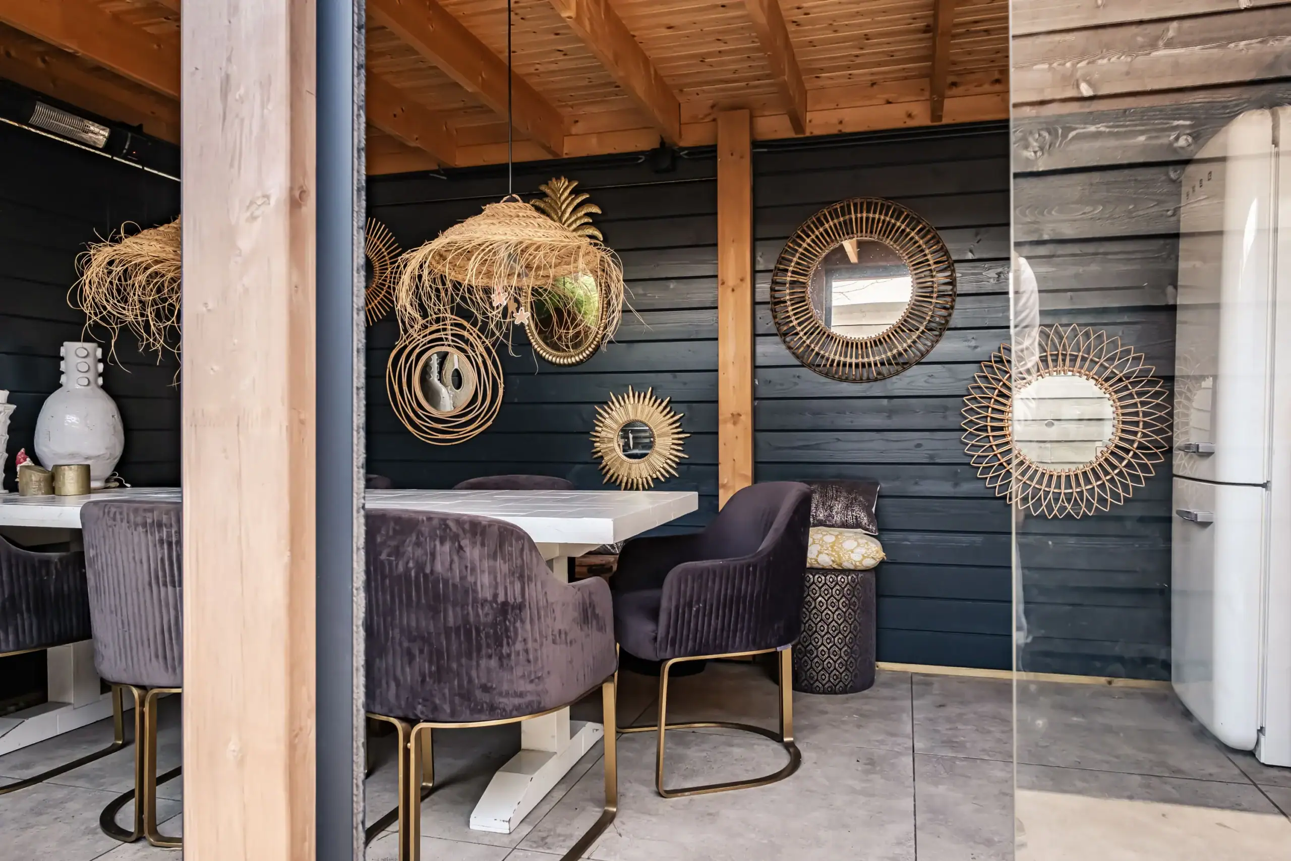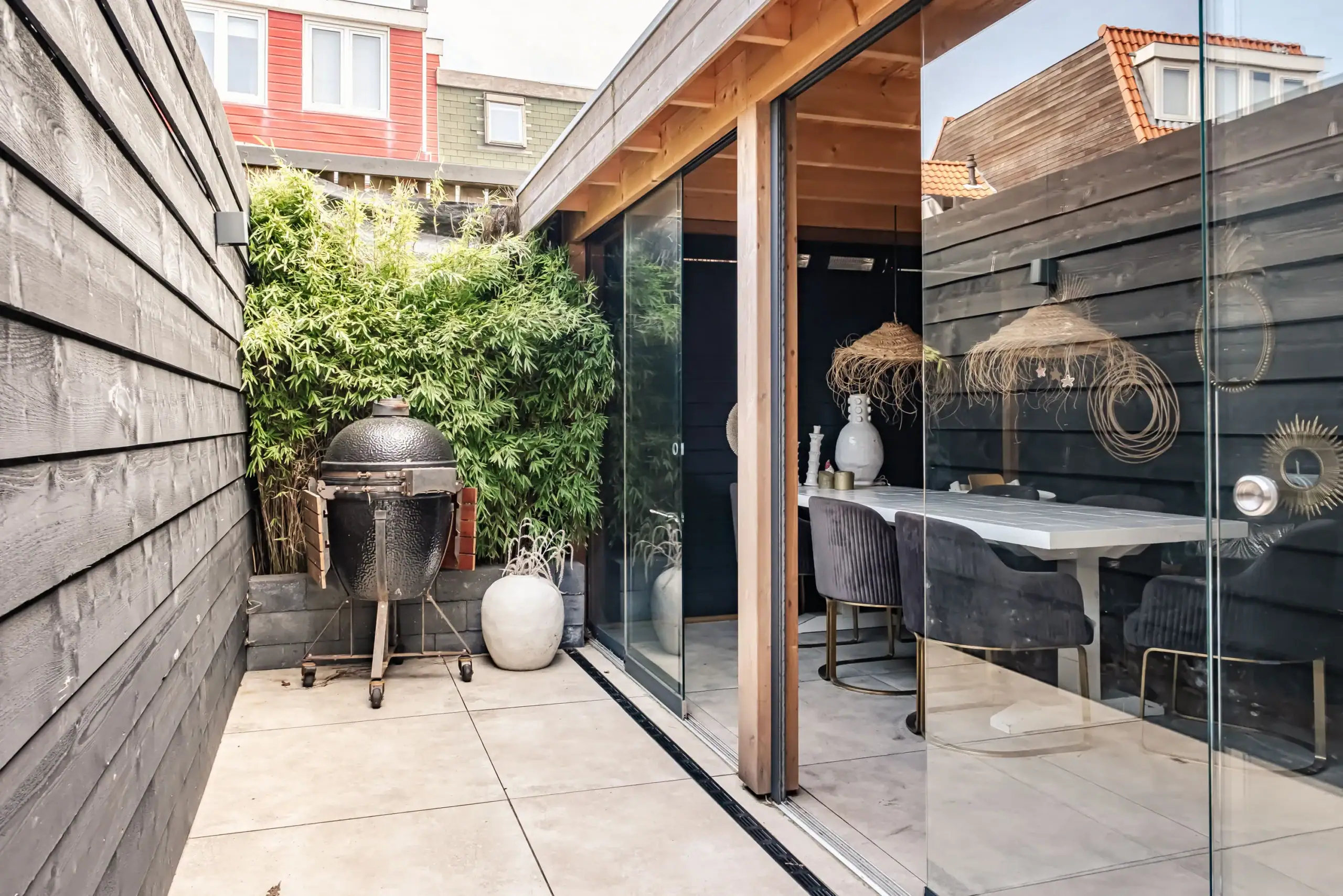 De hoge openslaande deuren aan de achterkant maken de zonnige achtertuin echt een verlengde van de leefruimte binnen. De grote veranda heeft een glazen schuifpui waarmee hij geheel af te sluiten is. Er hangt een heater en er is een televisie aansluiting; een fijne plek om het hele daar door comfortabel te zitten.