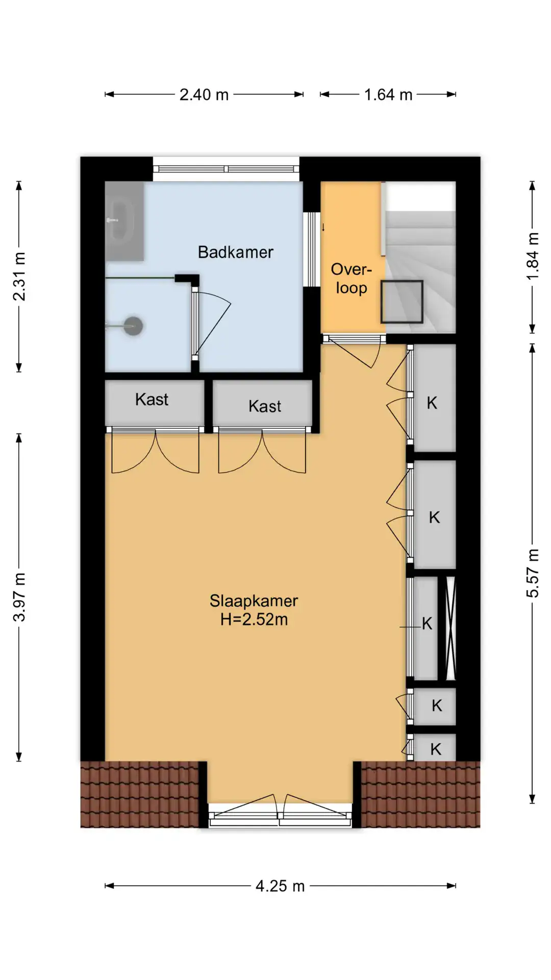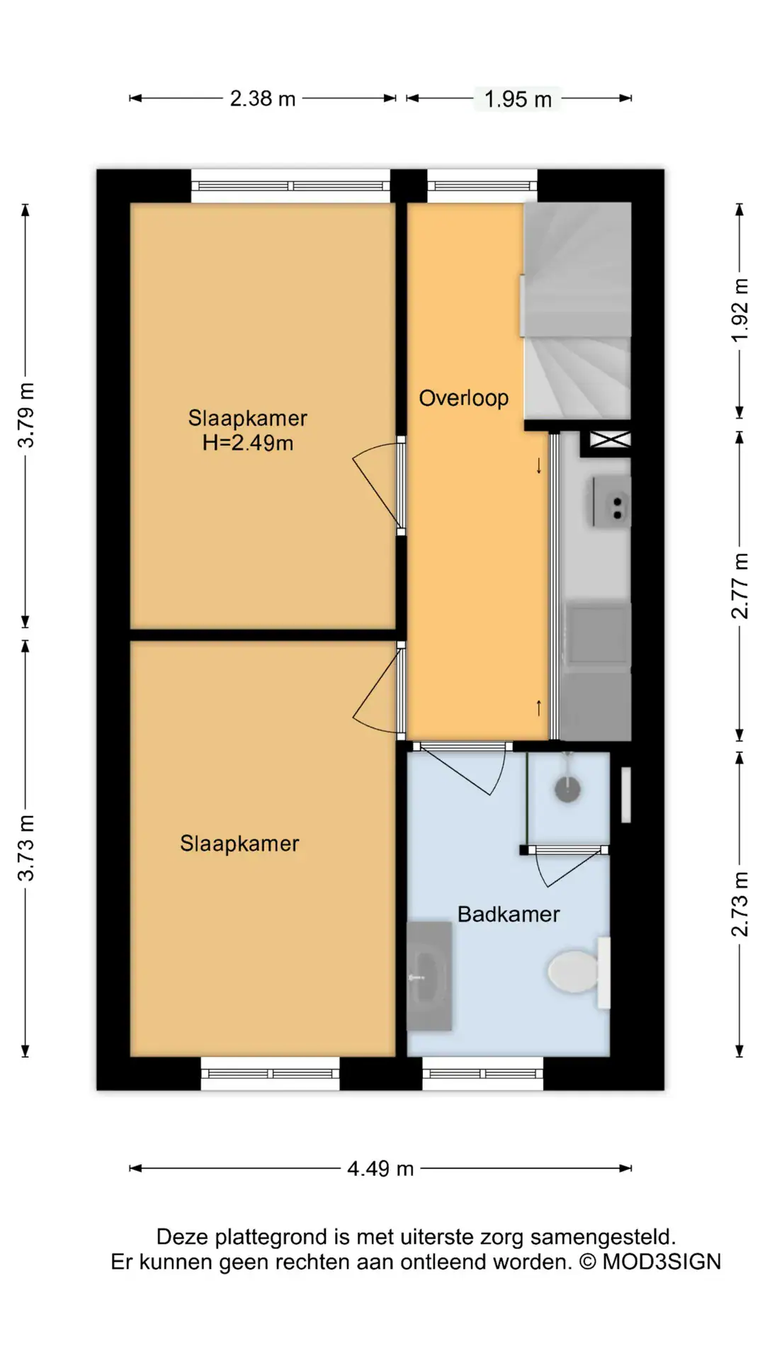 Overloop met grote vaste kast met cv-opstelling en wasmachine- en droger aansluiting. Slaapkamer aan de achterzijde met airco. Slaapkamer voorzijde. Badkamer met breed wastafelmeubel, inloopdouche met regendouche, toilet en handdoekradiator.