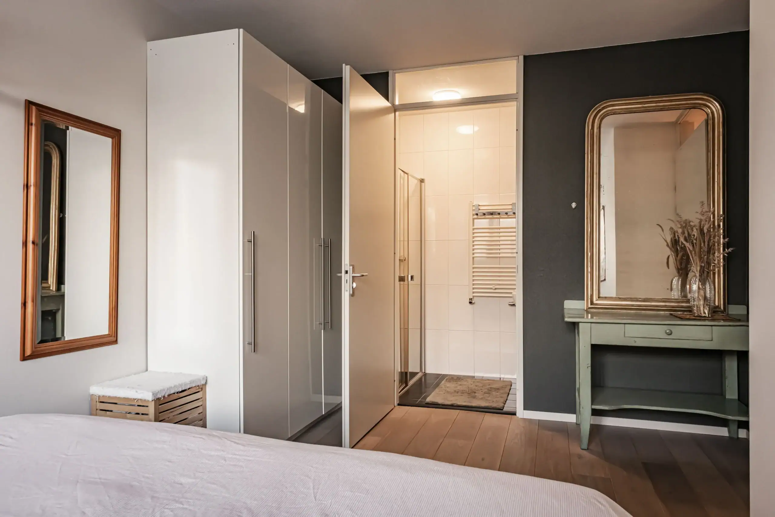 Dit moderne en sfeervolle appartement ligt op eerste verdieping van het kleinschalige complex “Benedictushof” aan de rand van het centrum. De woonkamer is heerlijk ruim en door de grote ramen en openslaande deuren, geniet je optimaal van het zonlicht. Het Franse balkon is op het zuiden en in de zomer zit of lig je in je eigen woonkamer heerlijk in de zon. Op de achtergrond hoor je het kabbelende water van het Spaarne. De slaapkamer is verrassend groot en heeft een ensuite badkamer. Overal in de woning ligt een strak lamel parket met geïntegreerde vloerverwarming en -koeling. Kortom: een comfortabel appartement vol licht en ruimte, dat meteen huiselijk aanvoelt. In de onderbouw van het complex (hoogbouw) is er een ruime eigen berging.