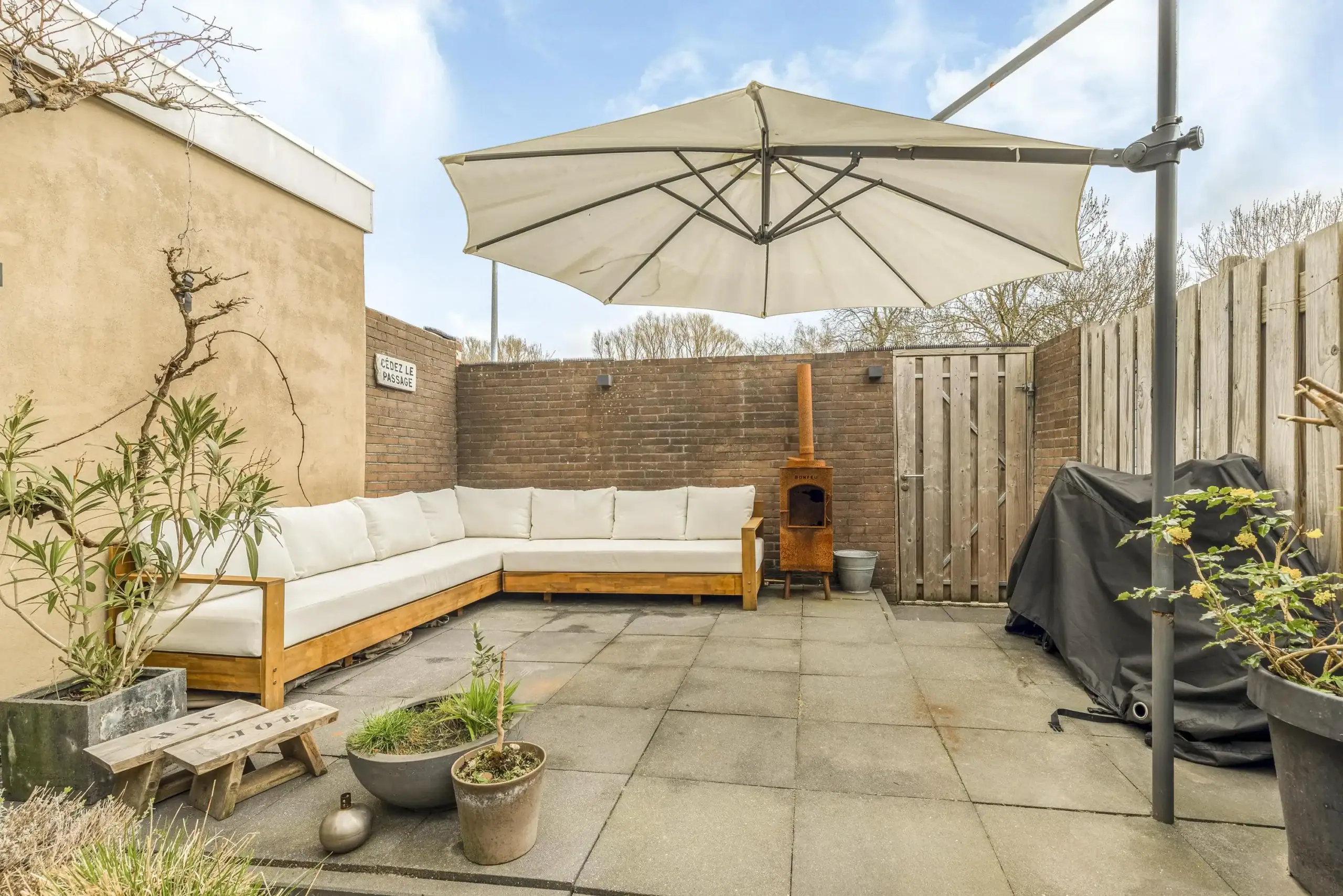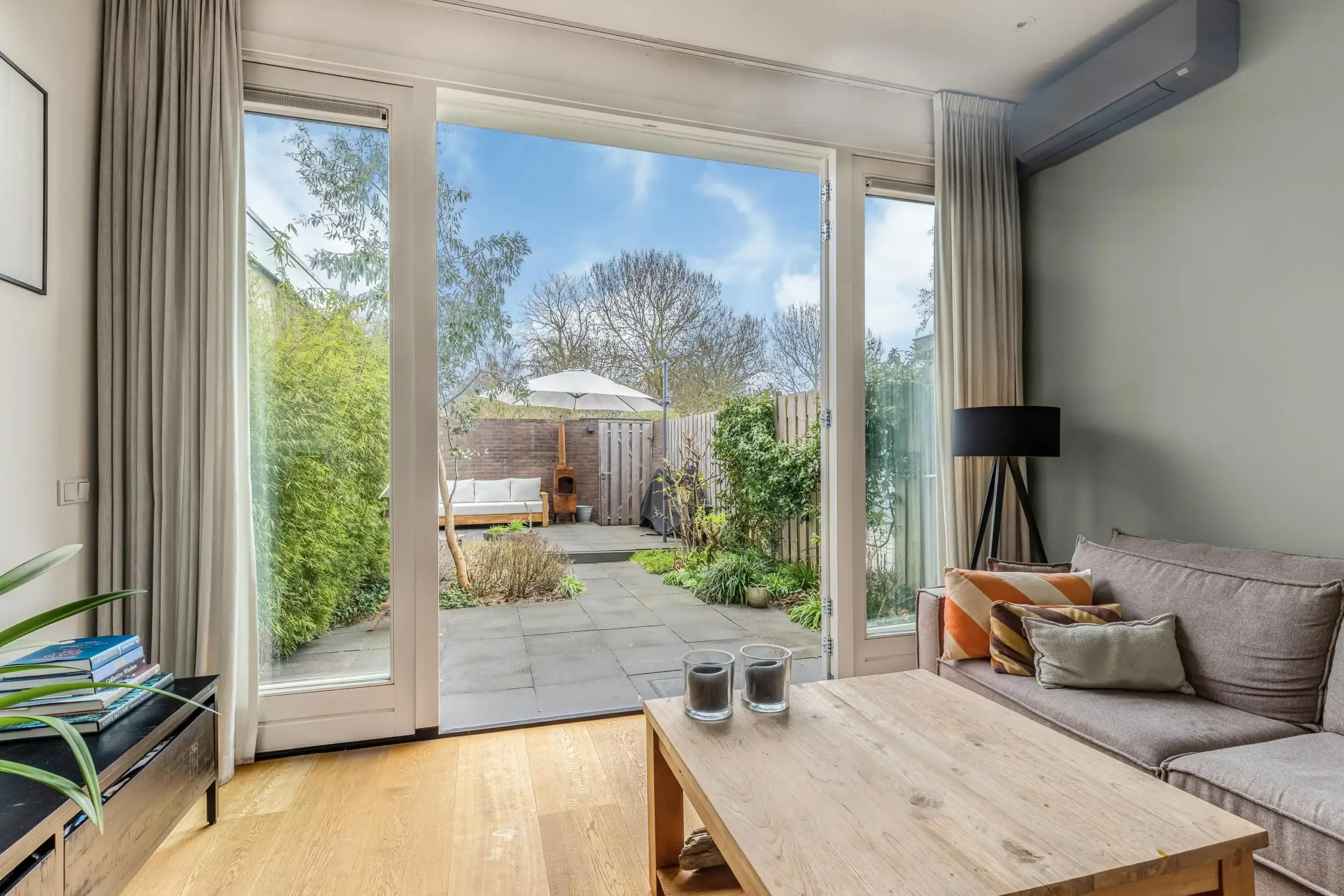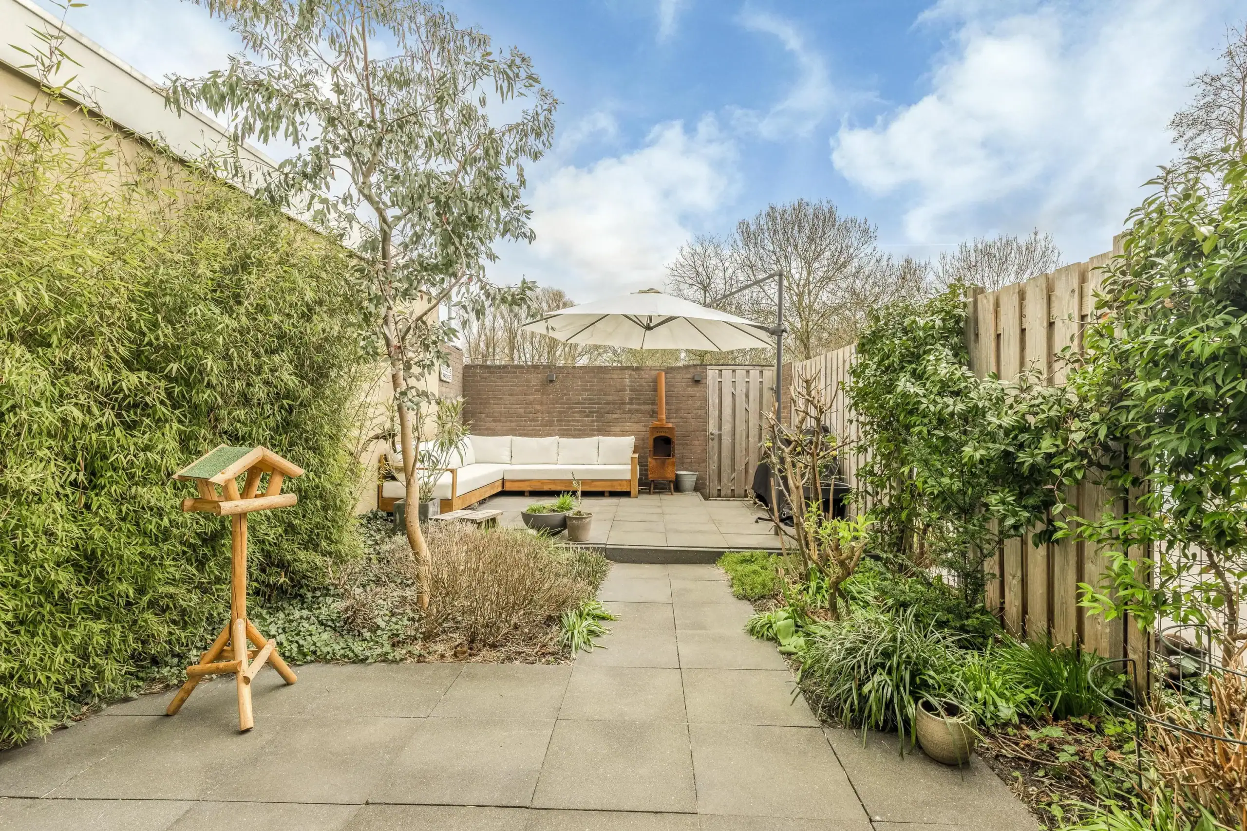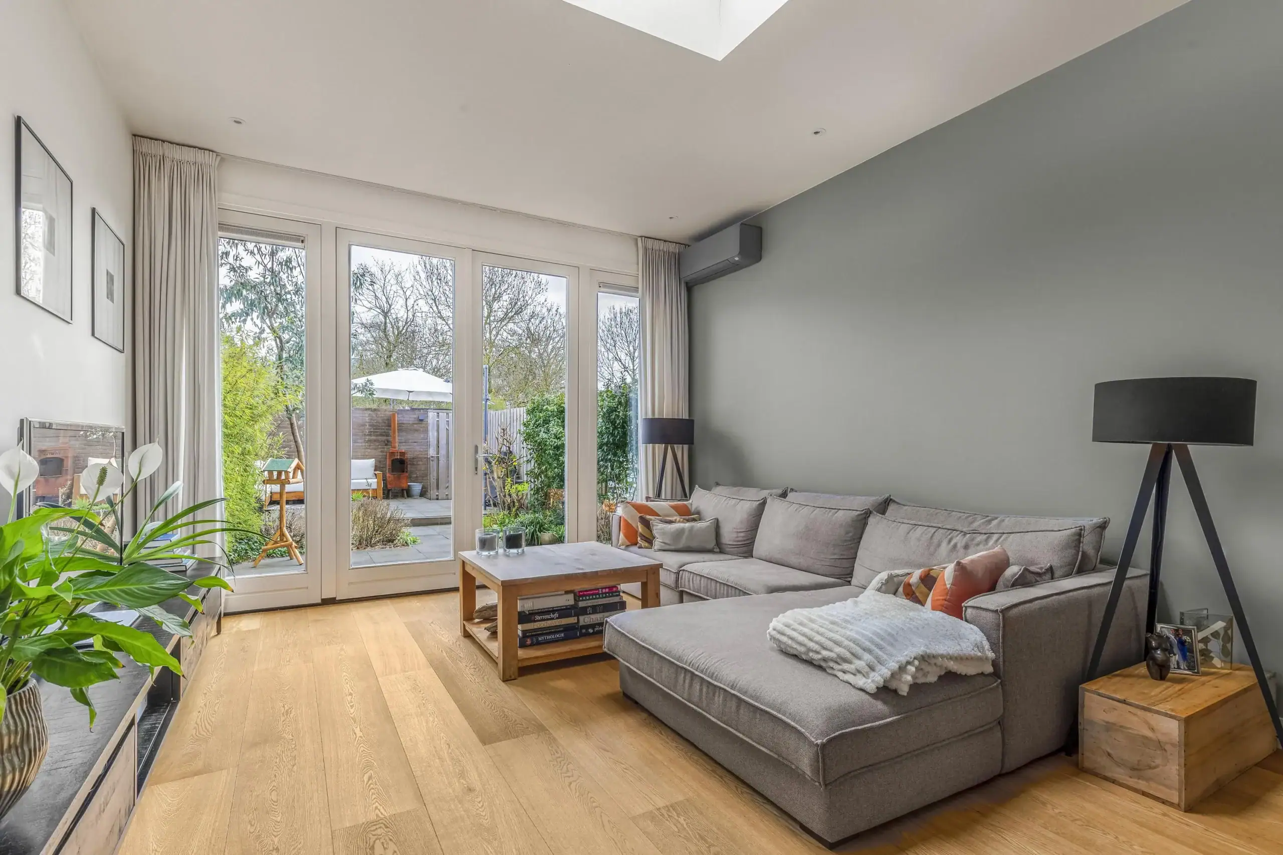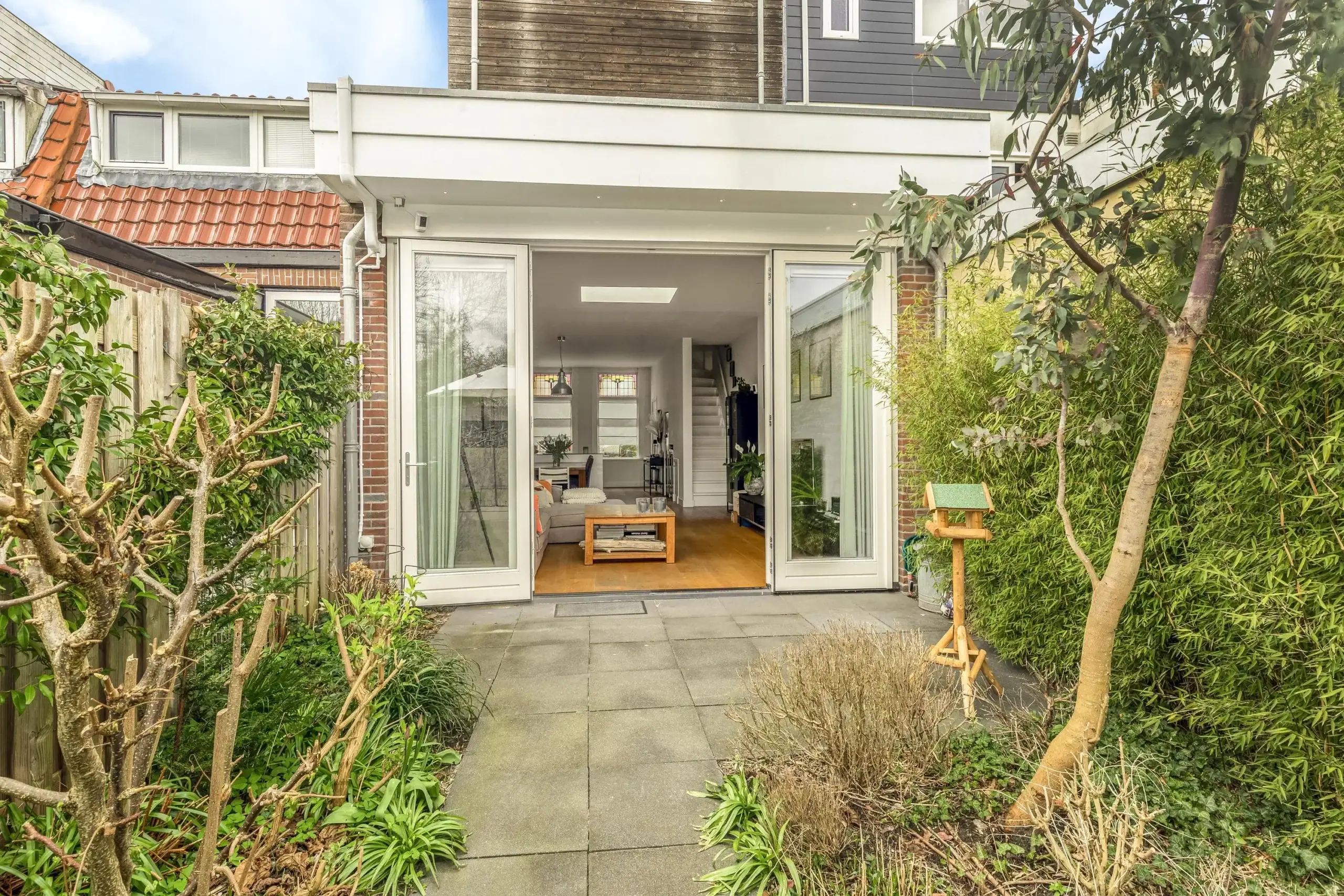 Het zitgedeelte aan de achterzijde is voornamelijk in de uitbouw gesitueerd. Het daklicht en achterpui met grote ramen zorgen voor super veel licht. De openslaande deuren zorgen voor de echte verbinding met buiten. De achtertuin is fraai aangelegd en biedt ruimte aan o.a. een grote loungehoek en border met verschillende begroeiing, waaronder veel kruiden. In de zomer waan je je hier op vakantie en is het onder de druivenrank goed toeven. Je kunt hier lekker zitten voor een drankje of diner met vrienden of familie, terwijl de kinderen direct achter de tuin spelen in het park.