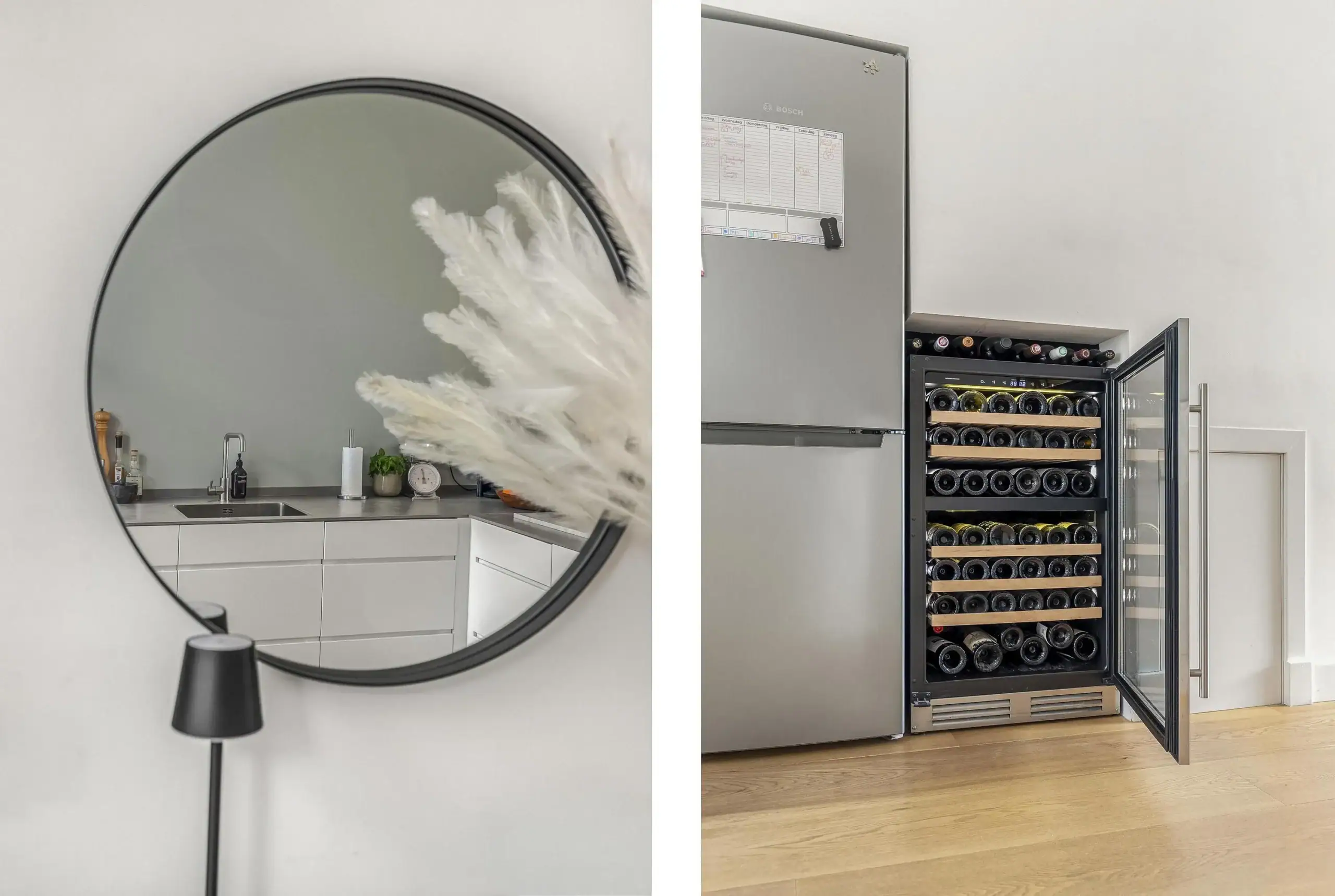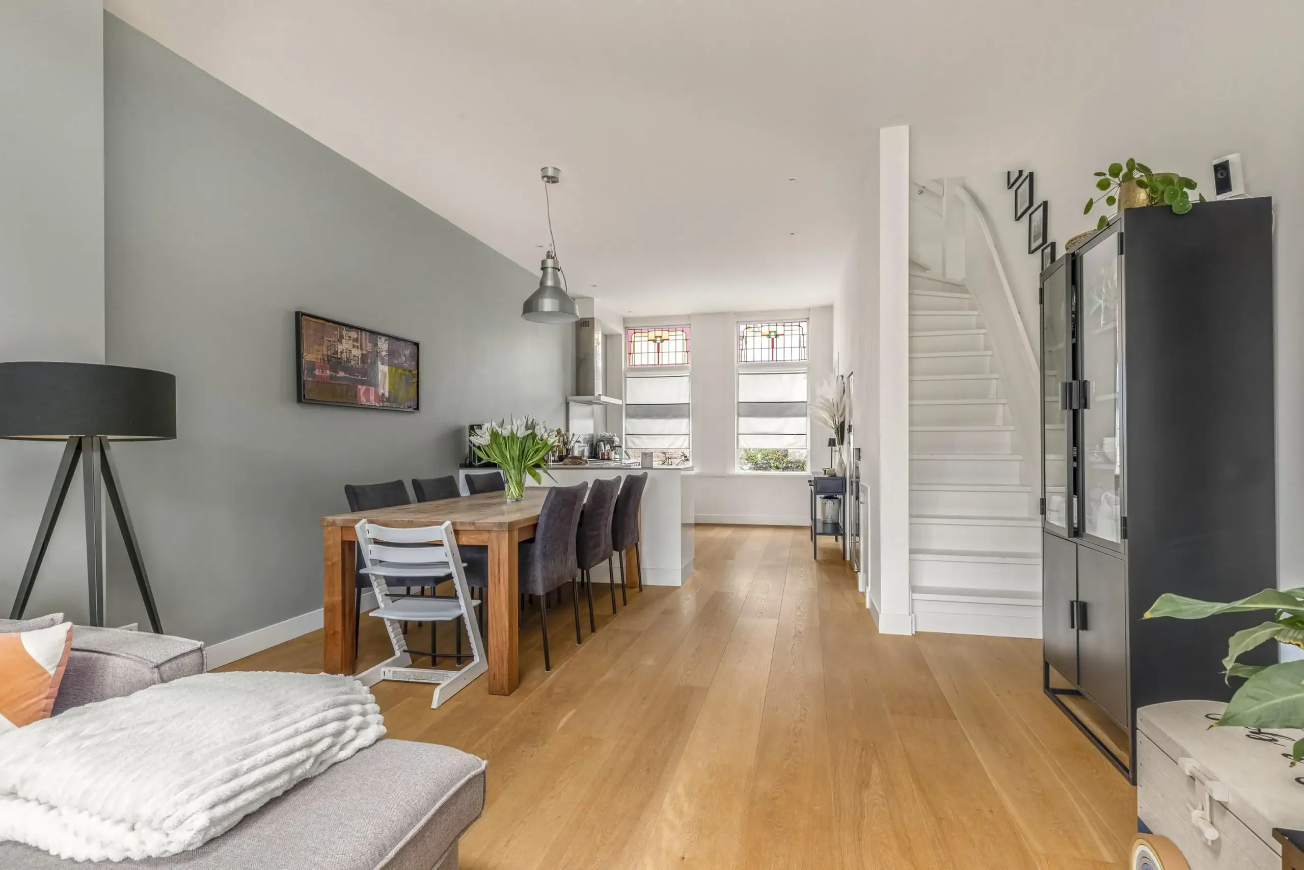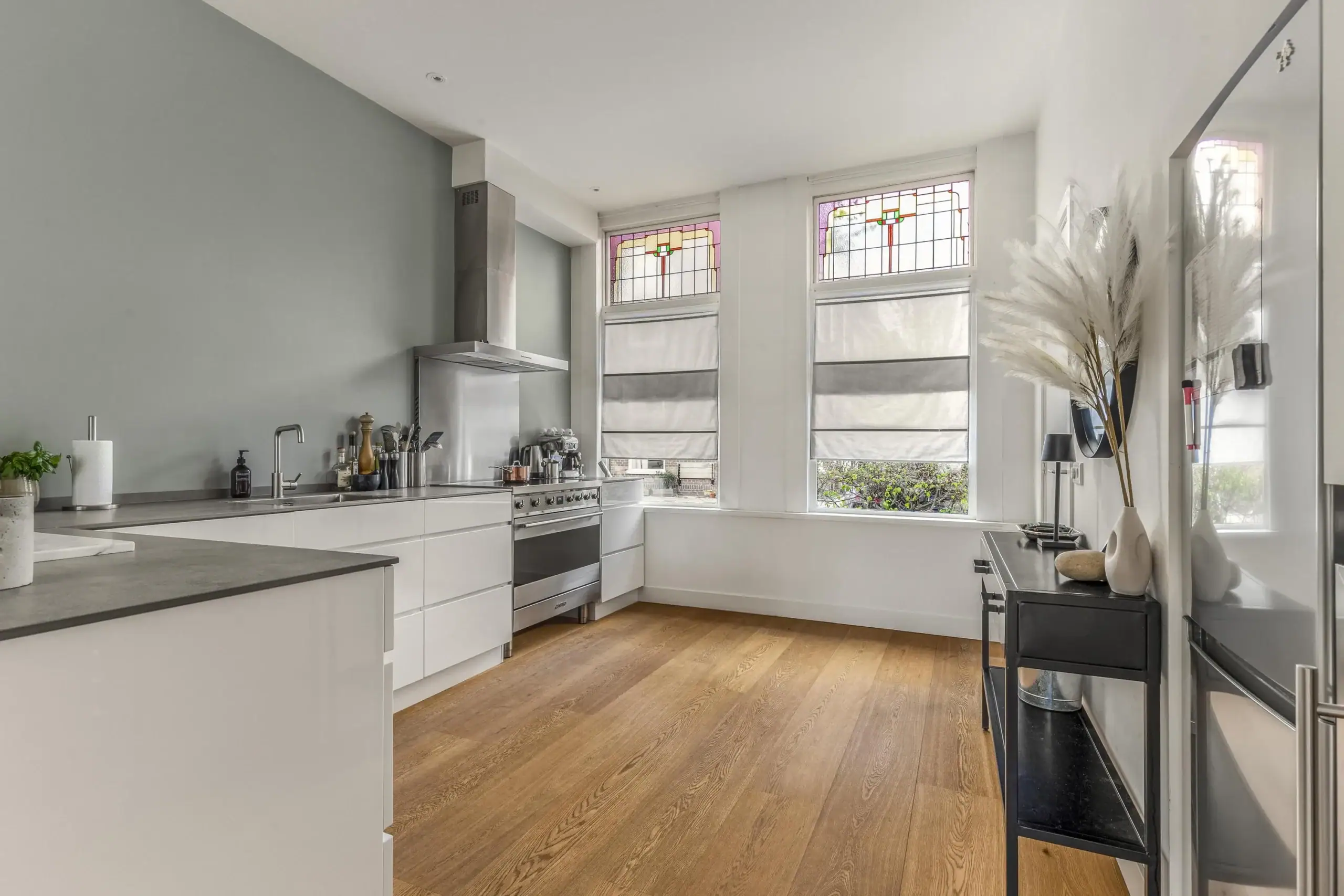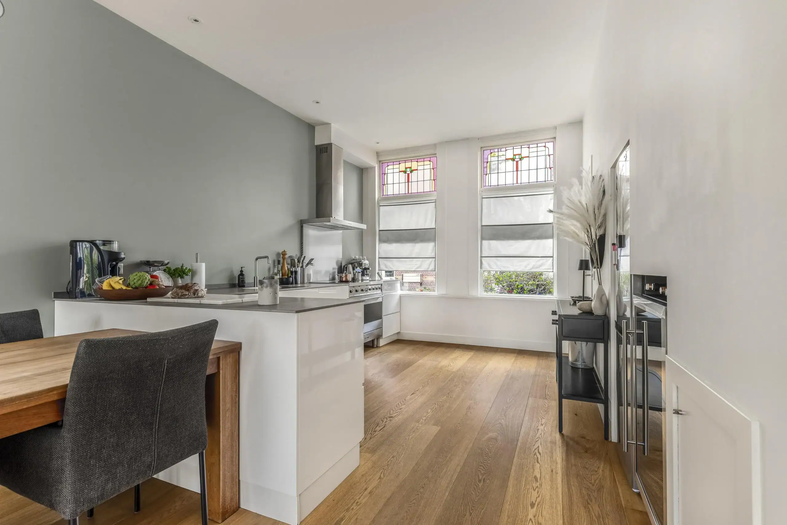 Wat een ruimte! Deze fijne eengezinswoning is achter de voordeur verrassend ruim èn helemaal van nu. Op de begane grond kom je binnen in de fantastische leefkeuken. De keuken heeft een L-opstelling en heeft tegen de wand een extra diep werkblad. Dit zorgt niet alleen voor extra werkruimte maar de lades en kasten eronder zijn ook extra groot. Een zee aan bergruimte dus. Verder is keuken voorzien van luxe inbouwapparatuur en een prachtig SMEG kooktoestel met inductiekookplaat een grote oven. De grote koelkast is weggewerkt onder de trap en hier is ook ruimte voor de wijnklimaatkast.