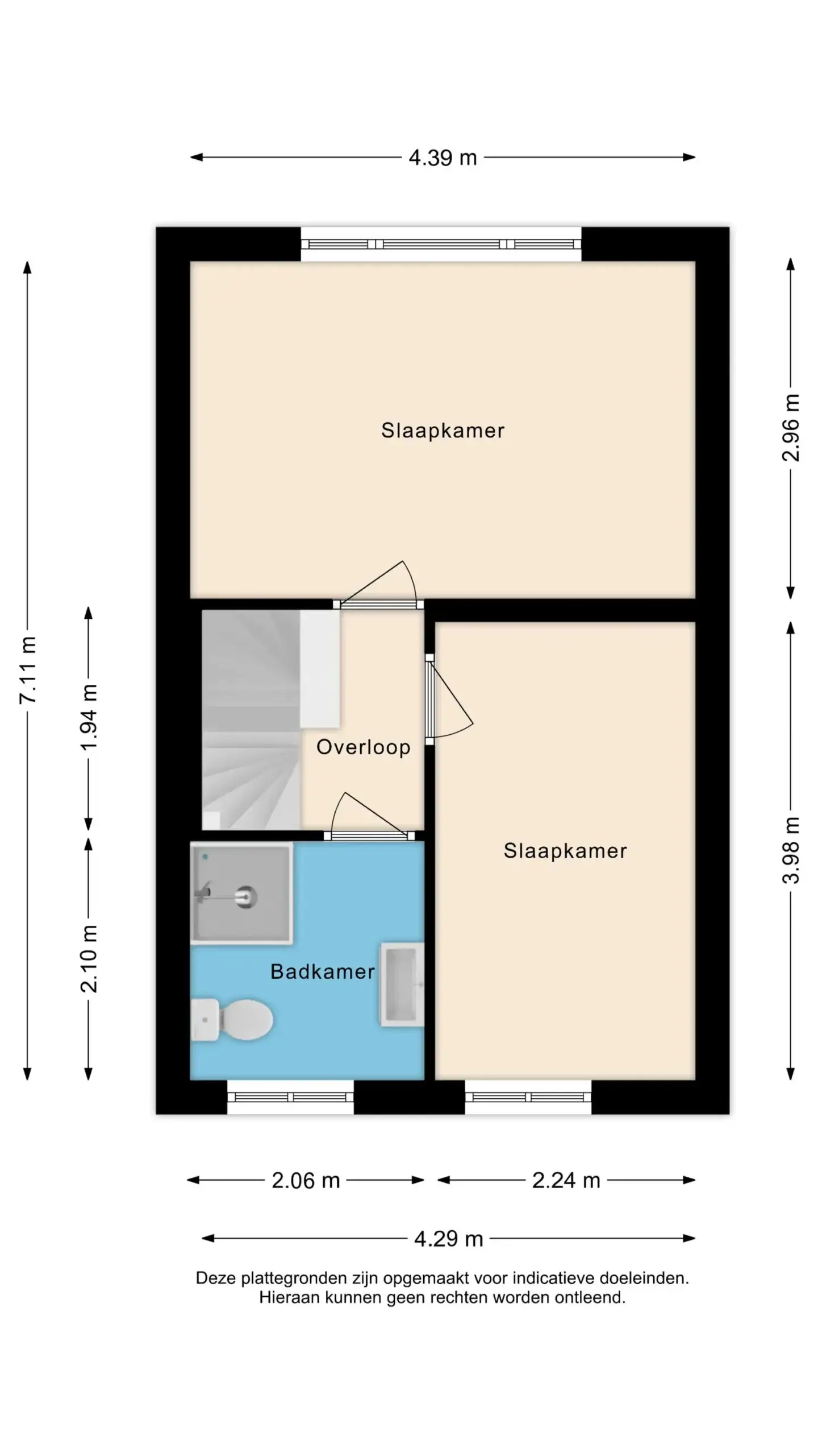 Overloop. Ouderslaapkamer achterzijde. Badkamer aan de voorzijde met douche, toilet en wastafelmeubel. Tweede slaapkamer aan de voorzijde.