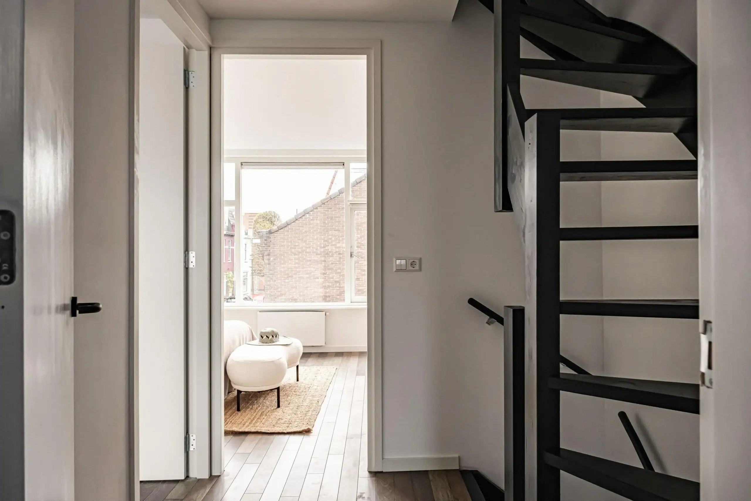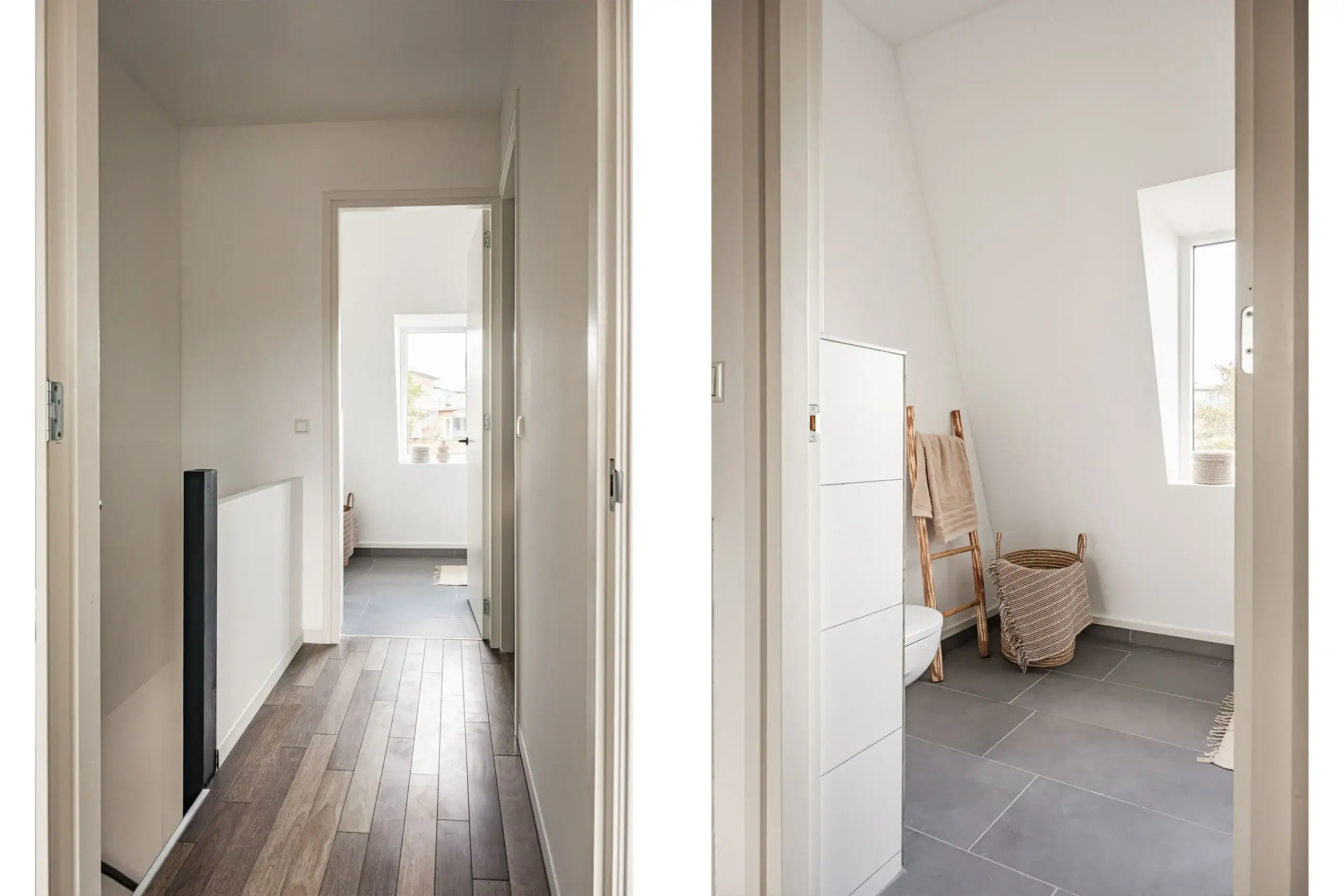Slaapkamer één bevindt zich aan de achterzijde van de woning. De overloop biedt toegang tot de tweede slaapkamer aan de voorzijde, evenals tot de moderne badkamer, uitgerust met een inloopdouche, wastafel, toilet en handdoekradiator.