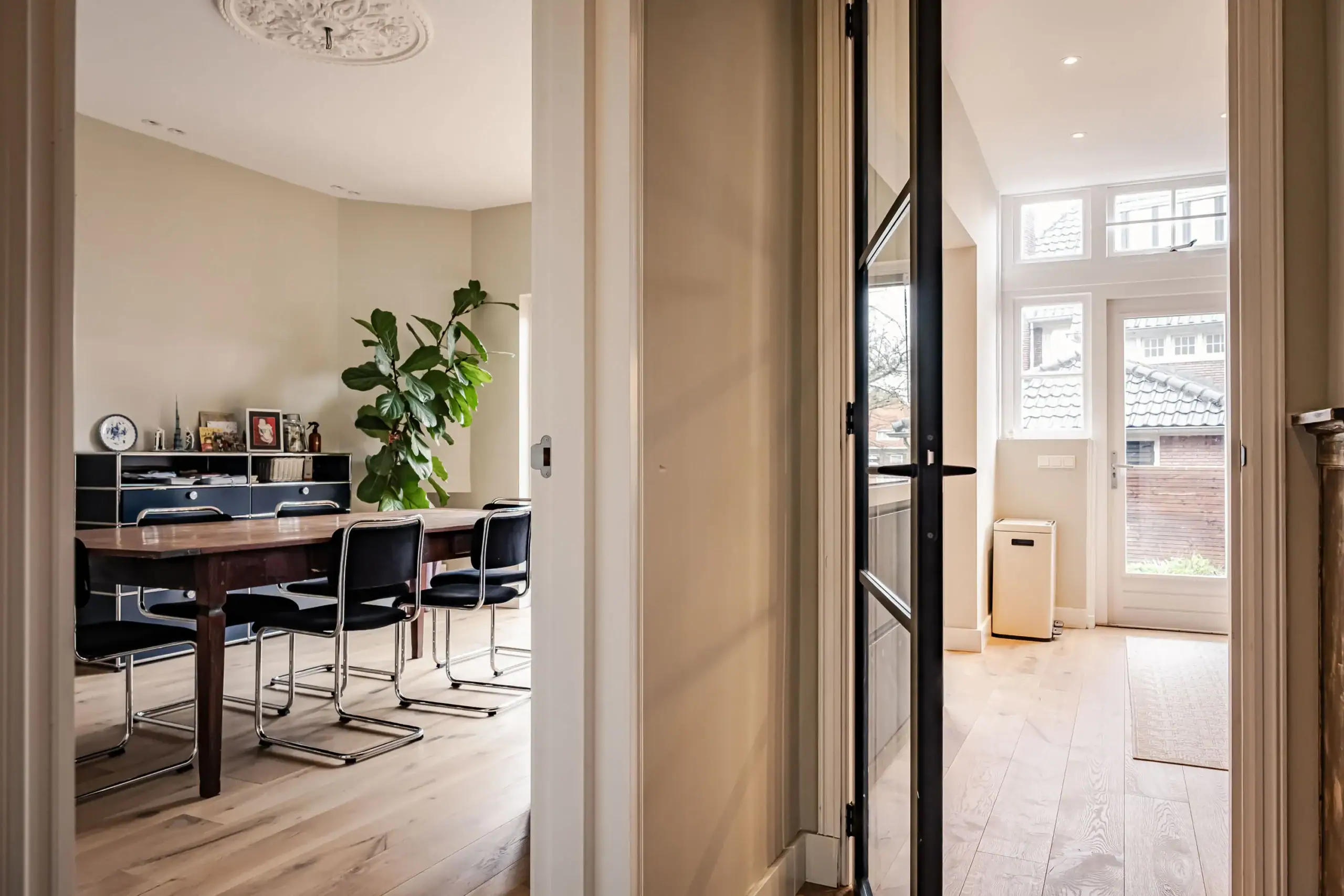 De living is royaal en elegant, met een lengte van circa 11 meter en een breedte van ongeveer 4 meter. Aan de voorzijde bevindt zich de sfeervolle zithoek met erker, glas-in-loodramen en marmeren vensterbanken. De ruimte is strak afgewerkt met gestucte wanden en plafonds en een klassieke plafondrozet. Op de vloer ligt een lichte eikenhouten vloer met comfortabele vloerverwarming. Aan de achterzijde van de woning bevindt zich de ruime eethoek, die naadloos overgaat in de moderne open keuken.