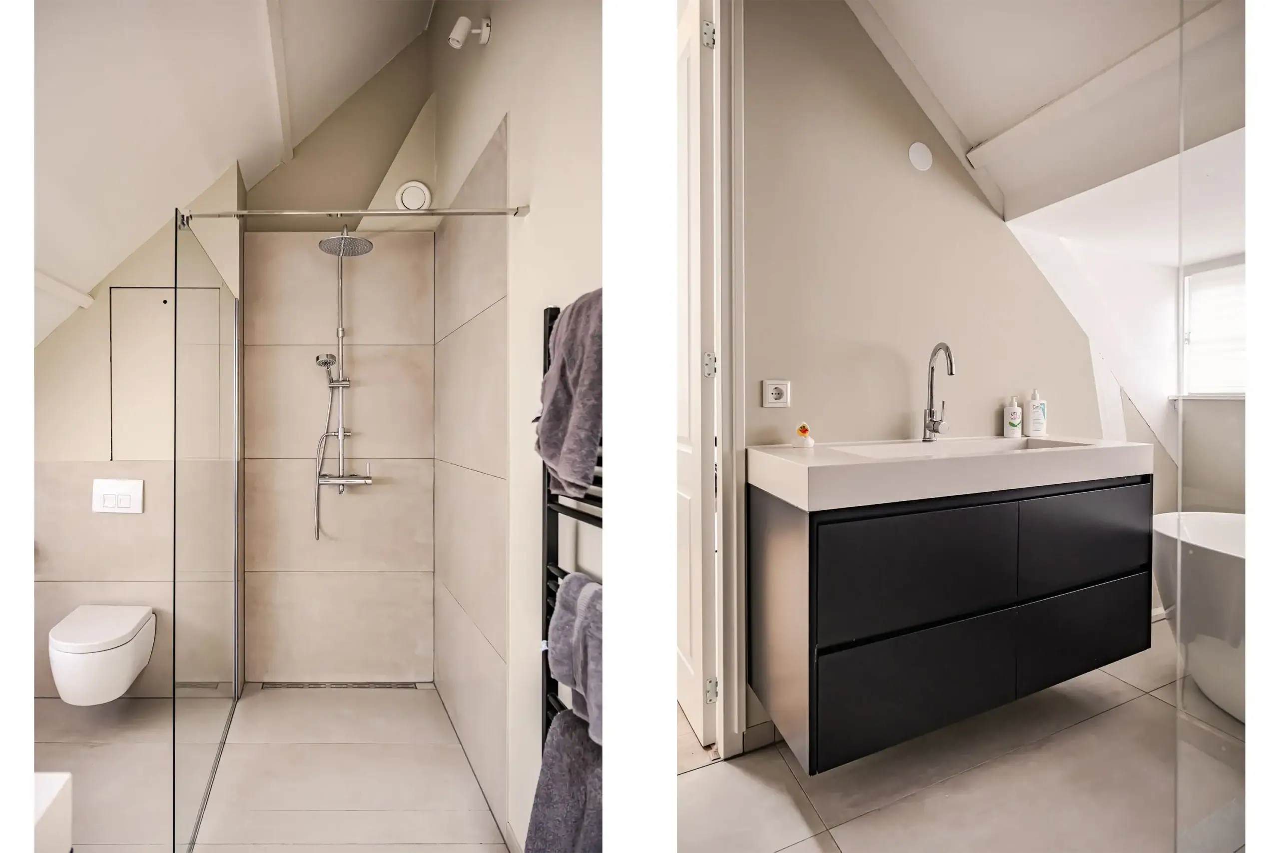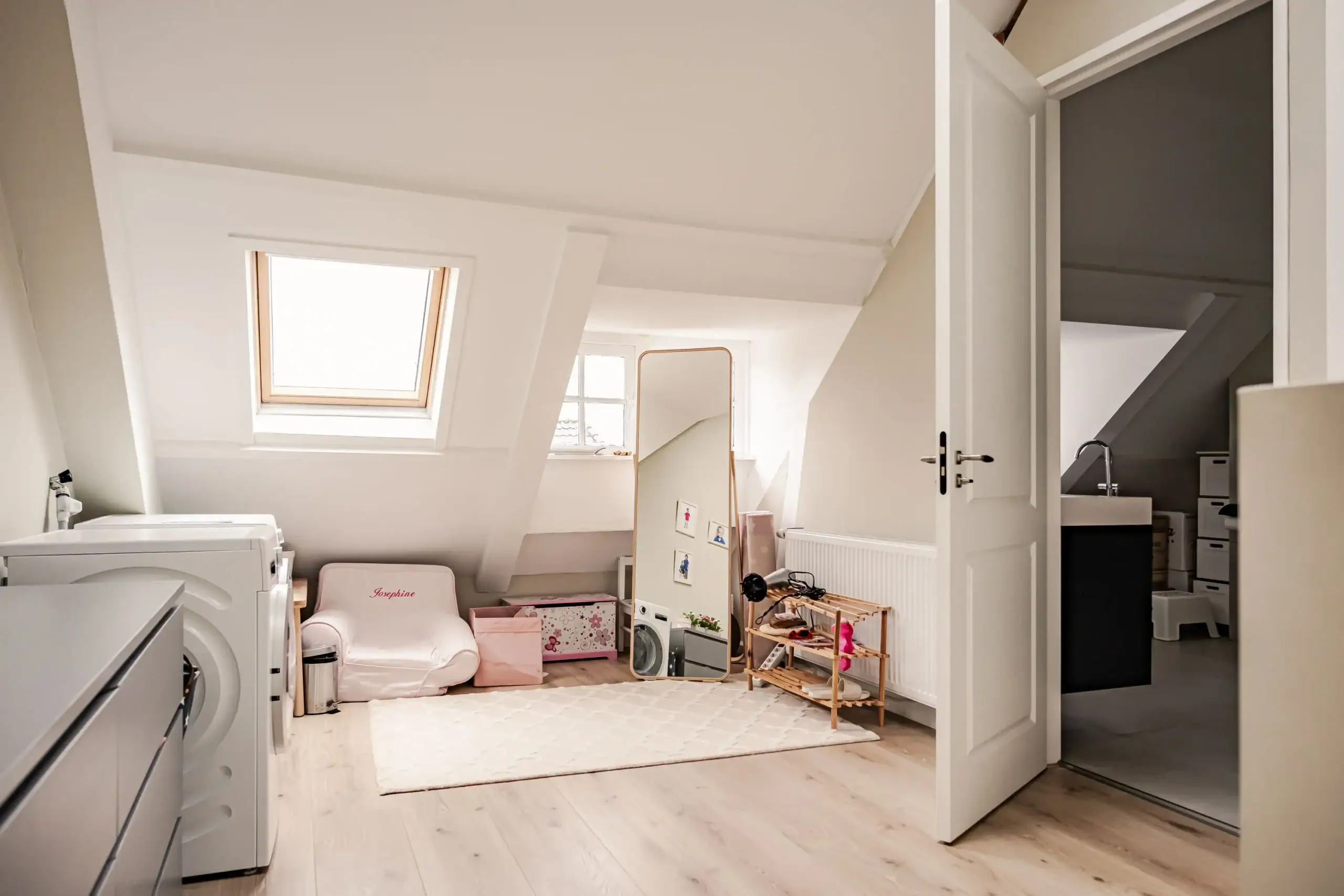 Overloop / multifunctionele ruimte met opstelling voor wasmachine en droger, tevens geschikt als werkruimte. Twee slaapkamers met originele dakkapellen met roedeverdeling. Badkamer met vloerverwarming, vrijstaand ligbad met vrijstaande kraan, inloopdouche met stort- en handdouche en derde toilet. Hoge plafonds tot in de nok (circa 4.5 meter).