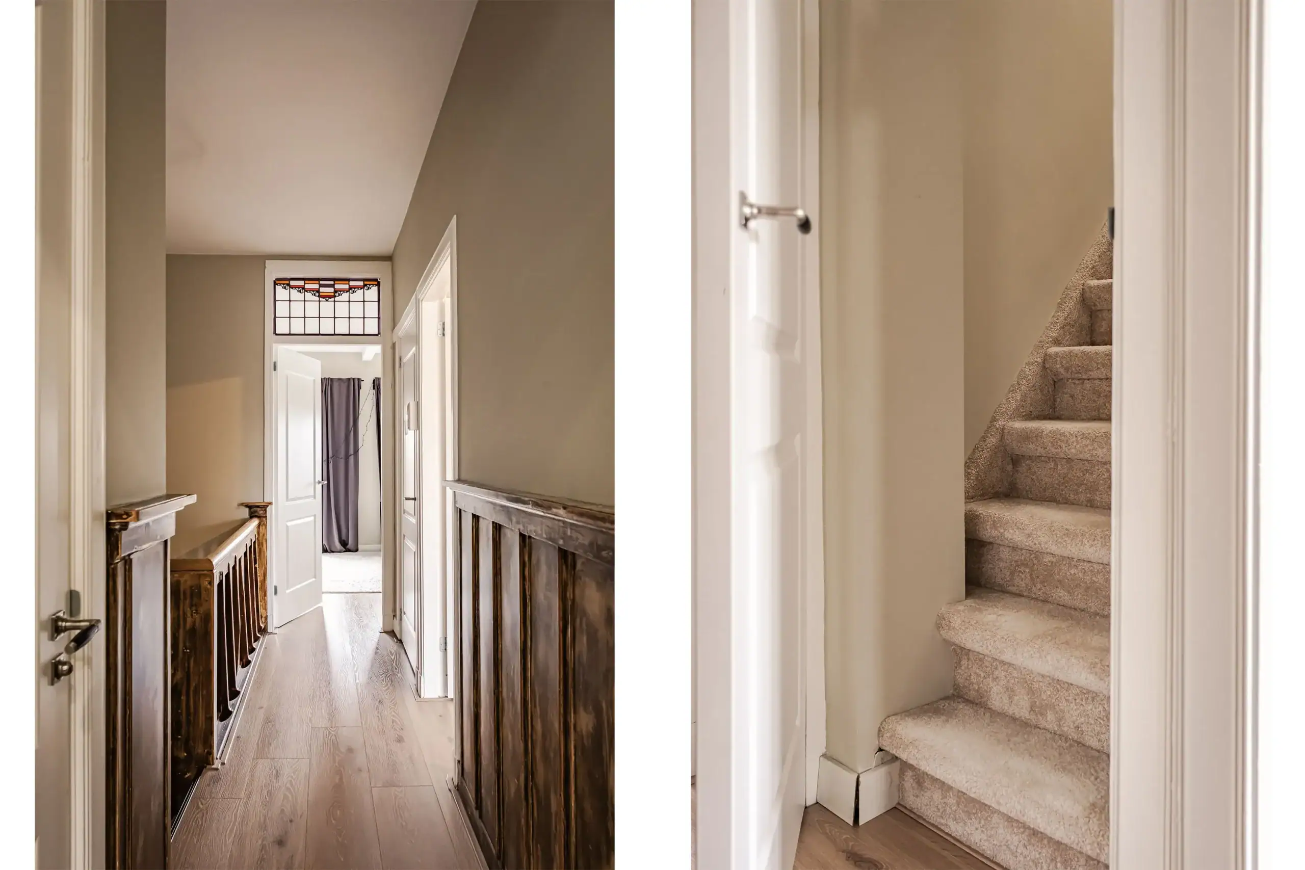 Bij binnenkomst ervaar je direct de charme van het huis. De authentieke vestibule met originele vloer- en wandtegels, glas-in-lood en klassieke details vormt een prachtige entree. Vanuit hier kom je in de royale hal met een imposante trapopgang. Het originele houtwerk is recent zorgvuldig kaal gehaald en opnieuw gebeitst, waardoor het karakter van de woning prachtig behouden is gebleven.