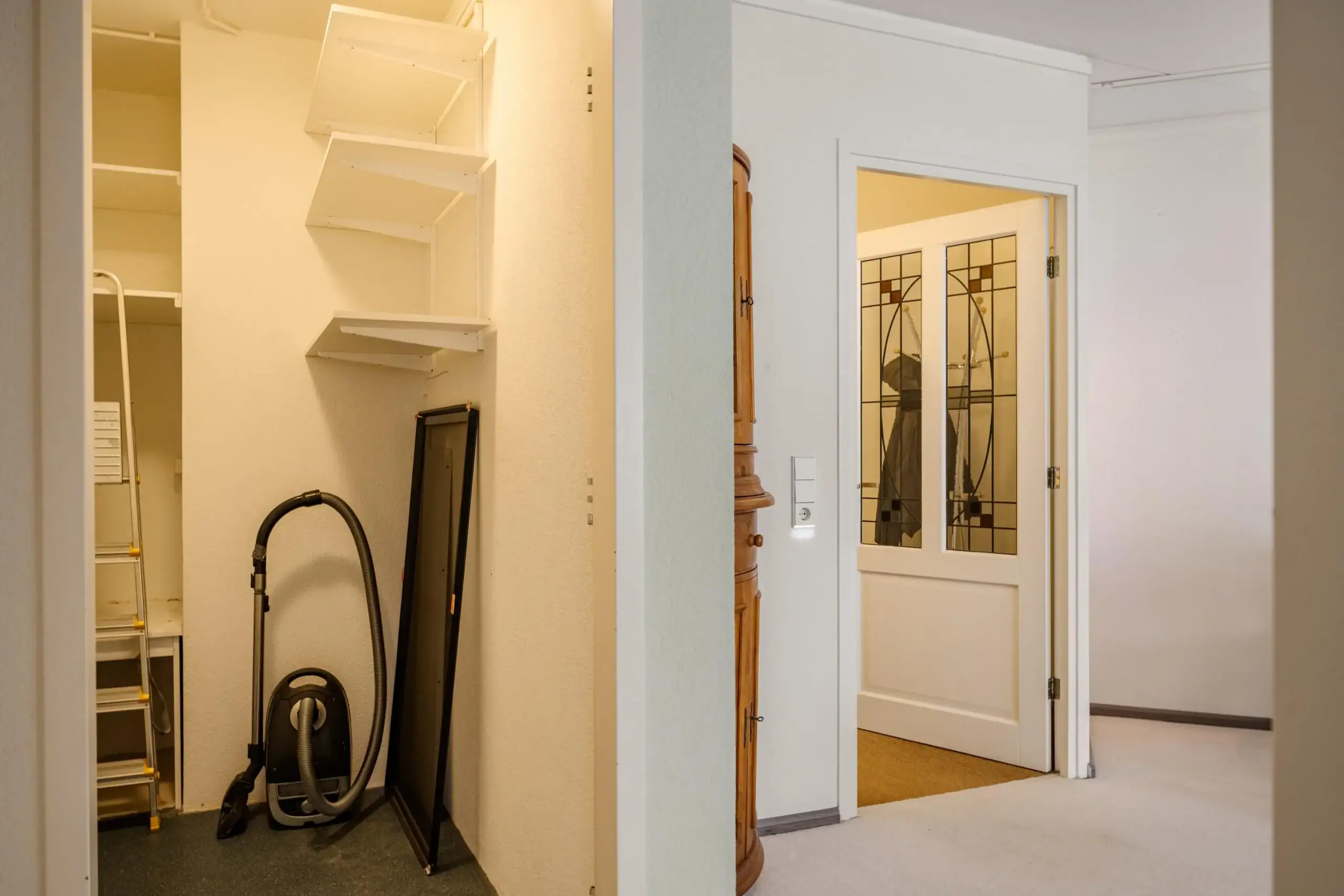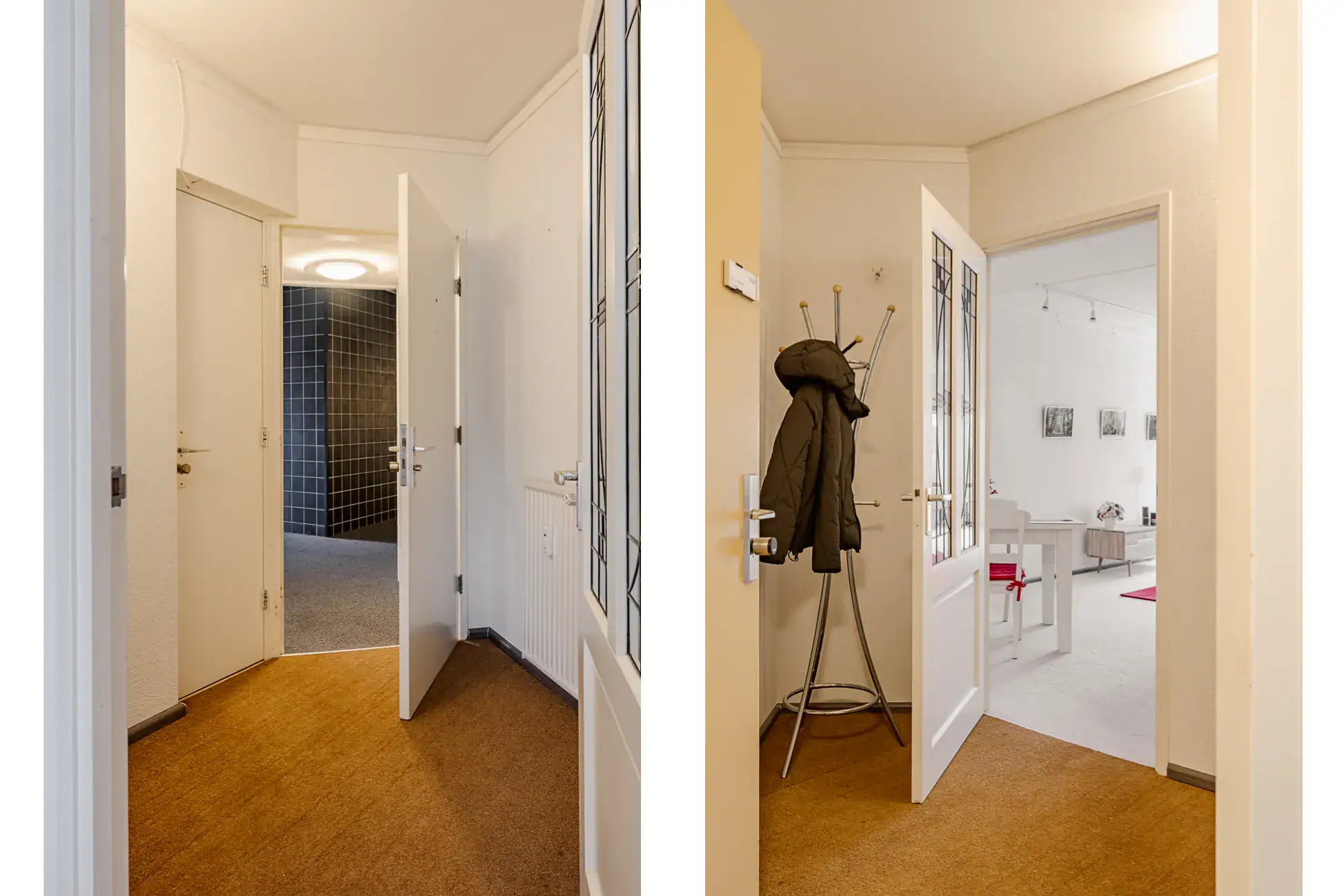 Een afgesloten entree met bellen- en brievenbus tableau, gemeenschappelijke ruime hal. Trappenhuis en lift.