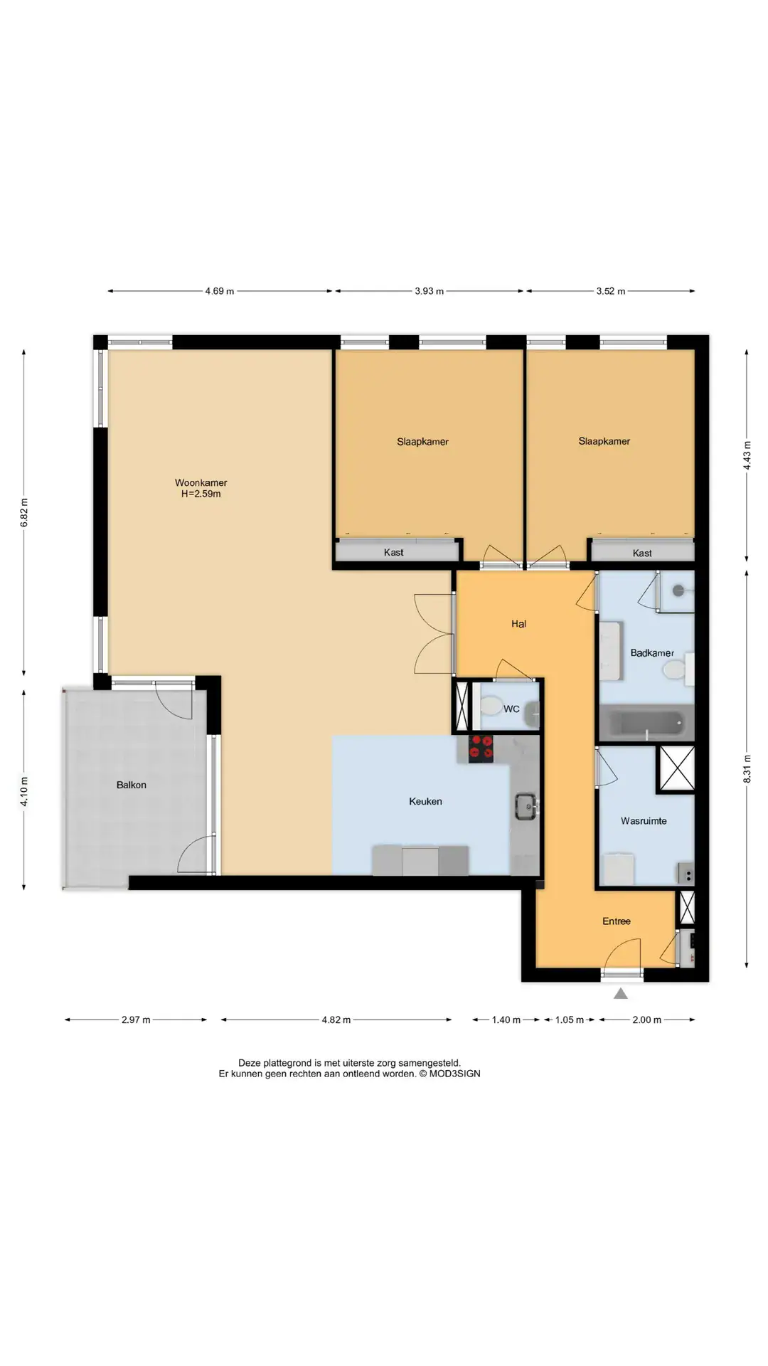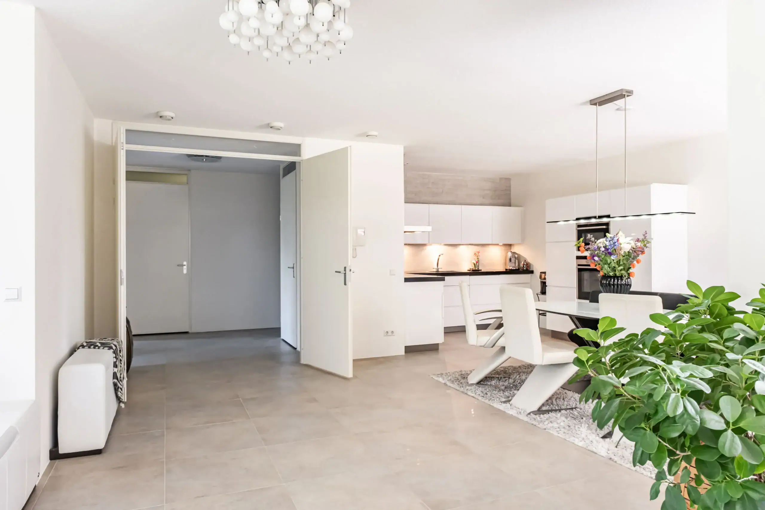 Entree, meterkast, garderobe en een lange hal die leidt naar de leefruimte. Riante woonkamer met een zithoek en aansluitend de eethoek. Hier is de moderne open keuken uitgerust met een combimagnetron-/oven, koelkast, vriezer, vaatwasser, 5-pits inductiekookplaat en een afzuigkap. Vanaf de eethoek en de zithoek is er via een enkele deur toegang tot het beschutte balkon. Er zijn twee ruime slaapkamers en een moderne badkamer met een douche, ligbad, wastafelmeubel, radiator en een toilet. Ruime berging met de cv-installatie, wasmachine- en drogeraansluiting, en een separaat toilet met fontein.
