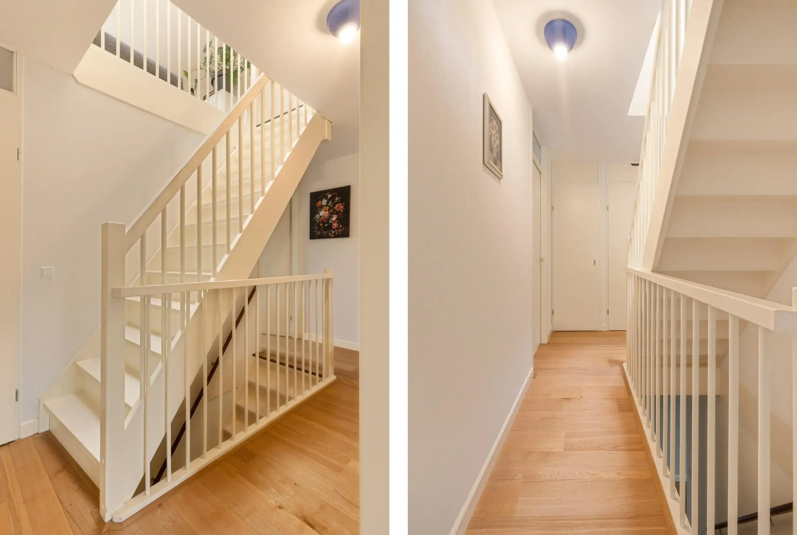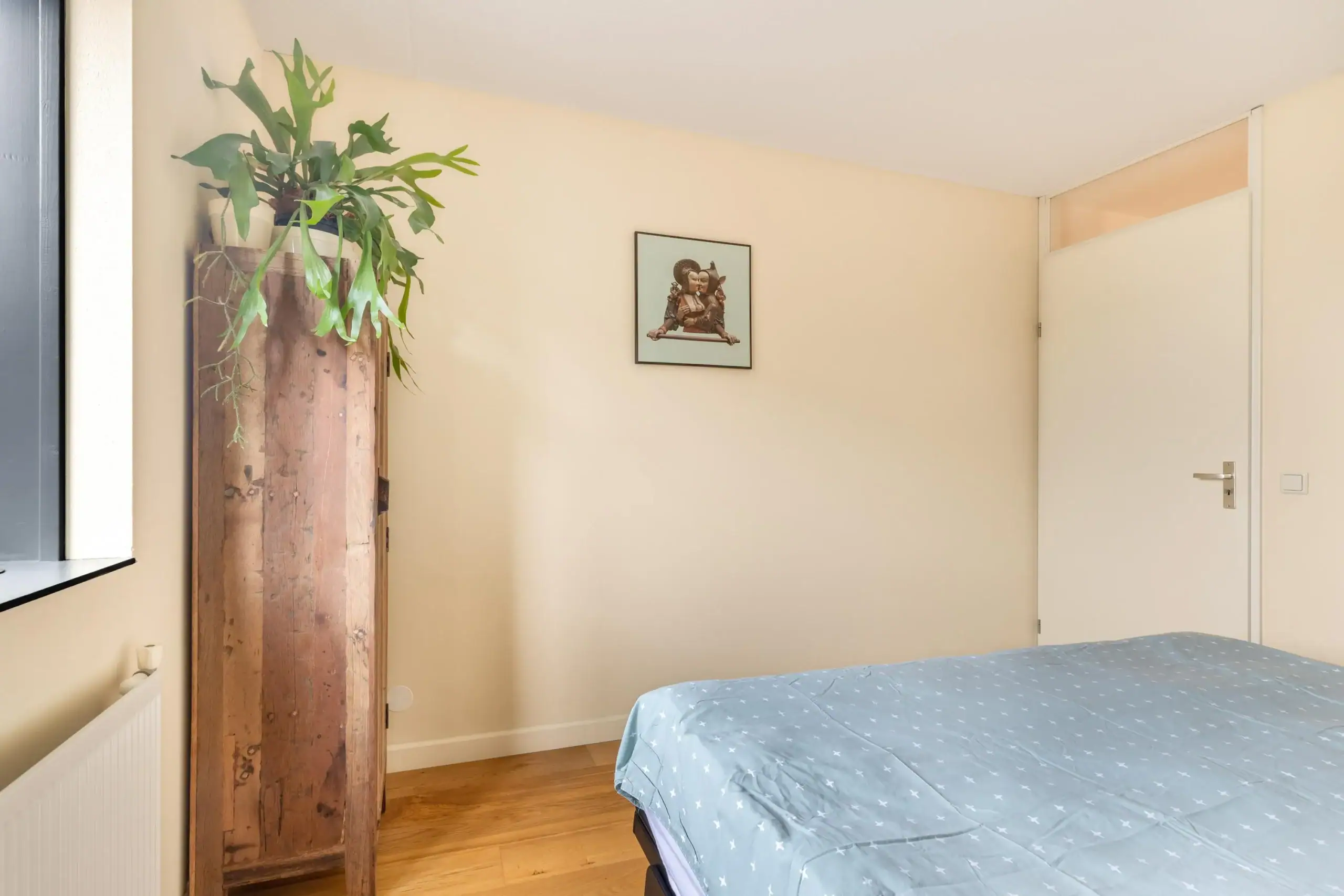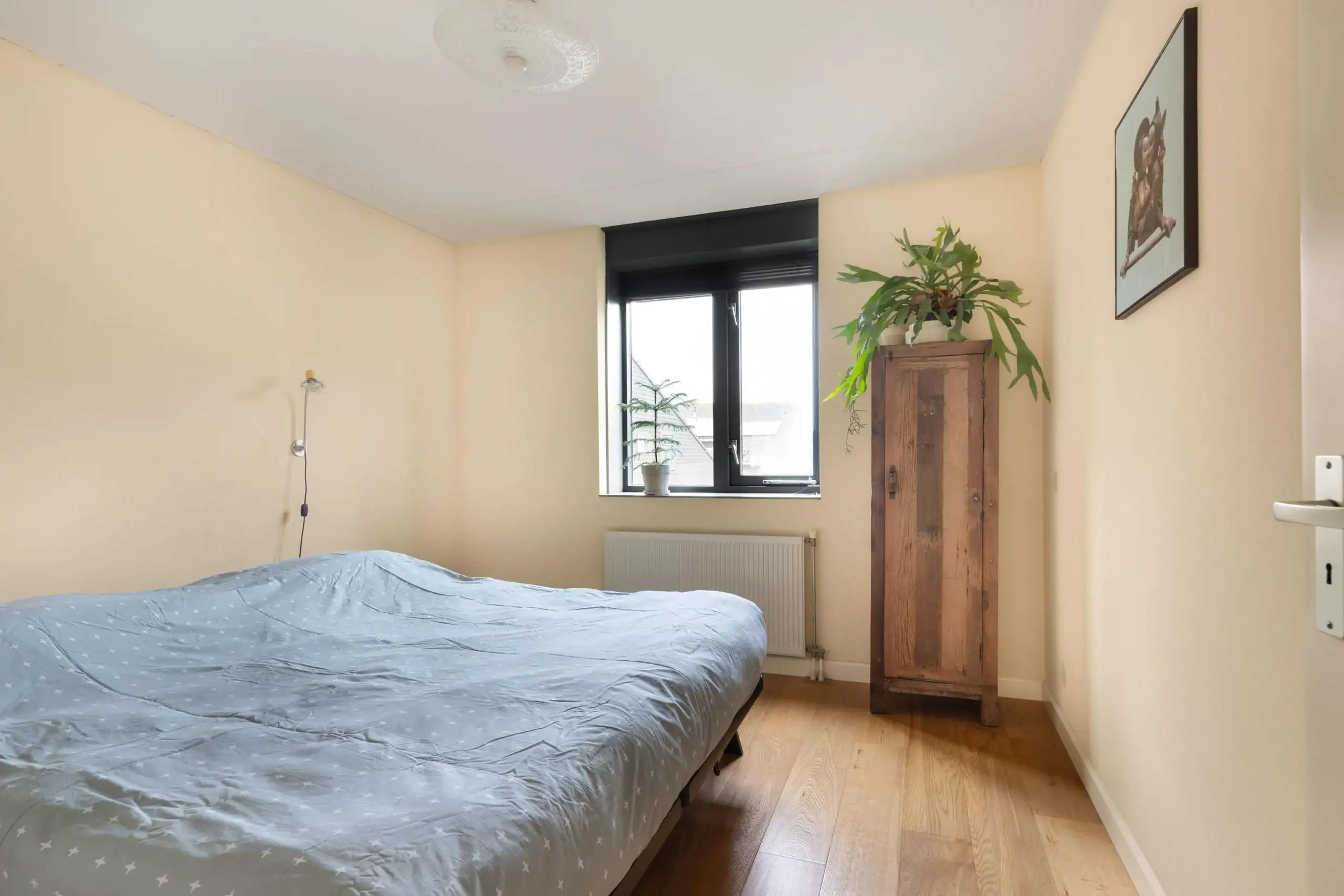 Ruime overloop met toegang tot twee slaapkamers, de badkamer en twee praktische bergkasten. Ook deze verdieping is afgewerkt met een mooie lamelparketvloer. De eerste slaapkamer bevindt zich aan de voorzijde en is een ruime kamer met een groot raam dat zorgt voor veel lichtinval. De tweede en tevens grootste slaapkamer ligt aan de achterzijde van de woning. De badkamer is voorzien van een toilet, wastafel en douche. Hier bevinden zich tevens de aansluitingen voor de wasmachine en droger. In één van de kasten op de overloop is de cv-ketel opgesteld.