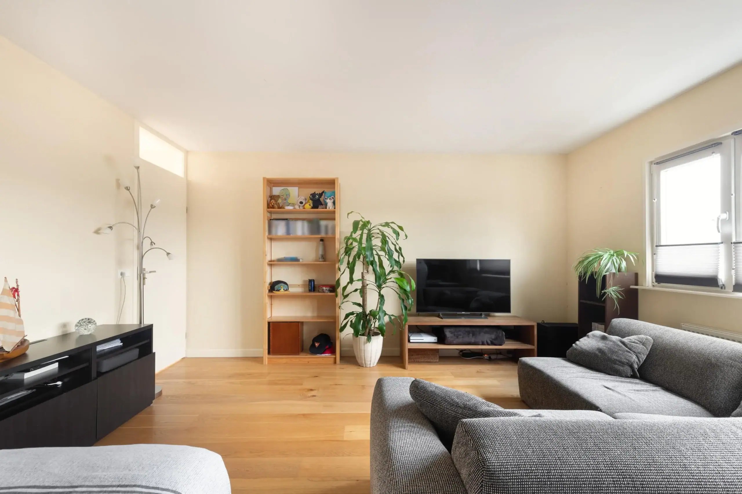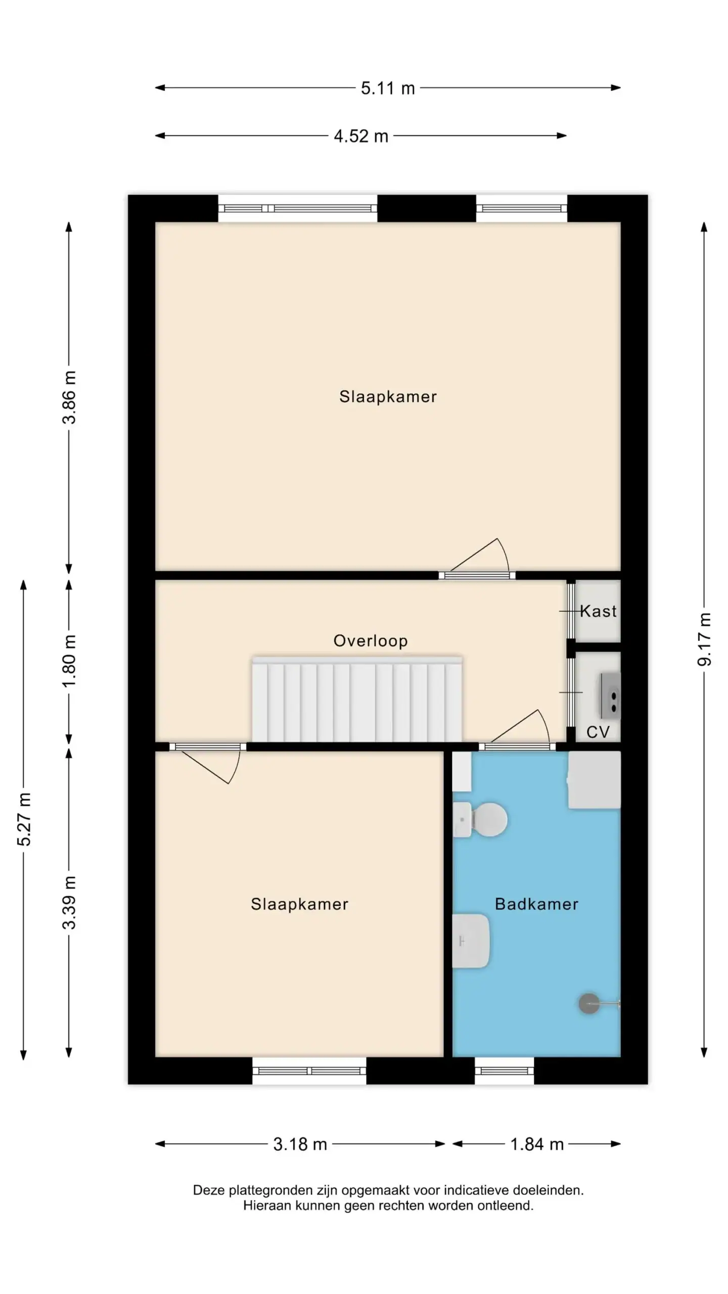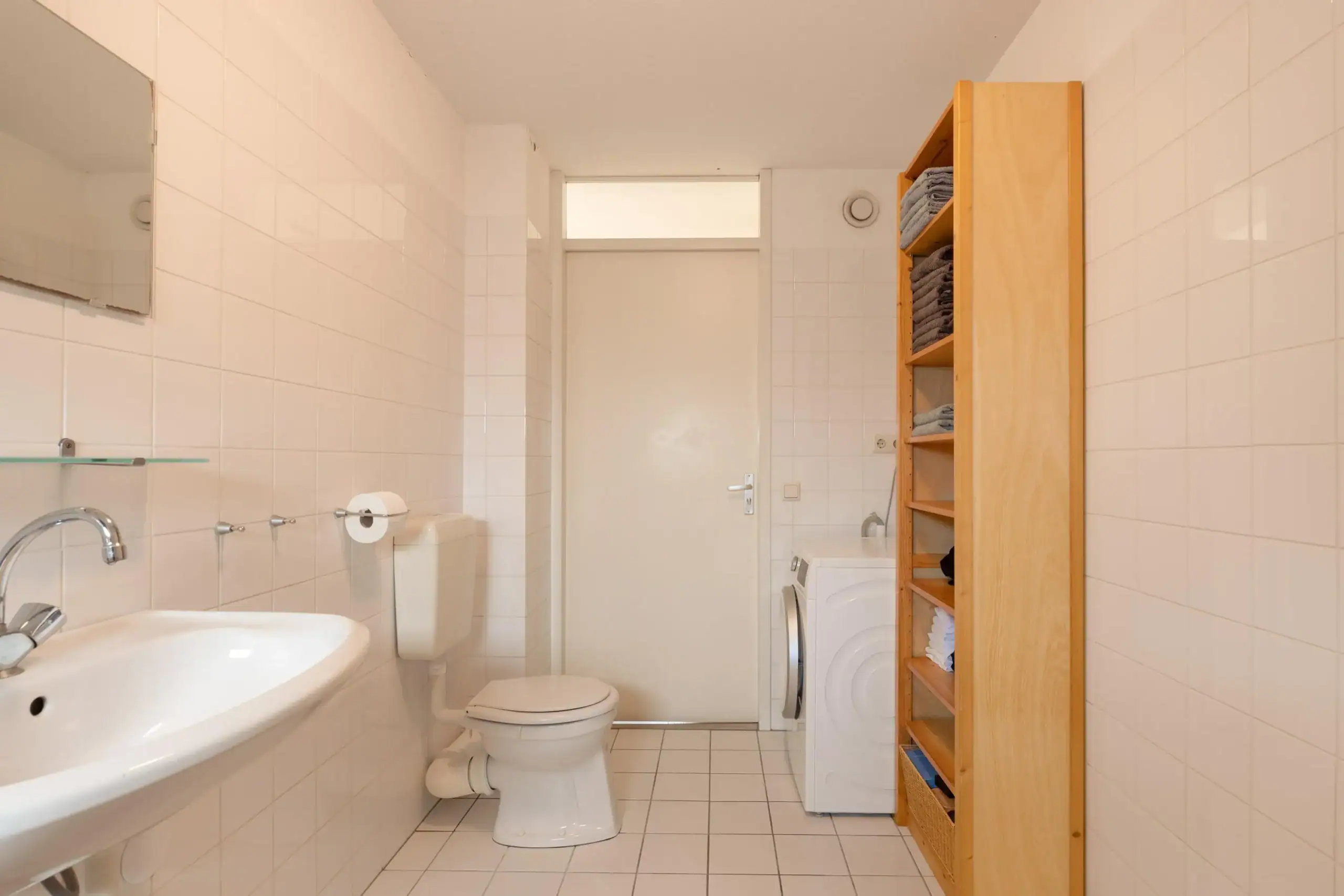 Ruime overloop met toegang tot twee slaapkamers, de badkamer en twee praktische bergkasten. Ook deze verdieping is afgewerkt met een mooie lamelparketvloer. De eerste slaapkamer bevindt zich aan de voorzijde en is een ruime kamer met een groot raam dat zorgt voor veel lichtinval. De tweede en tevens grootste slaapkamer ligt aan de achterzijde van de woning. De badkamer is voorzien van een toilet, wastafel en douche. Hier bevinden zich tevens de aansluitingen voor de wasmachine en droger. In één van de kasten op de overloop is de cv-ketel opgesteld.
