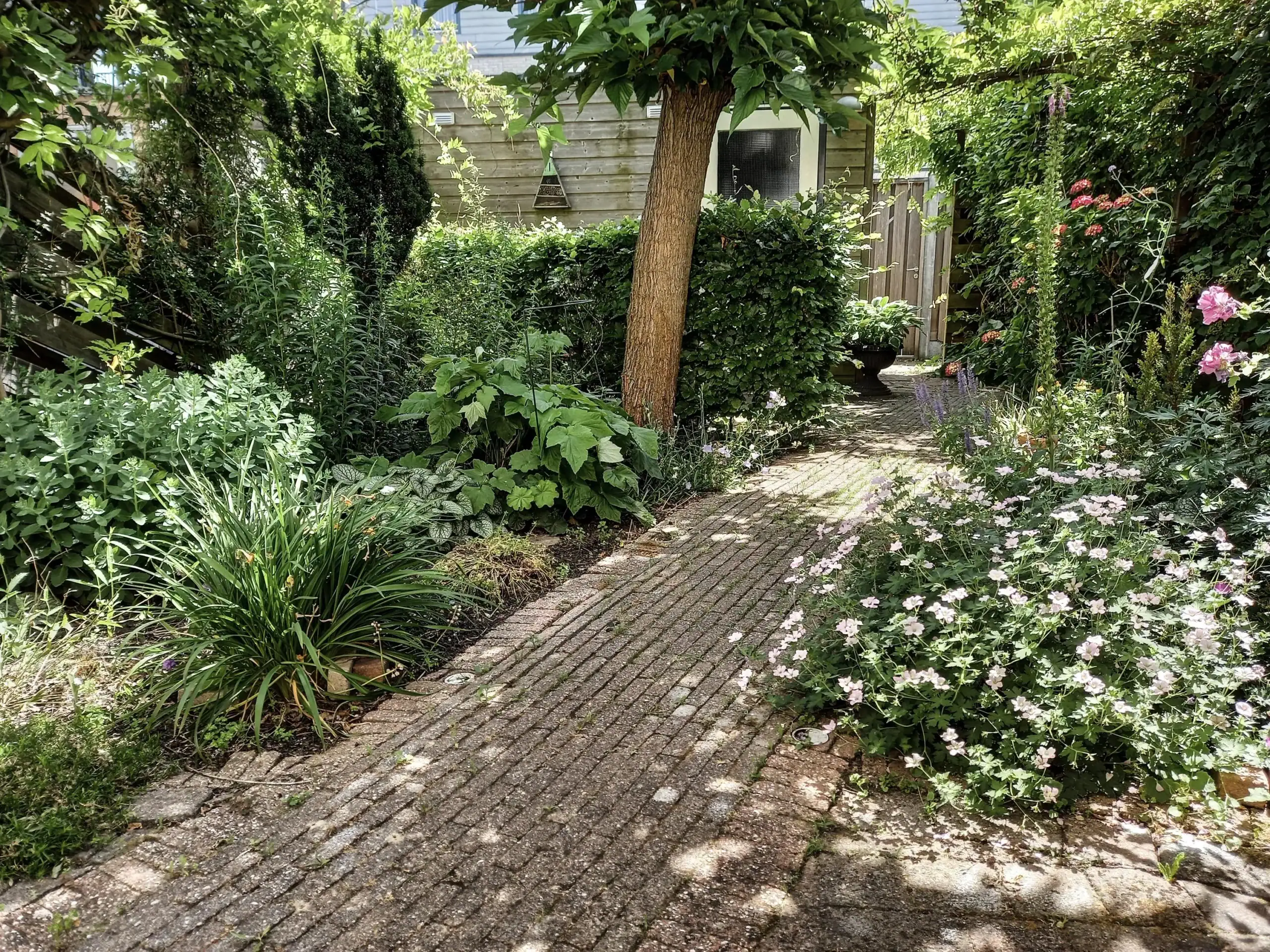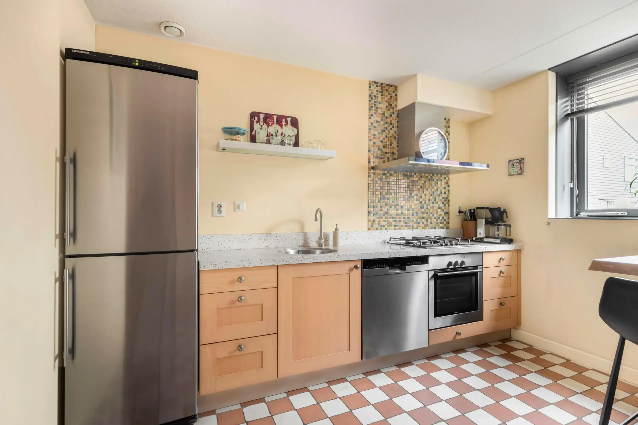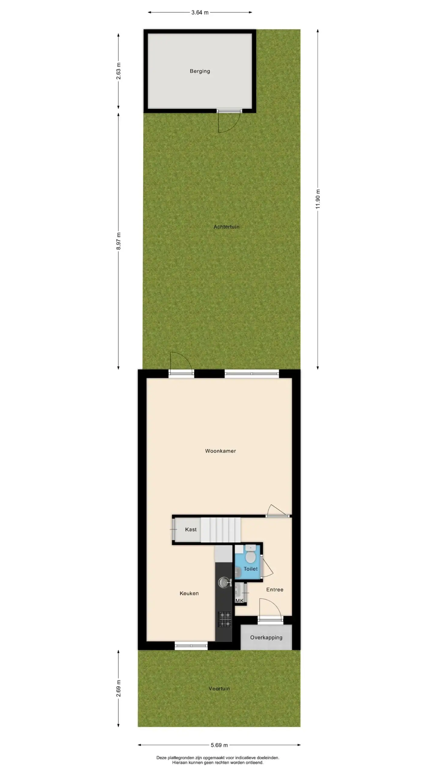 Entree, hal met garderobe, meterkast en toilet met fonteintje. De woonkamer is voorzien van een fraaie parketvloer en beschikt over een deur en een groot raam met uitzicht op de tuin, wat zorgt voor prettig daglicht. Aan de voorzijde van de woning bevindt zich de keuken. Deze is uitgerust met een 4-pits gasfornuis, afzuigkap, oven, vaatwasser, koelkast en vriezer. De achtertuin heeft een gunstige ligging op het zuidoosten en is rijk aan groen. Daarnaast beschikt de tuin over een gezellig terras, een praktische berging en een achterom.