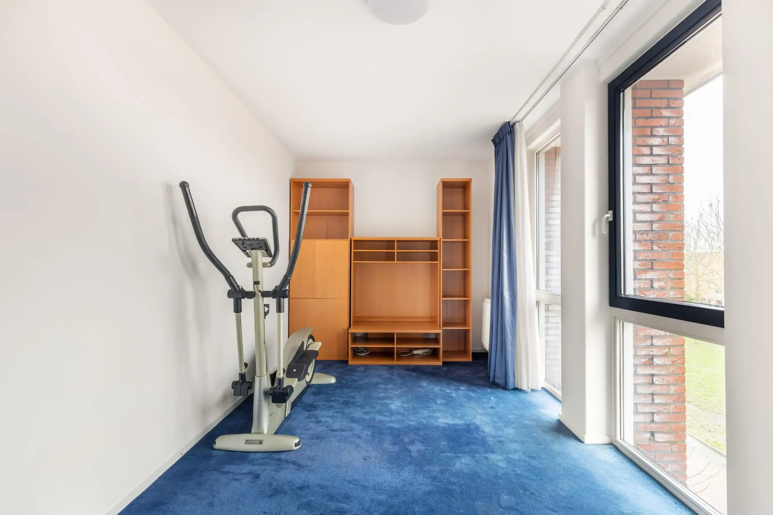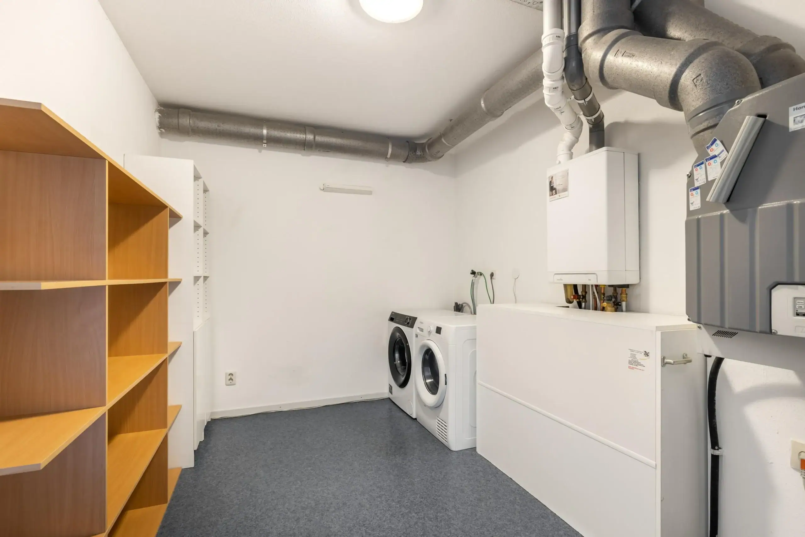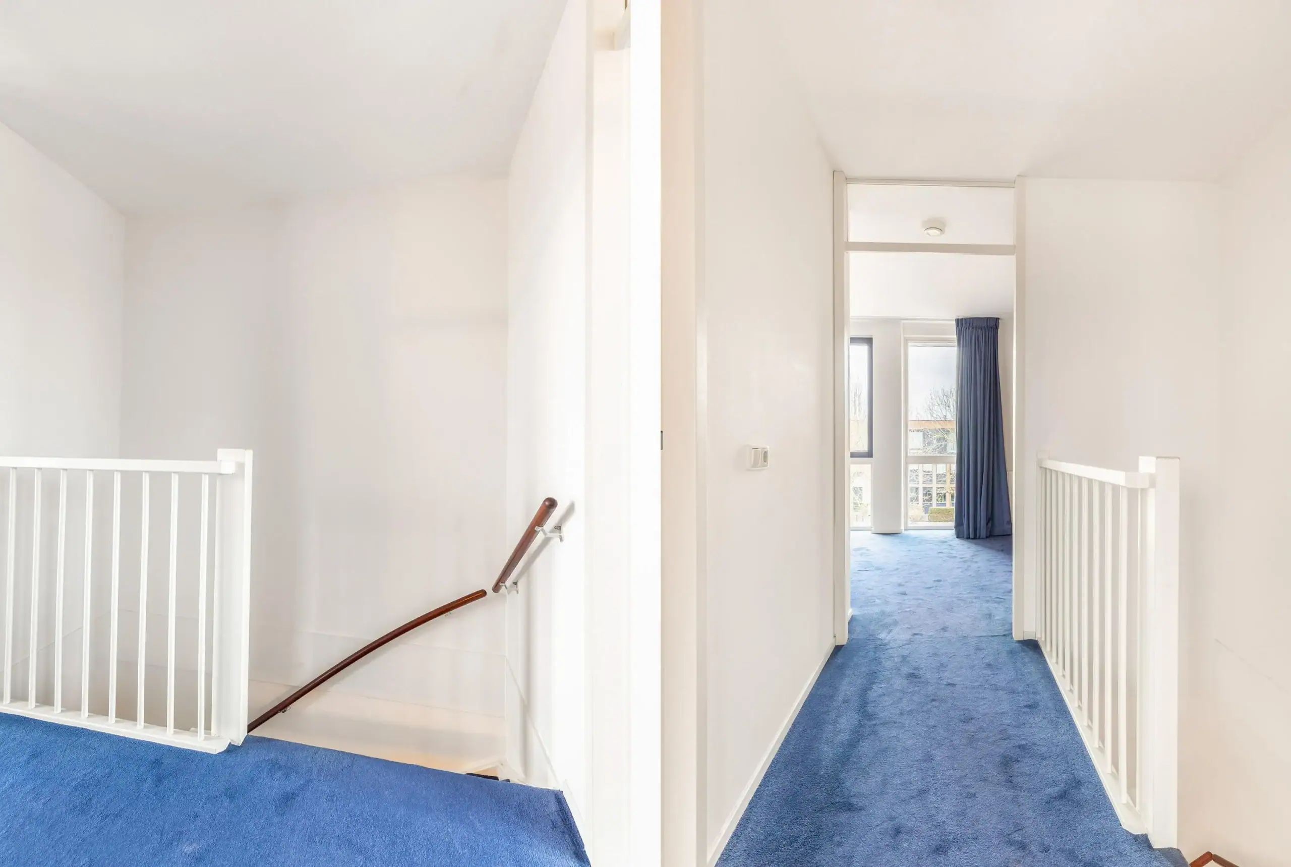 Overloop met toegang tot twee slaapkamers, met een vergelijkbare indeling als op de eerste verdieping. Tussen de slaapkamers bevindt zich de technische ruimte. Hier zijn de aansluitingen voor de wasmachine en droger, evenals de opstelplaats van de cv-ketel en de WTW-unit. Daarnaast is er veel extra bergruimte aanwezig en voldoende plek voor het opstellen van de wasmachine en droger. Het is eventueel mogelijk om hier een tweede badkamer te realiseren.