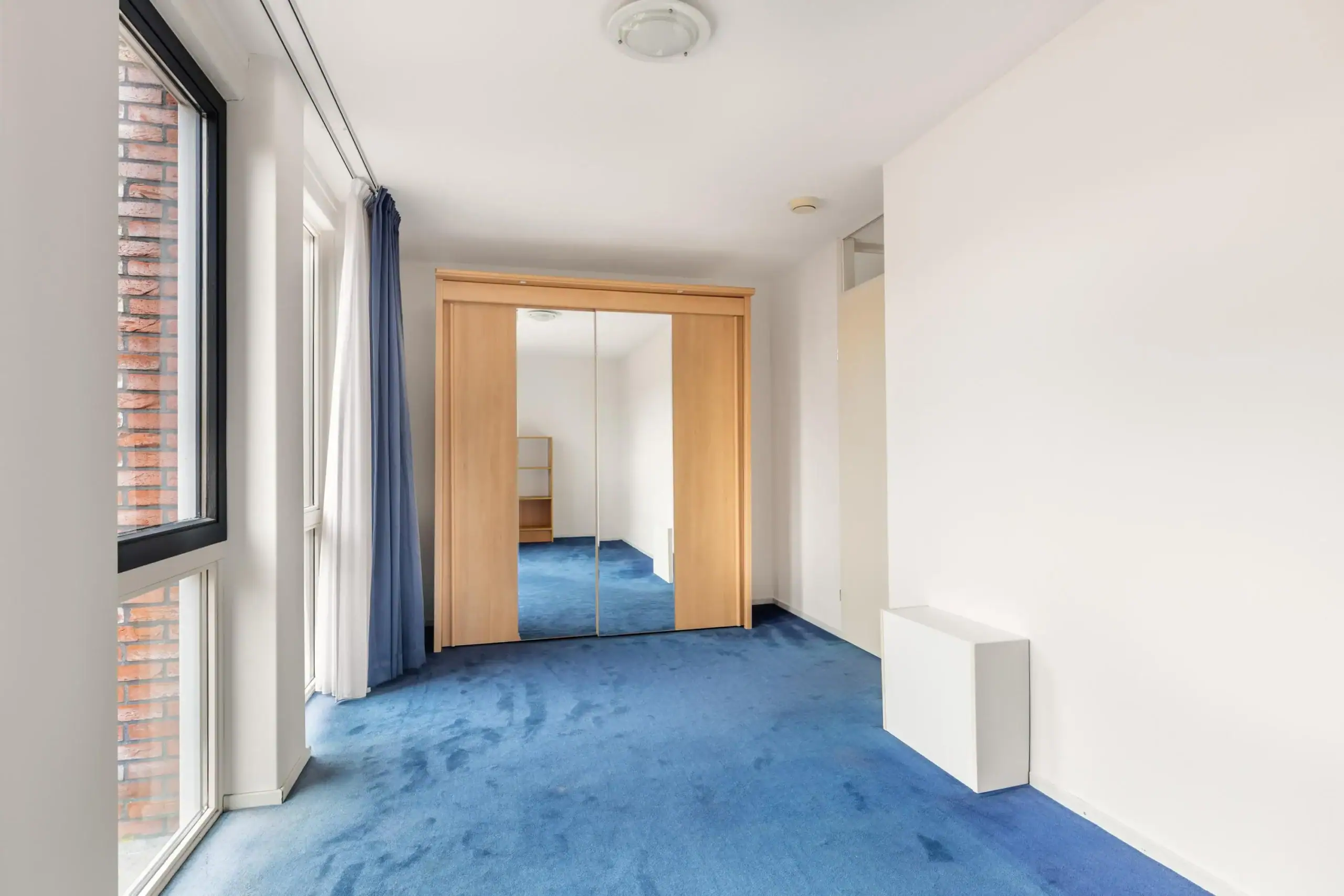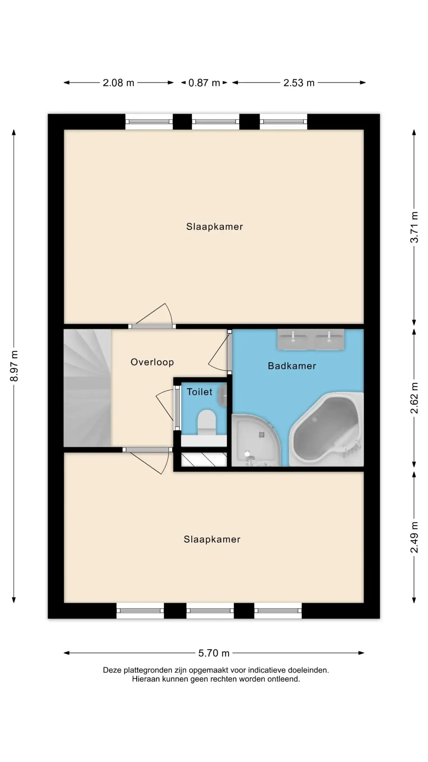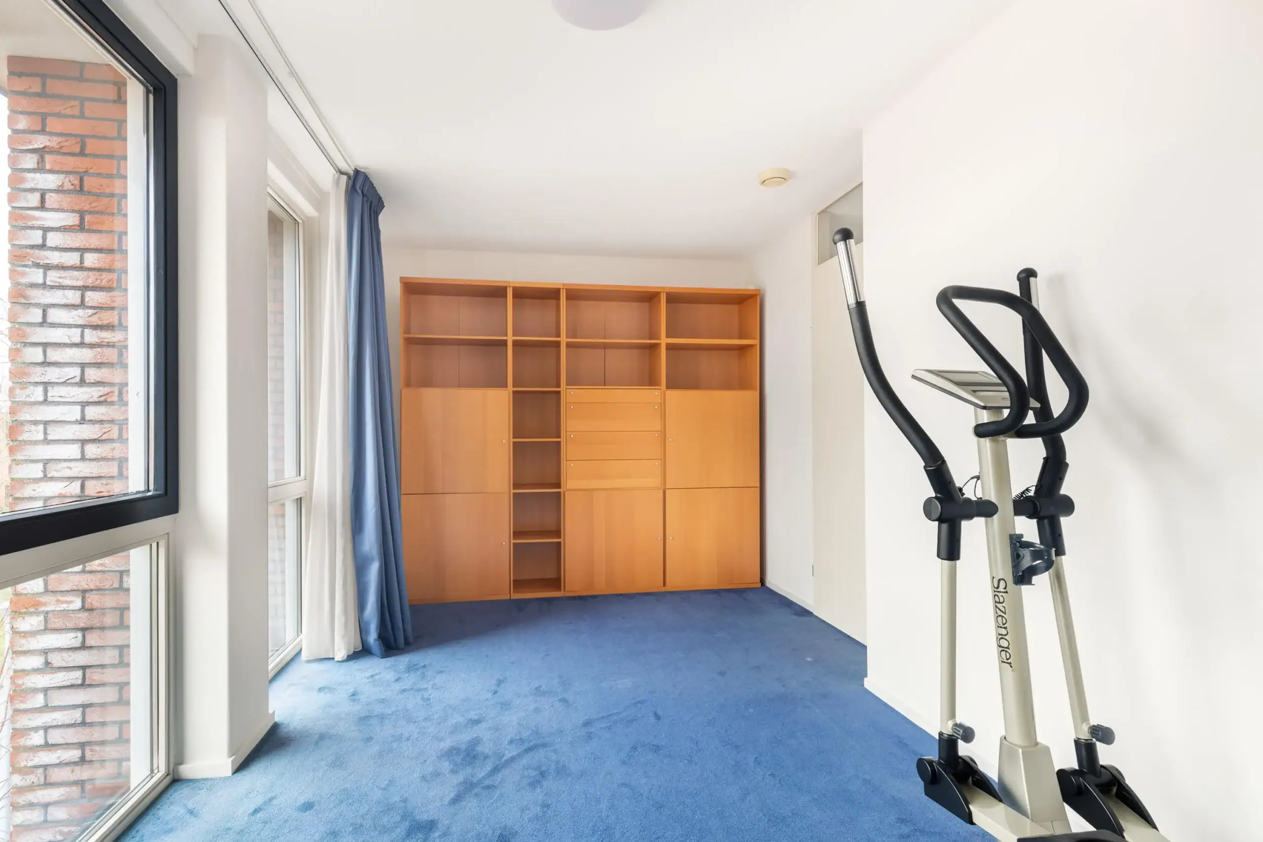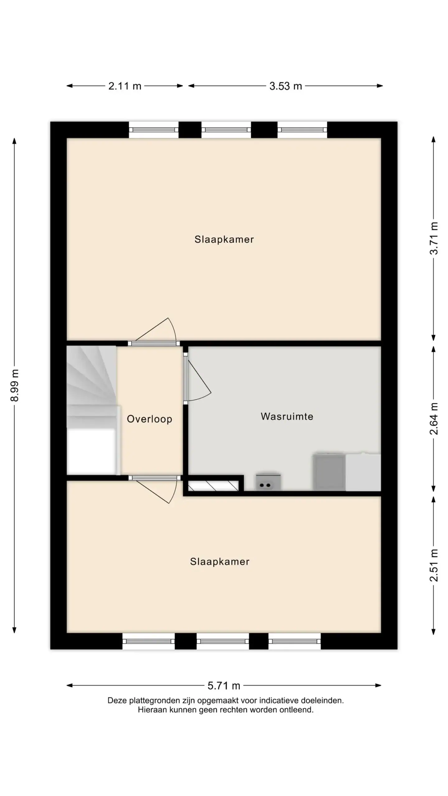Overloop met toegang tot twee slaapkamers, met een vergelijkbare indeling als op de eerste verdieping. Tussen de slaapkamers bevindt zich de technische ruimte. Hier zijn de aansluitingen voor de wasmachine en droger, evenals de opstelplaats van de cv-ketel en de WTW-unit. Daarnaast is er veel extra bergruimte aanwezig en voldoende plek voor het opstellen van de wasmachine en droger. Het is eventueel mogelijk om hier een tweede badkamer te realiseren.