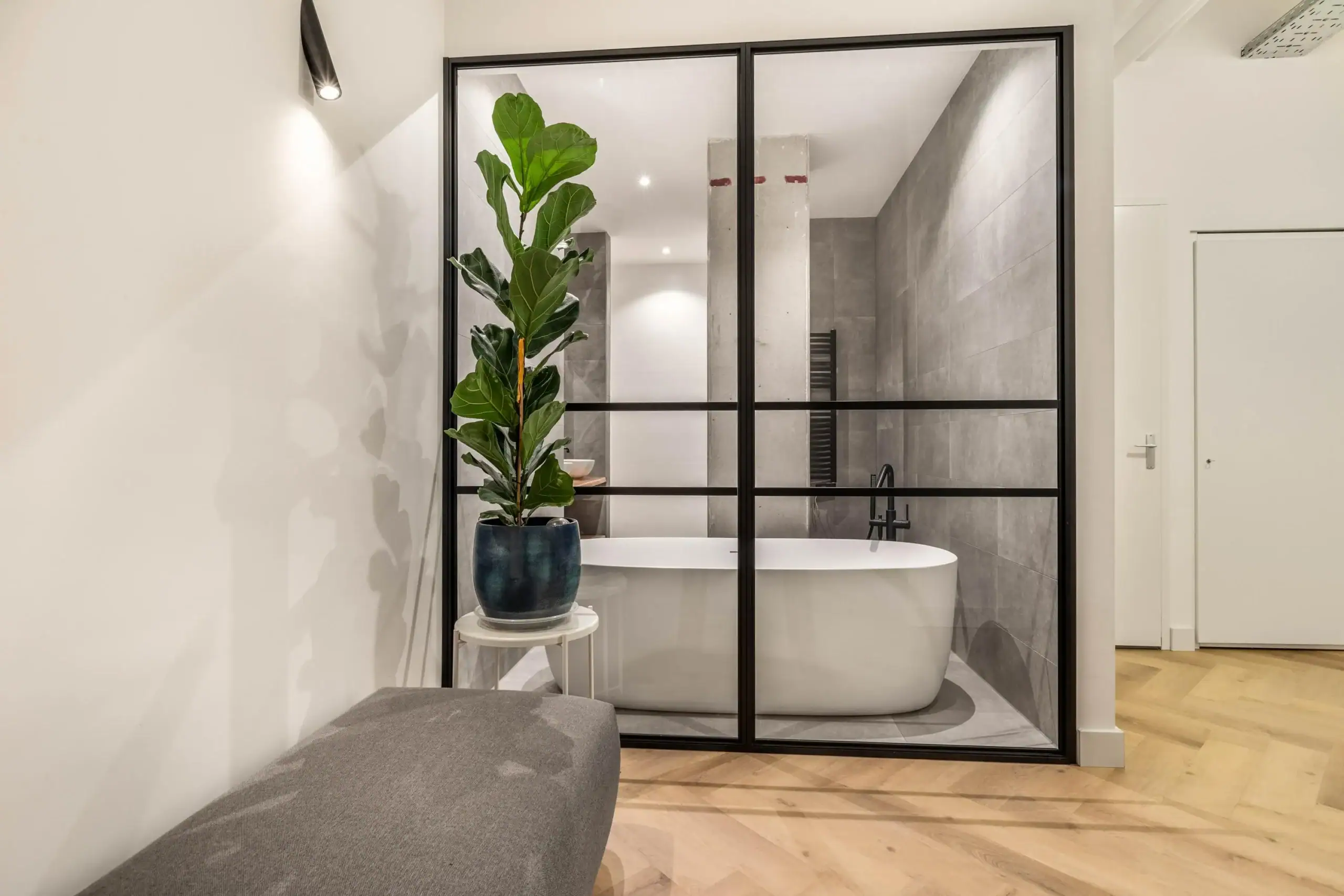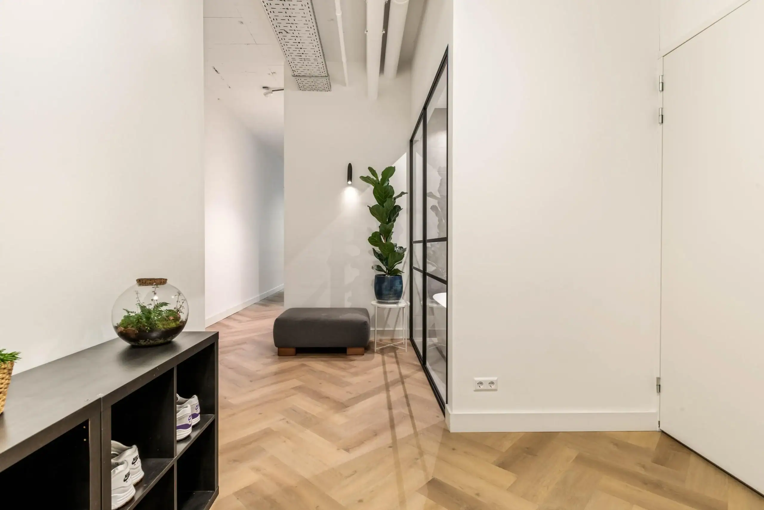 Entree. Ruime hal met videofoon. Toilet met fontein. Berging met wasmachine- en drogeraansluiting. Luxe badkamer met inloopdouche, bubbelbad, dubbele wastafel, handoekradiator. Open keuken voorzien van Quooker kraan, extra hoge combi oven met stoomfunctie, koelkast, vriezer, vaatwasser, inductiekookplaat met geïntegreerde afzuiging. Royale woonkamer met veel ramen van vloer tot plafond met draai-/kiepramen. Ruimte voor werkhoek. Ruime slaapkamer. Veel bergruimte en vast kasten.